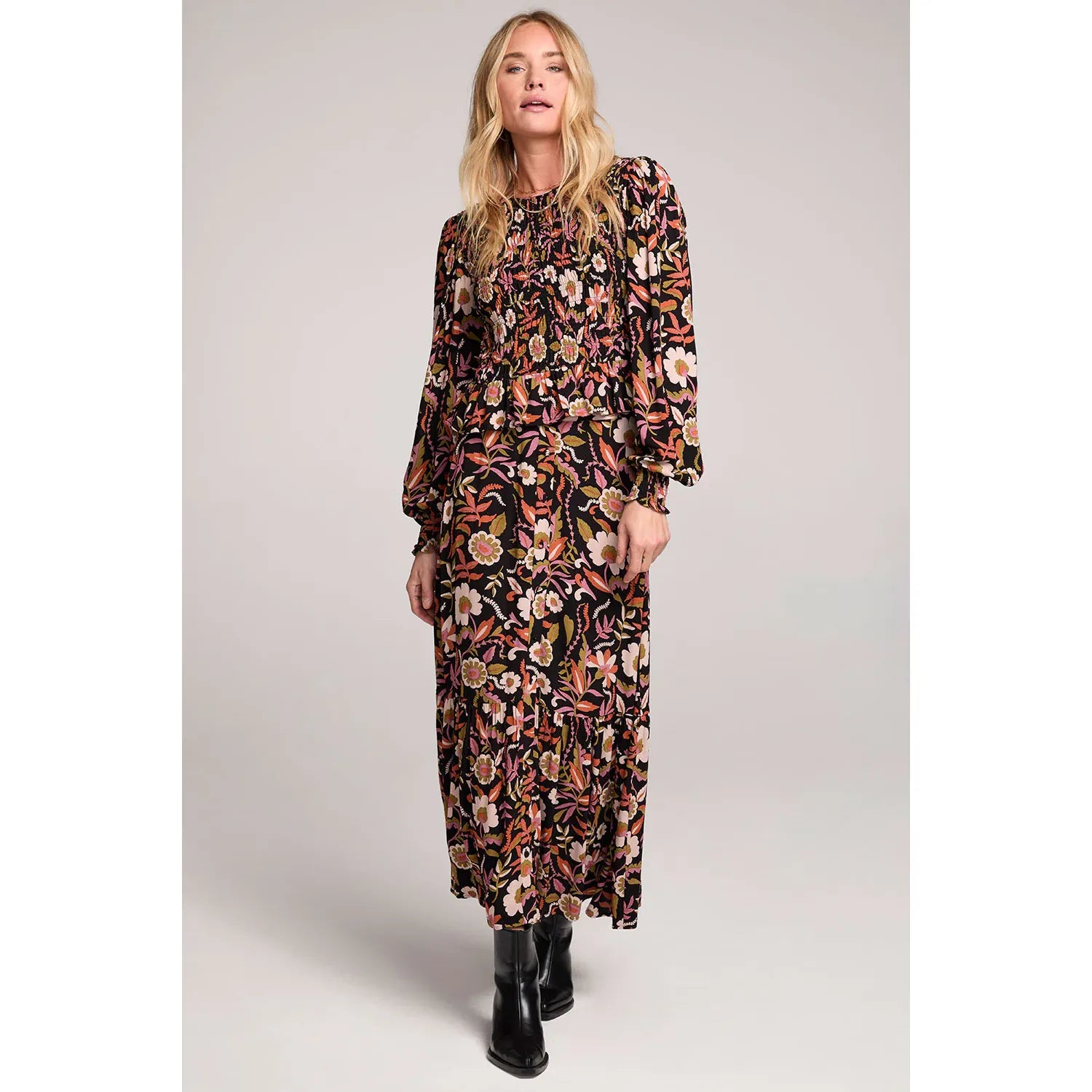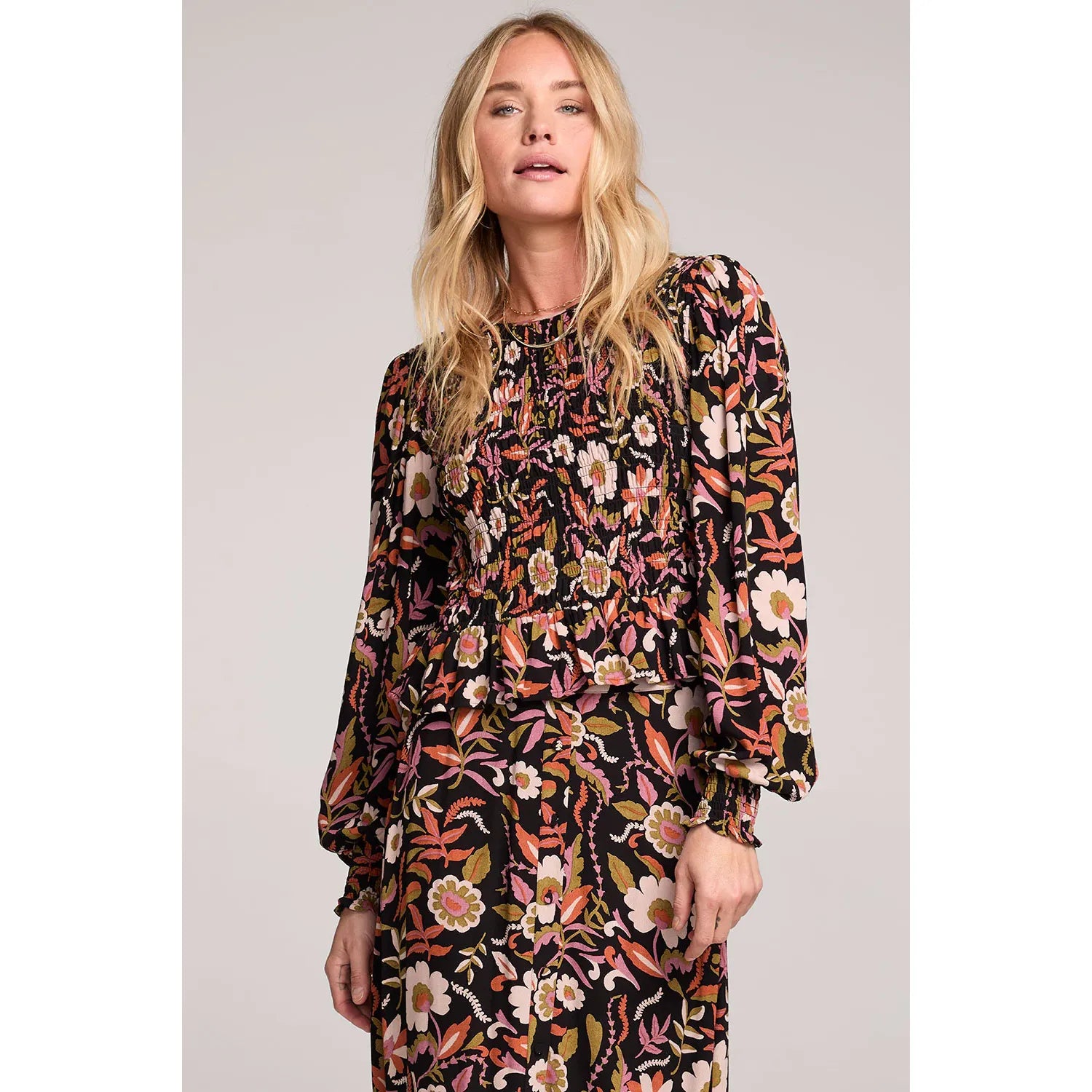 The Brielle Top showcases a lush blooming oversized floral pattern paired with simple tailored details for a refined look.
