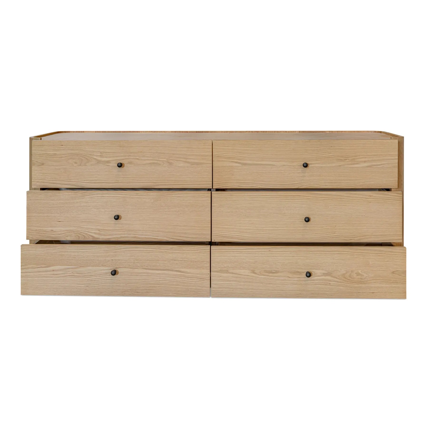 The Gibson 6 drawer dresser's fluid design seamlessly integrates the leg panel into the frame, creating a captivating visual flow. Crafted from solid oak with oak veneer, this piece marries durability with sophistication. Playful lip detailing and 6 soft-close drawers add unexpected charm with its timeless appeal and meticulous craftsmanship.