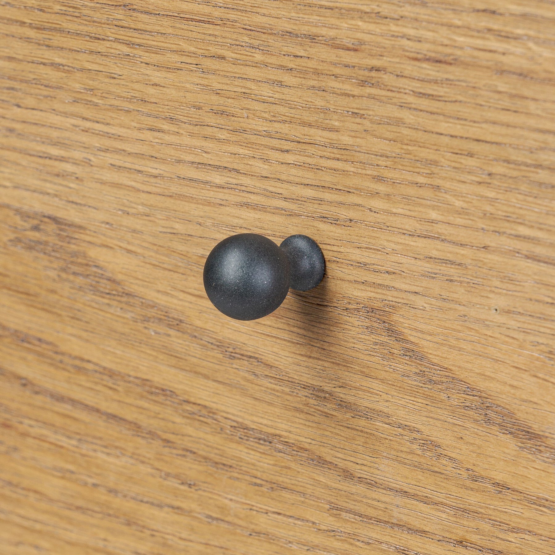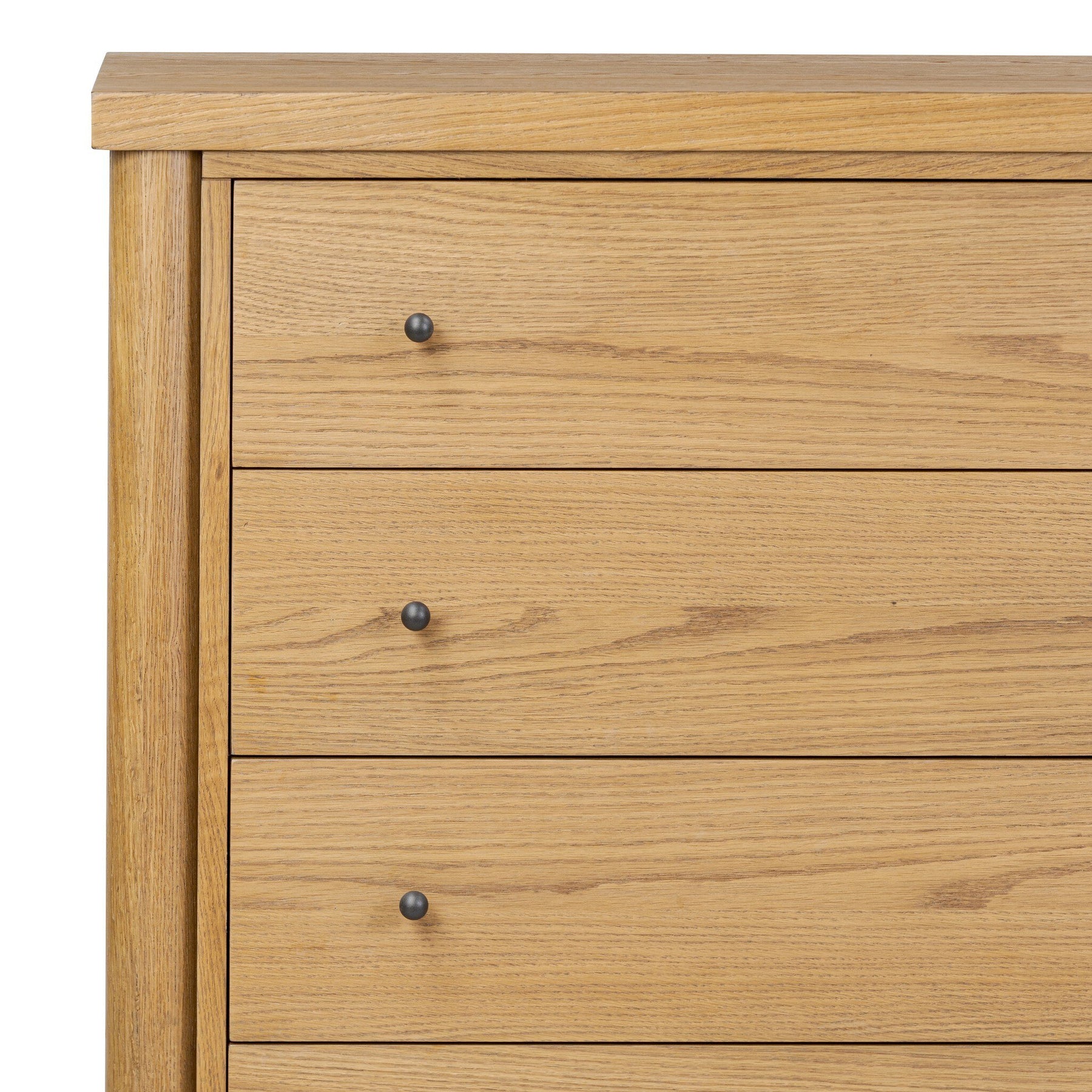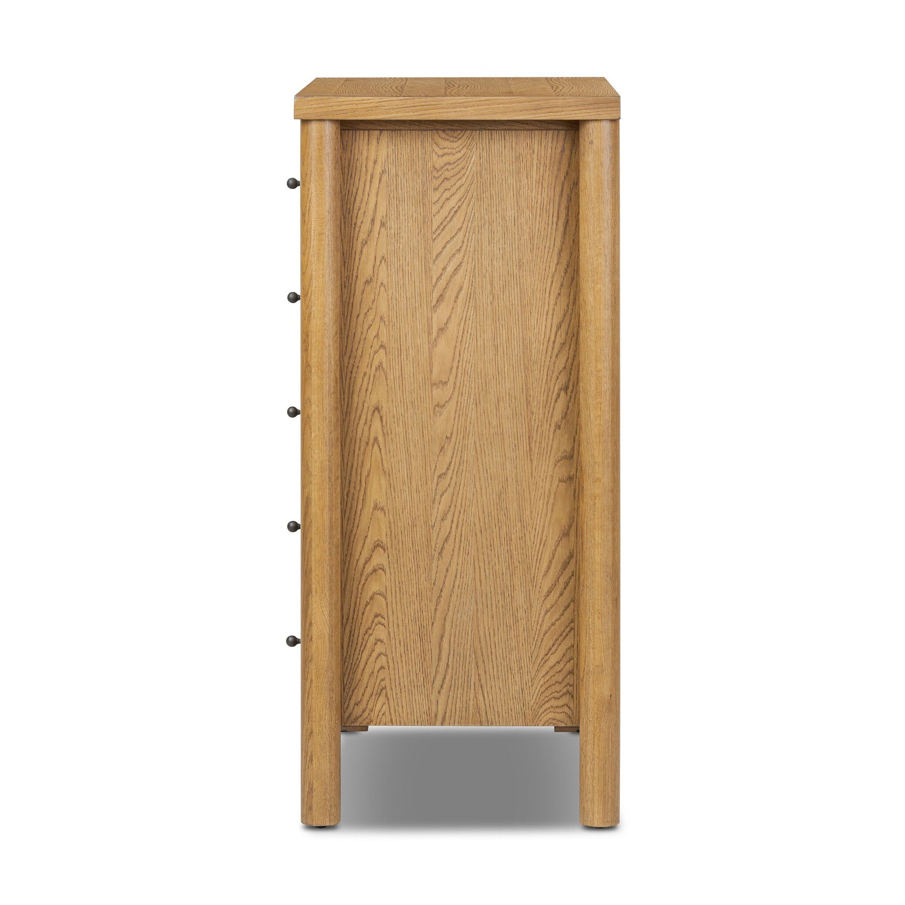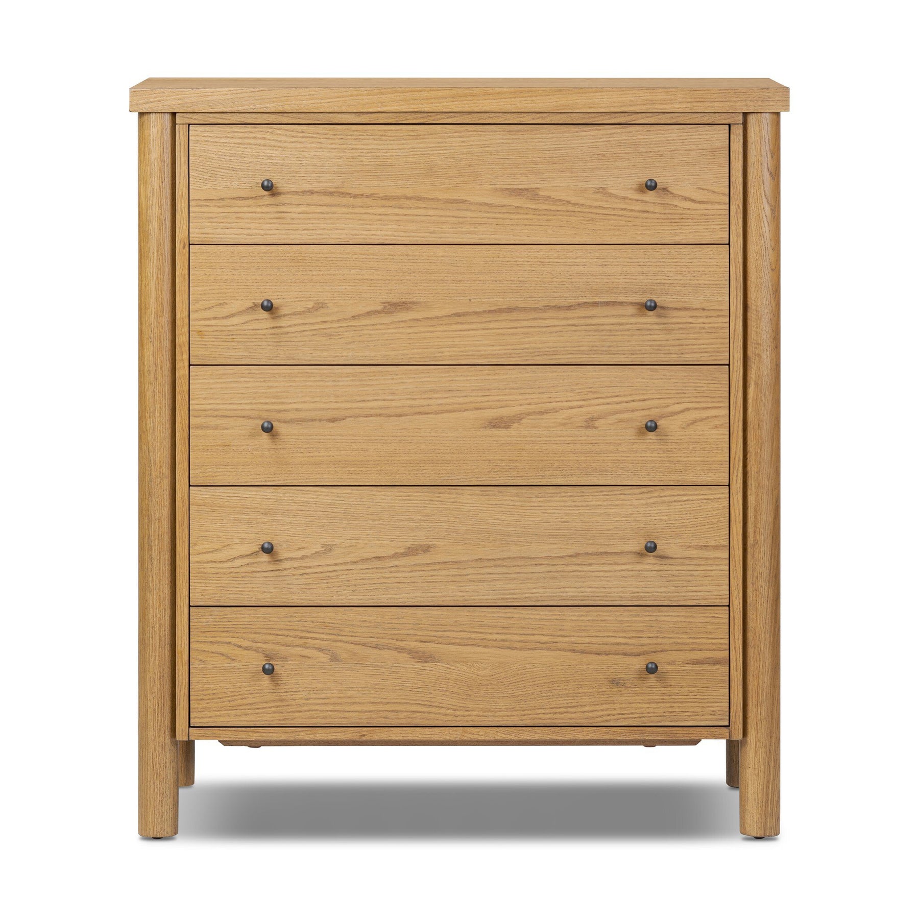 Create storage space in the bedroom with a five-drawer dresser of amber-finished oak. Chunky dowel legs support a tall silhouette and overhang top, all finished out with simple gunmetal hardware.