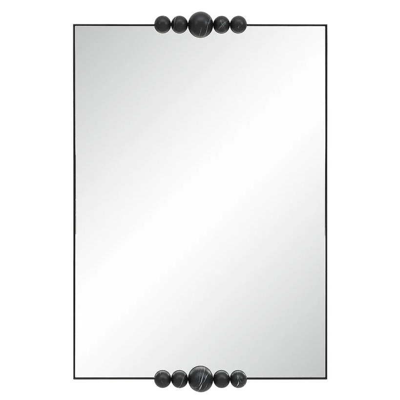 Bring bold character to any modern interior with the Eternity wall mirror. Its matte black iron frame delivers clean, architectural appeal, while the crystal-clear glass ensures a true, seamless reflection. Accented with sculptural black marbled half-spheres, it introduces subtle artistry and texture. Both stylish and durable, this mirror enhances contemporary spaces with effortless sophistication.