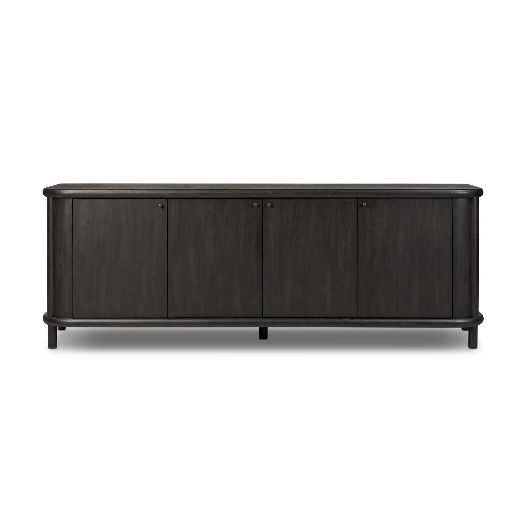 Large cylinder framework defines this oak sideboard with a warm oak finish. Curved lines add softness, while delicate hardware provides a visual contrast against the sideboard's substantial size.