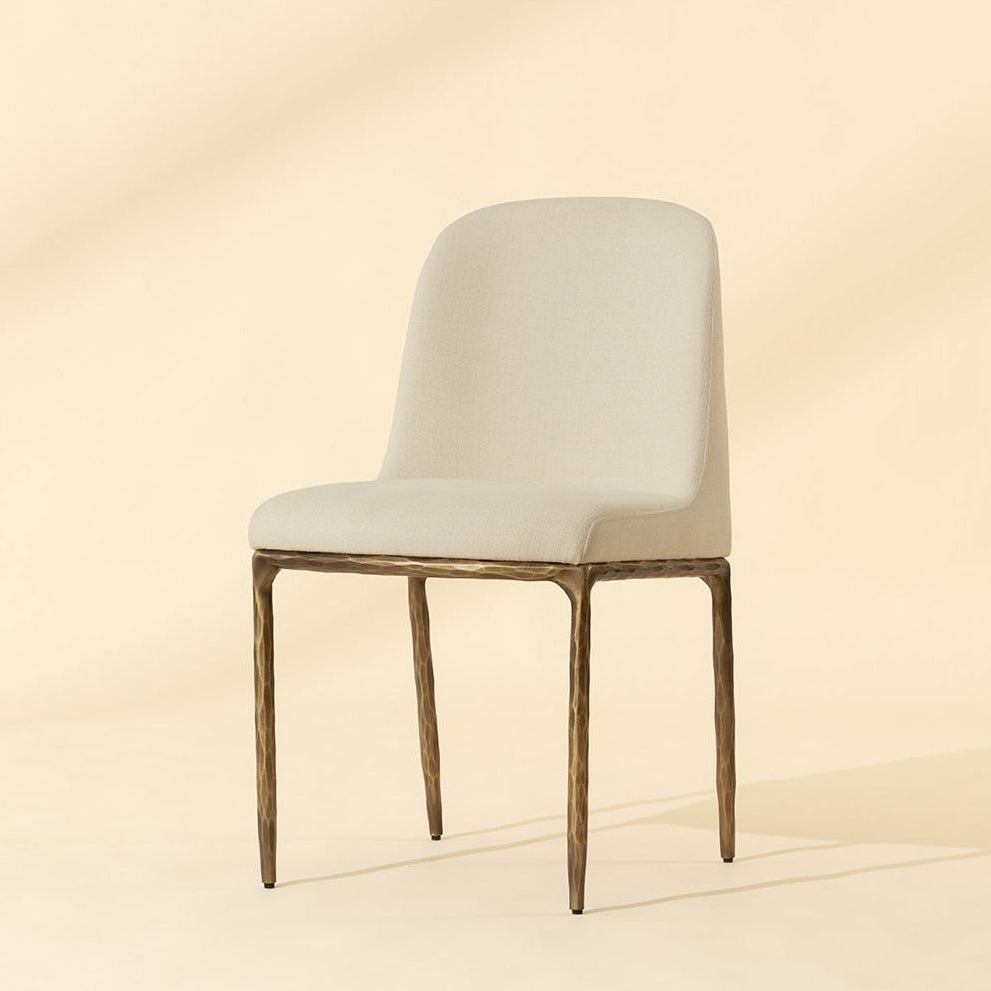 The Nestor Dining Chair balances softness and structure in a refined contemporary form. A gently curved back and plush seat, upholstered in cream performance fabric, create a clean yet inviting profile. Slender powder-coated steel legs in an antique brass finish anchors the piece, while hammered detailing lends an artisanal look.