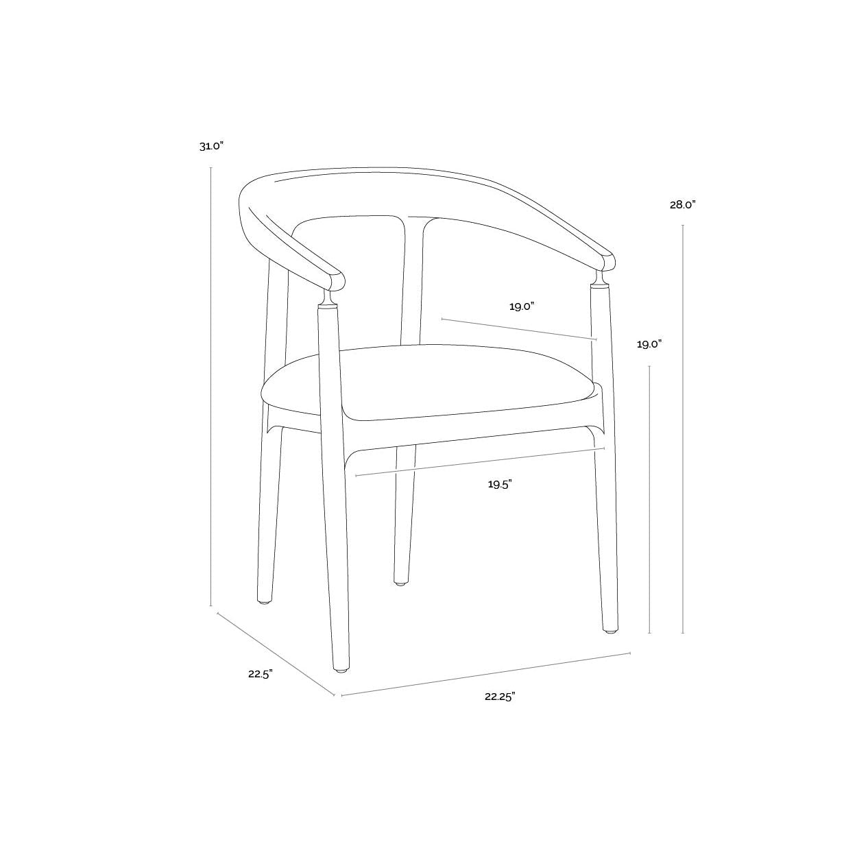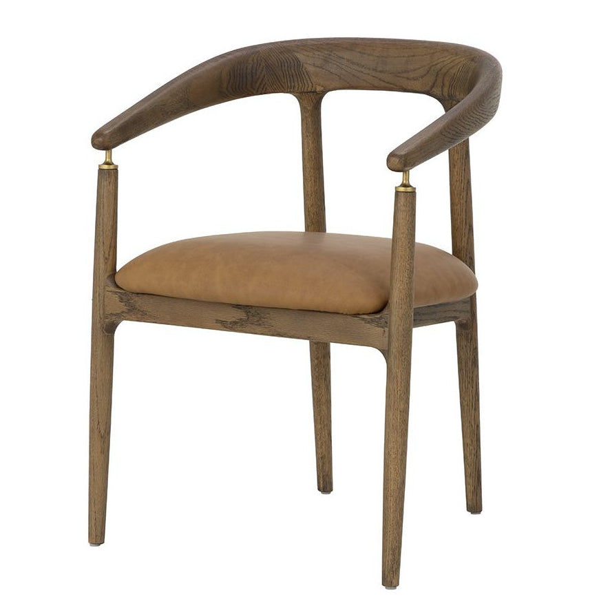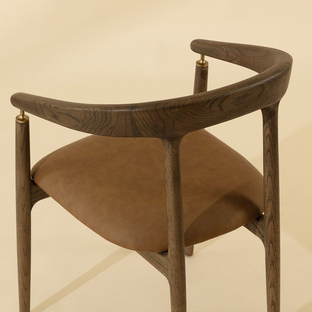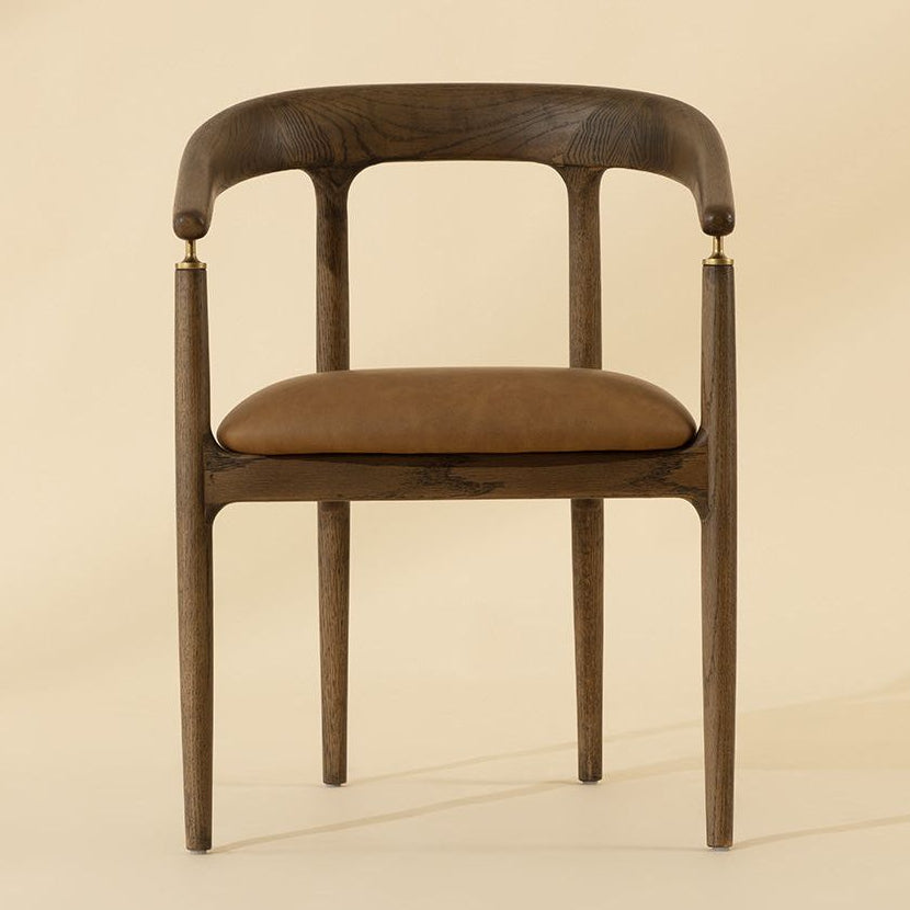 The Valmont Dining Armchair pairs a solid oak frame with a seat upholstered in durable faux leather. Its curved back and low arms are anchored by a small but striking detail: brushed brass fittings that connect the armrest to the frame. With a striking mid-century modern design, the Valmont highlights skilled craftsmanship and distinctive character.