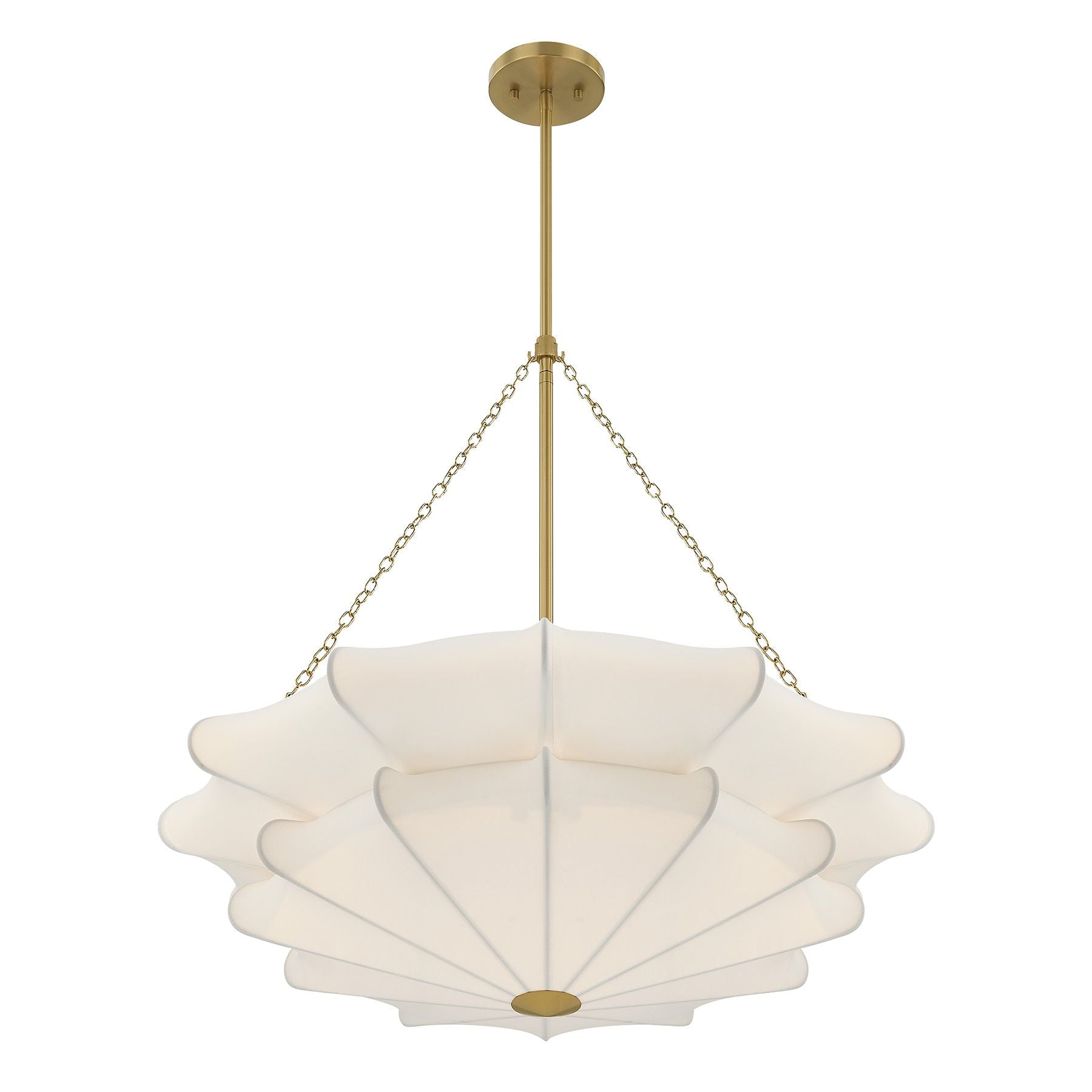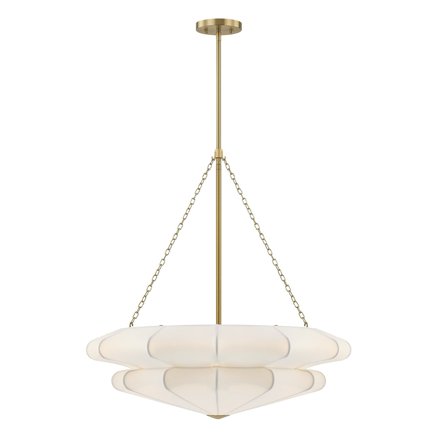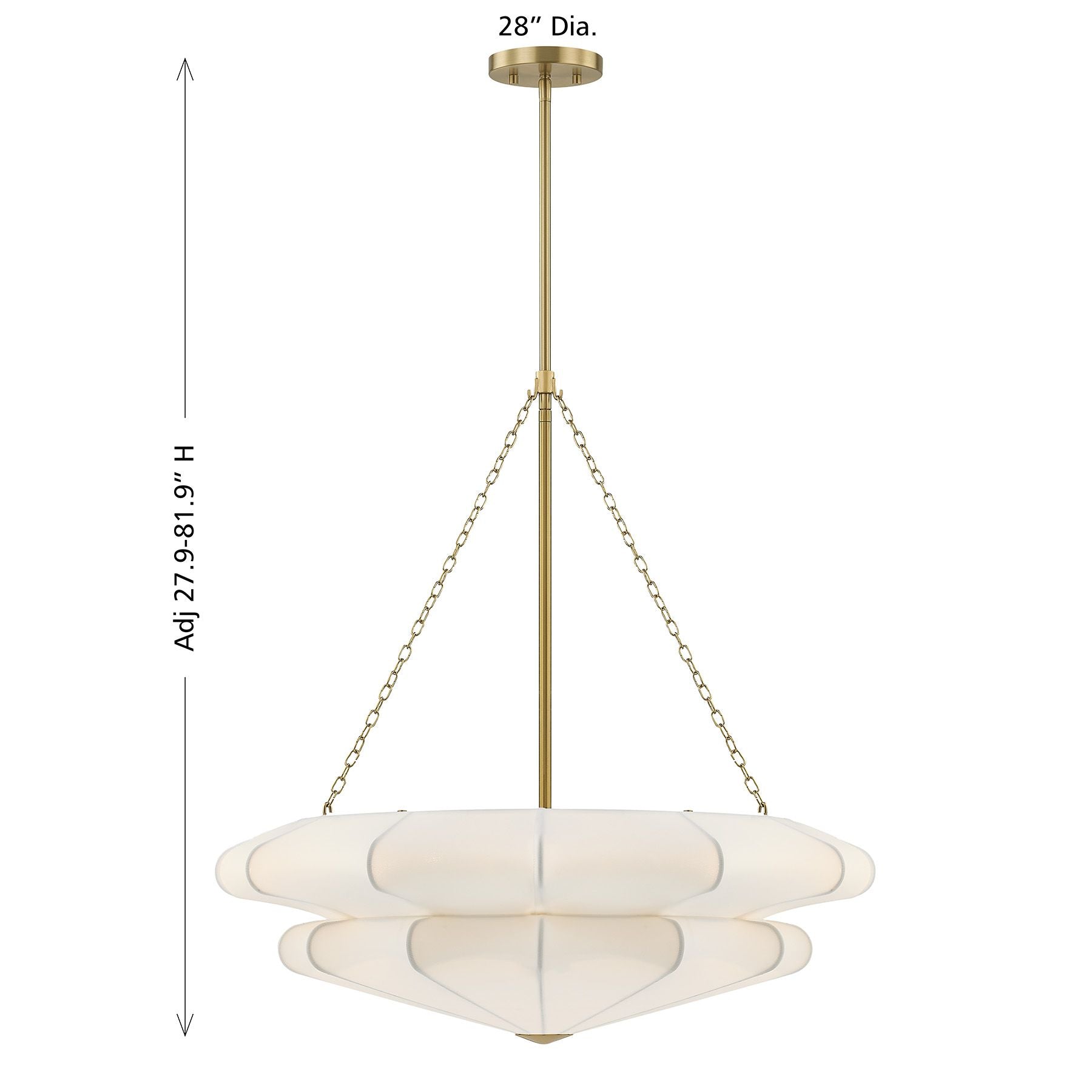 Softly elegant and beautiful, this Savoy House Coppell 3-light pendant is sure to add warm and welcoming illumination to any location. A two-tier white fabric shade opens gently outward, creating a soft silhouette and pairing nicely with the Warm Brass finish. Coppell is 28" in width and has an adjustable height ranging from 27.9" to 81.9". It uses three standard size bulbs of up to 60 watts per bulb. Bulbs not included. Comes with four 12" downrods and one 6" downrod.