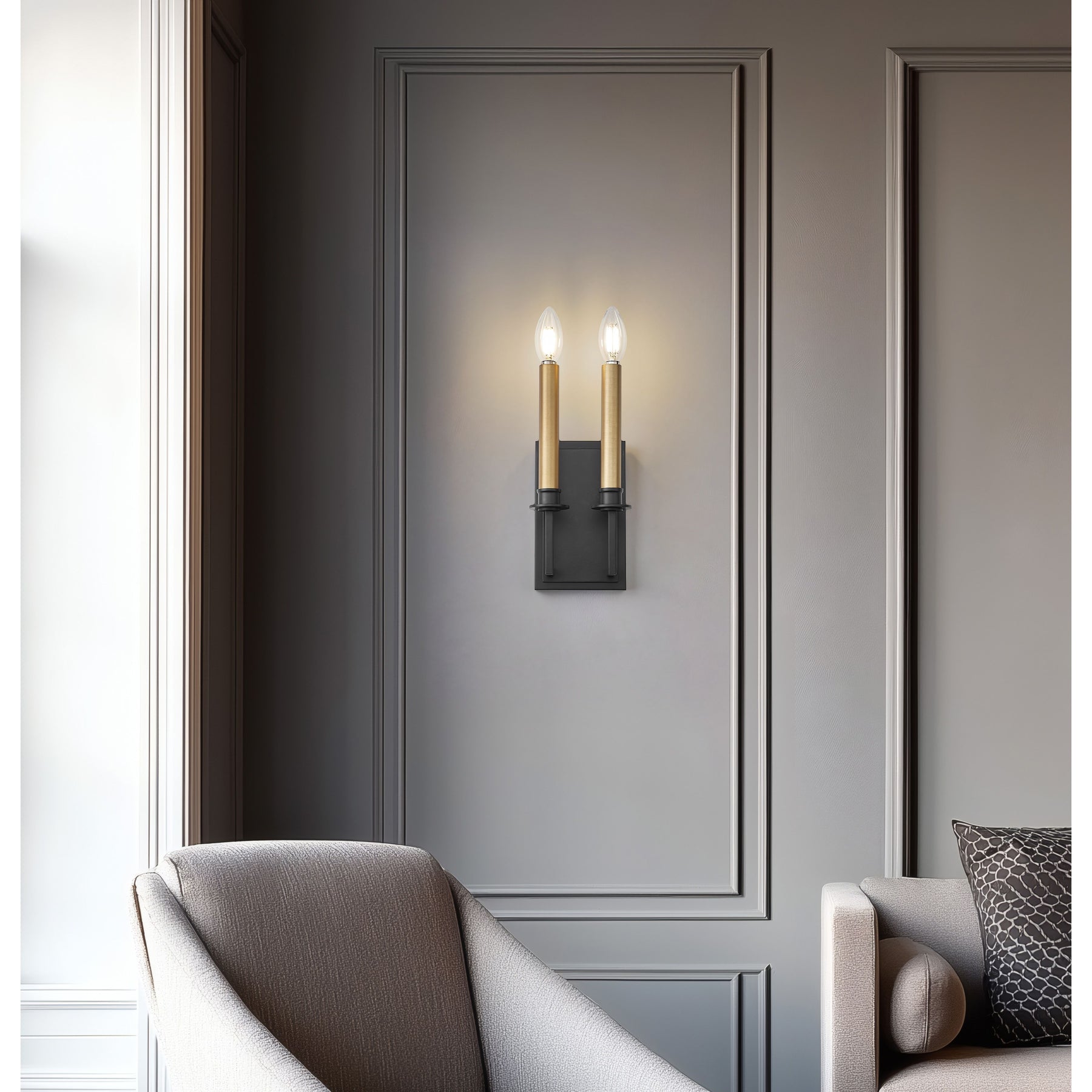 A pair of elegant candelabra holders sit side by side, creating a hint of romance in this otherwise modern wall sconce. Iconic with a storied motif, this fixture features matte black finish steel framing with angular and linear accents, perfect for entryways, living rooms, and dining spaces. Dimmable lighting tells the story of mood creation and adjustable levels to suit time-of-day conditions.