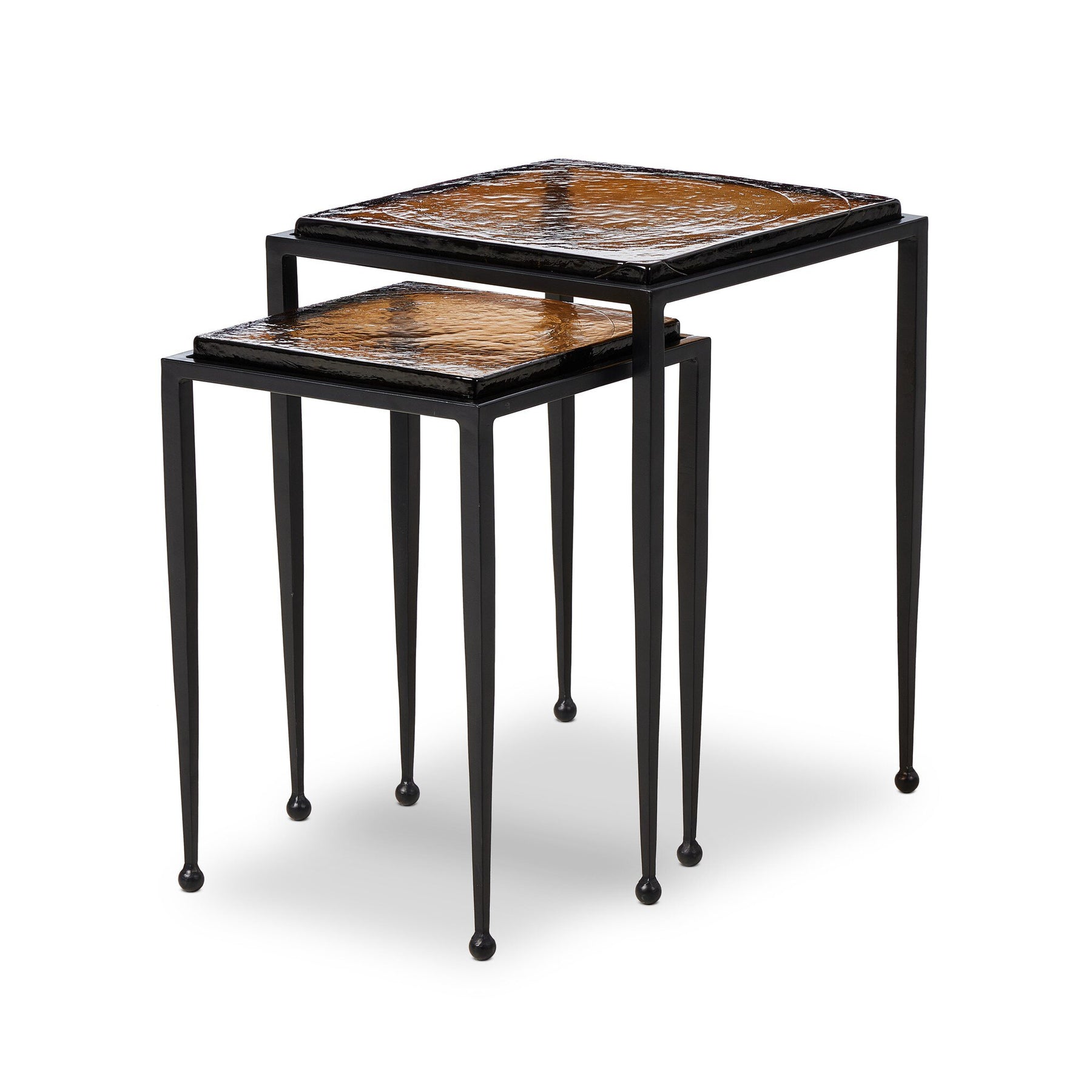 Slim, airy bases of black-finished iron support two varied-height nesting tables of smoked black glass. Designed to bunch or pull apart as desired, with ease.