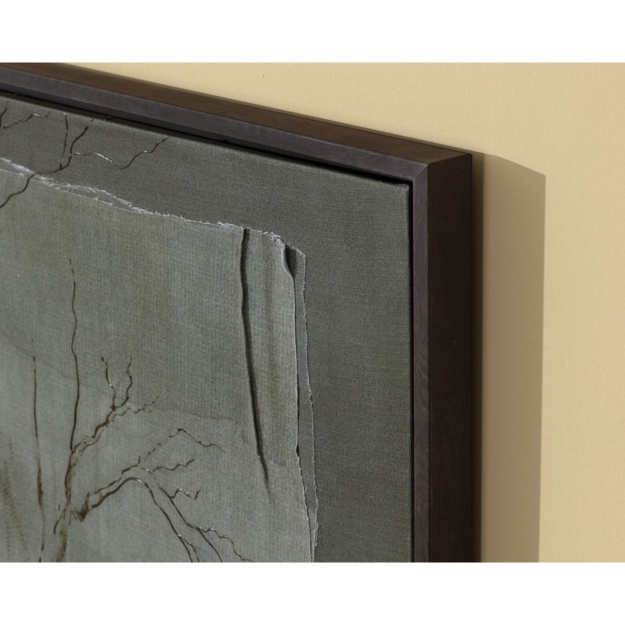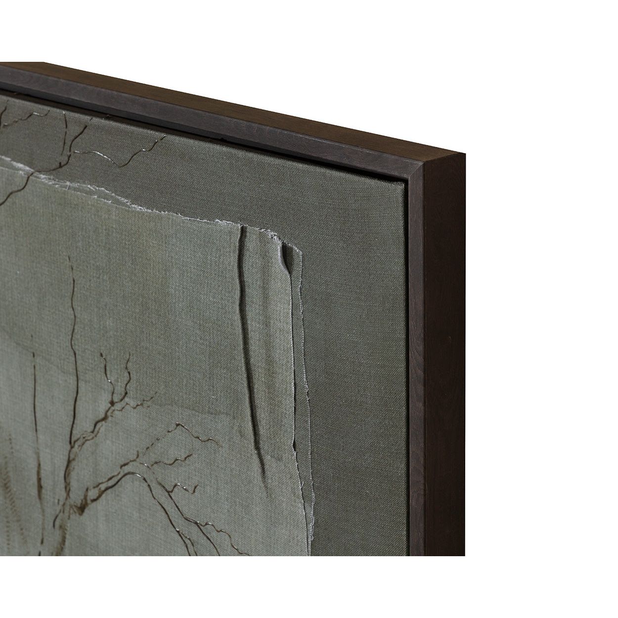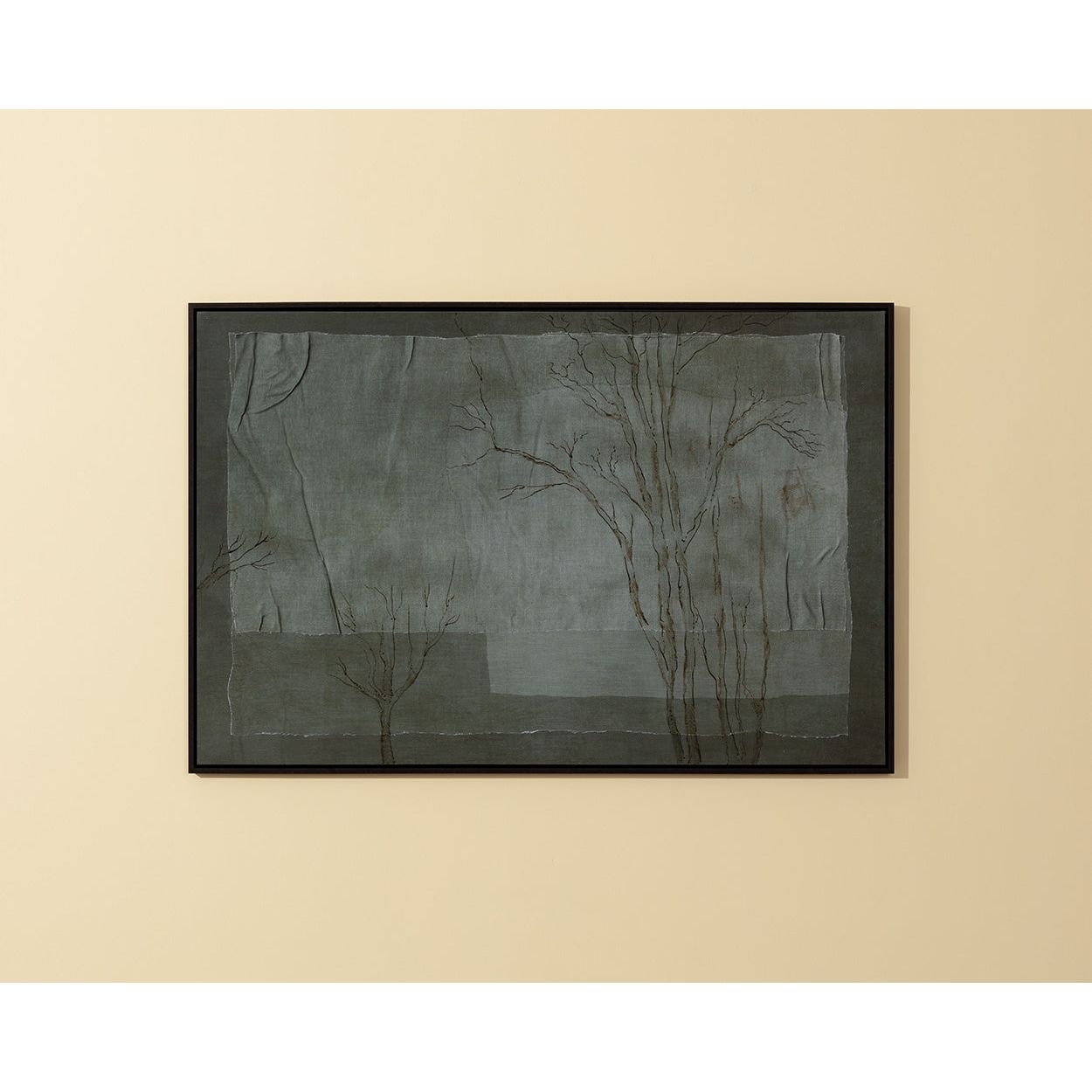 Quiet and contemplative, this hand-embellished glicee on linen captures the stillness of a forest through layered textures and delicate linework. Soft tonal shifts lend a sense of calm to the composition. Crafted in Canada.