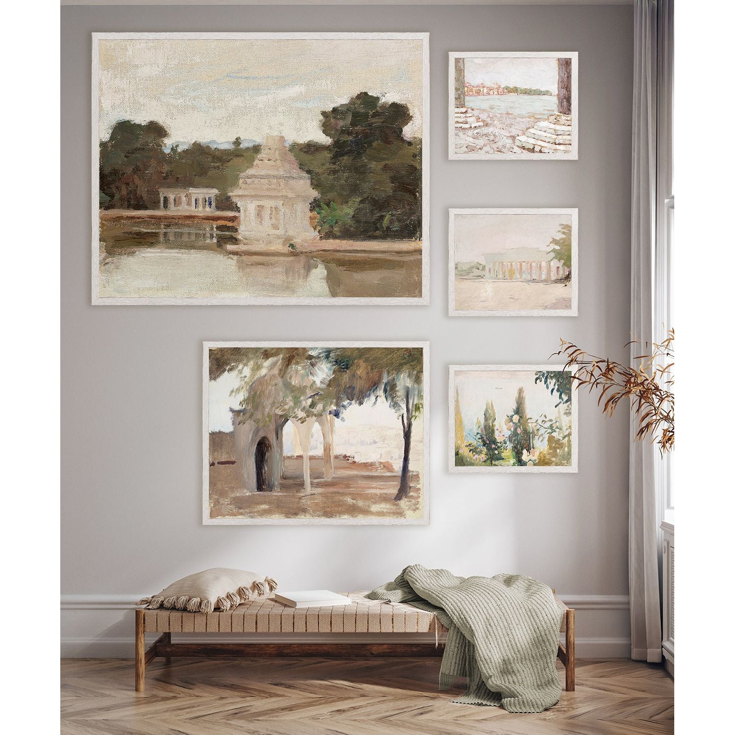 Beautiful landscapes through vibrant acrylics on raw canvas This collection of 22 artworks showcases stunning architecture and scenic coastlines of assorted locales. Loose, impressionist brushstrokes explore the interplay of light, color, and form, while a serene palette of soft greens, creams, beiges, and pastel tones evokes warmth and tranquility.