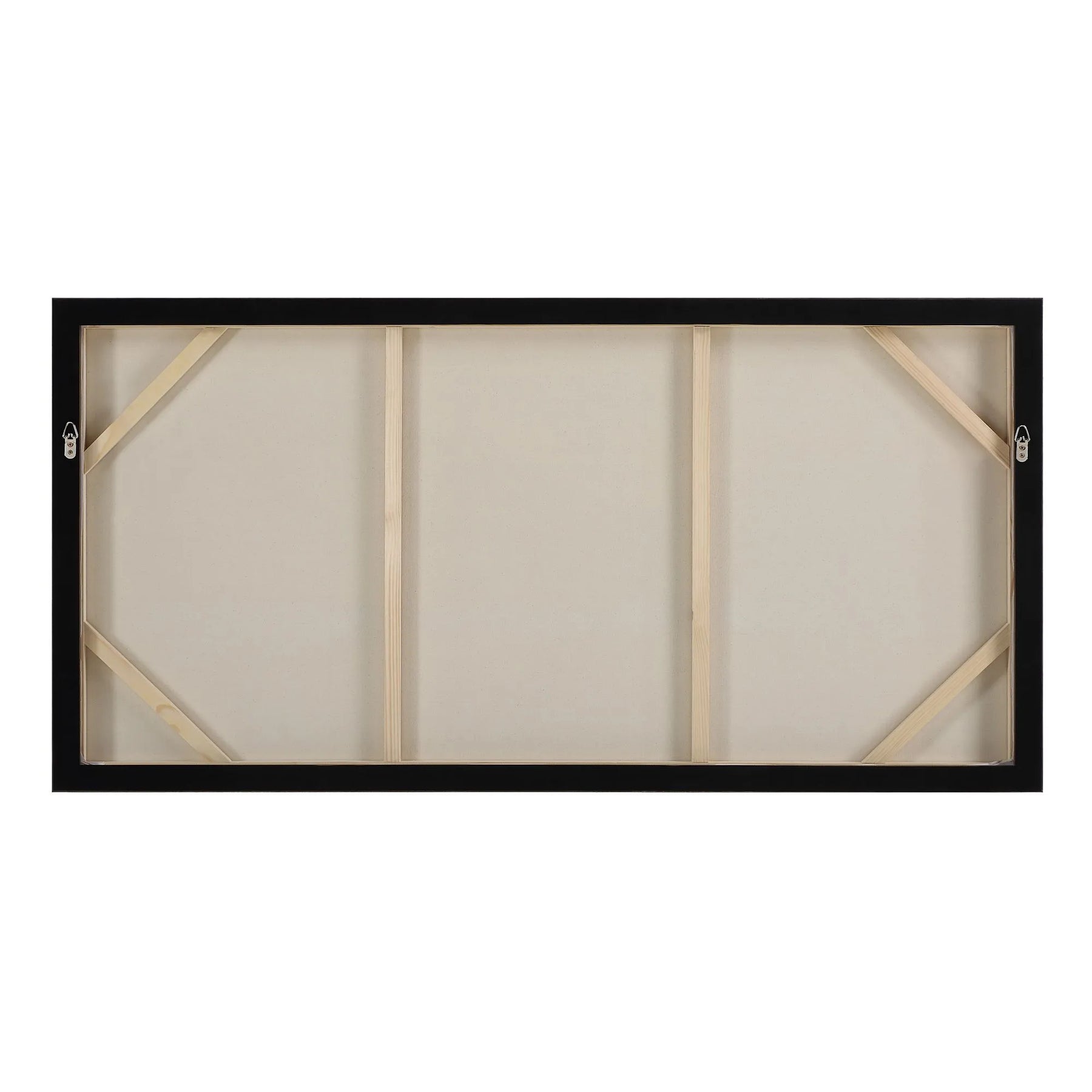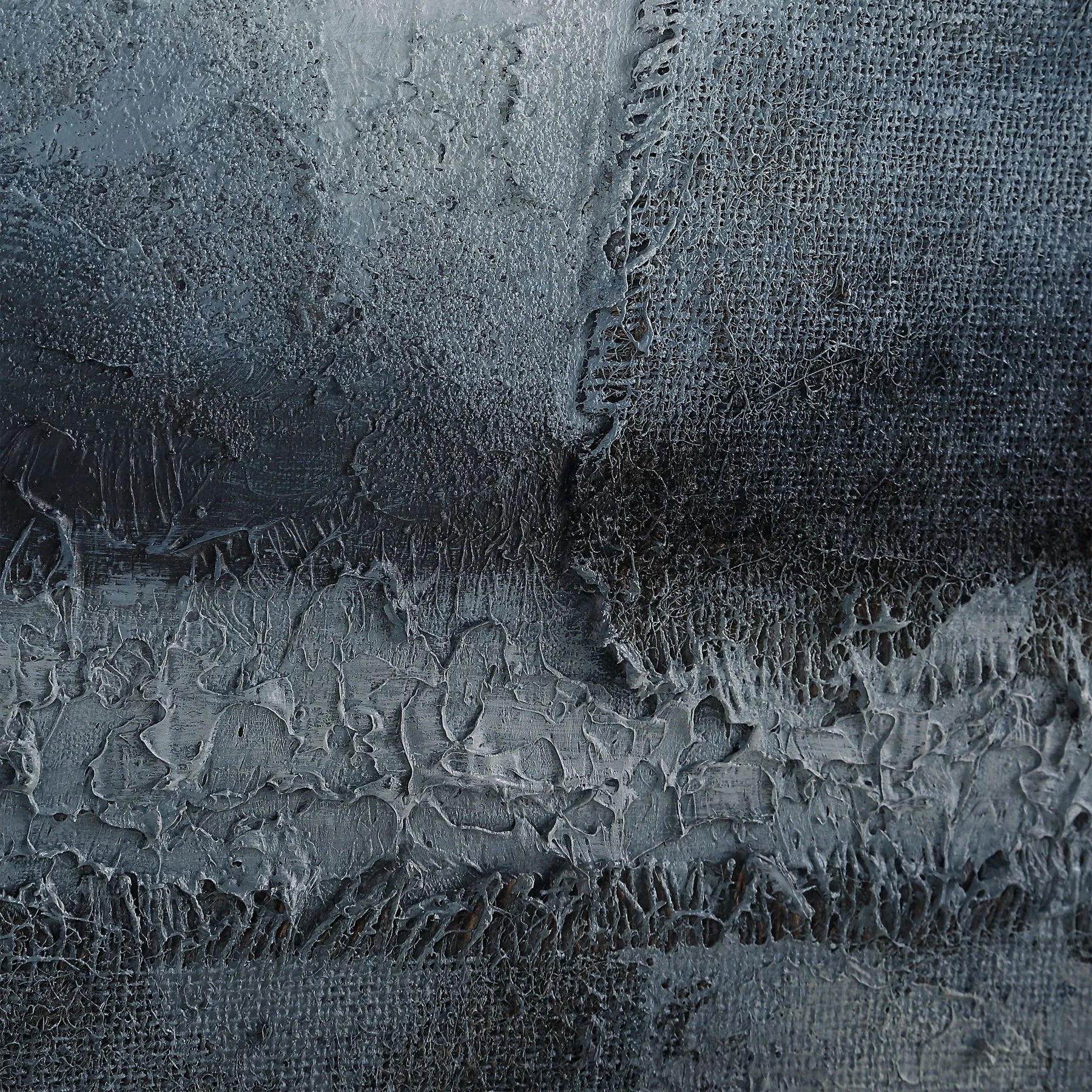 Framed in black oak and hand painted in moody hues with ample texture, it draws the eye in creating a stunning focal point in any modern or transitional interior.
