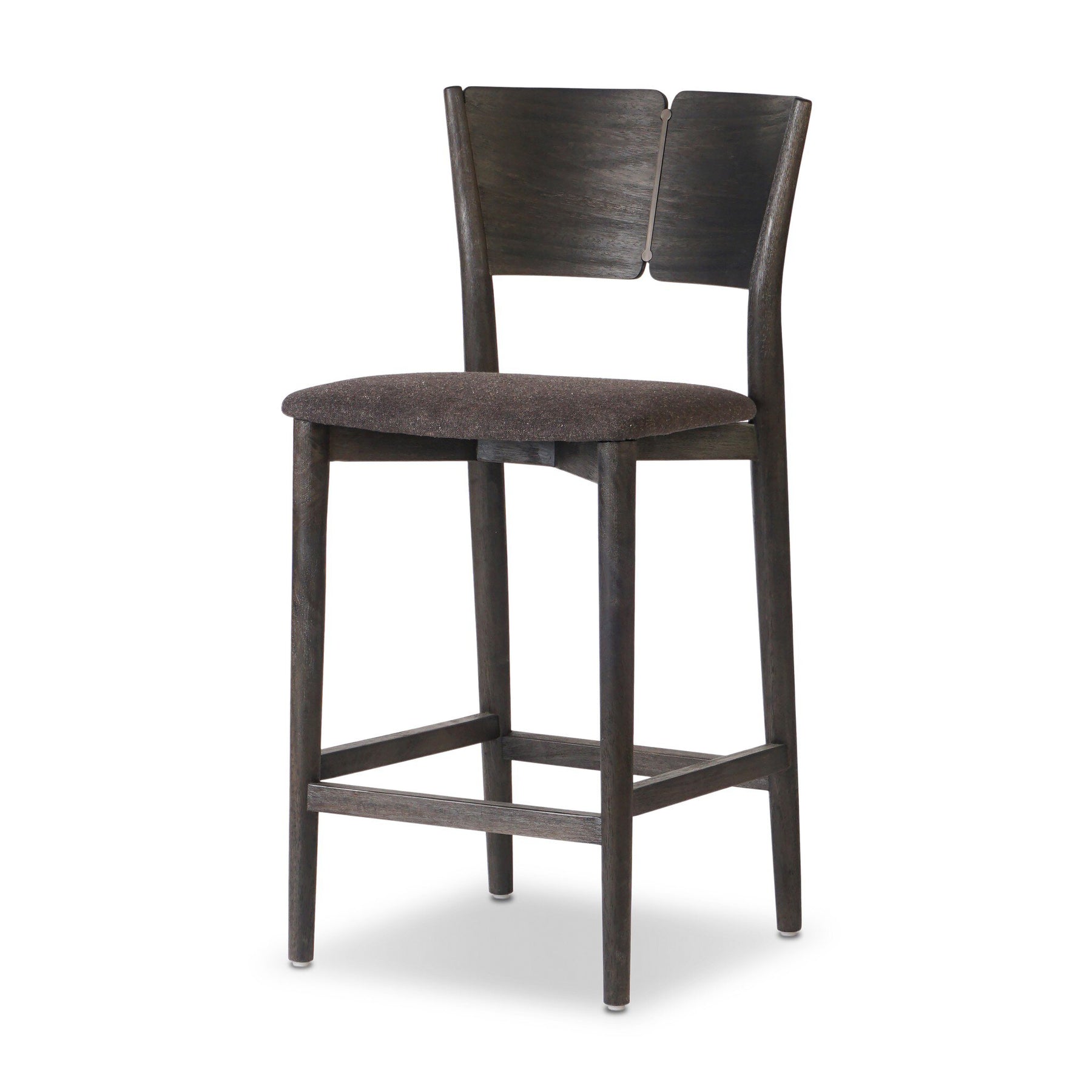 Inspired by simple Scandinavian styling, a tan-finished and dark-finished parawood stool's slit-back metal inlay adds a decorative touch. Easy curves from bent wood give a smooth silhouette. Sized for the counter and upholstered with a thin seat cushion in linen-cotton taupe.