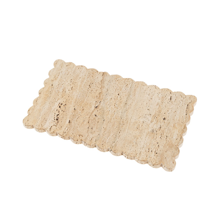 Add a touch of natural charm to your home with the Travertine Rectangular Scallop Tray. Designed with scalloped edges and crafted from travertine stone, this tray is perfect for keeping your cooking spices handy in the kitchen or organizing your jewellery on a dresser. Its straightforward design makes it a practical and stylish addition to any room.