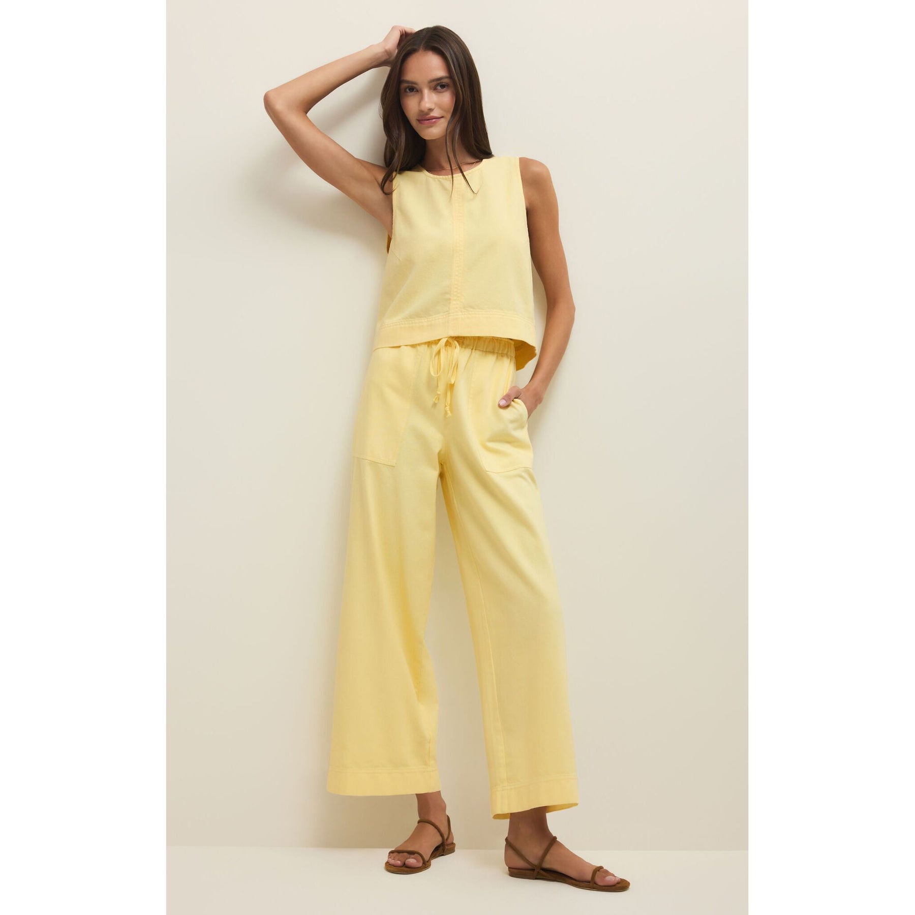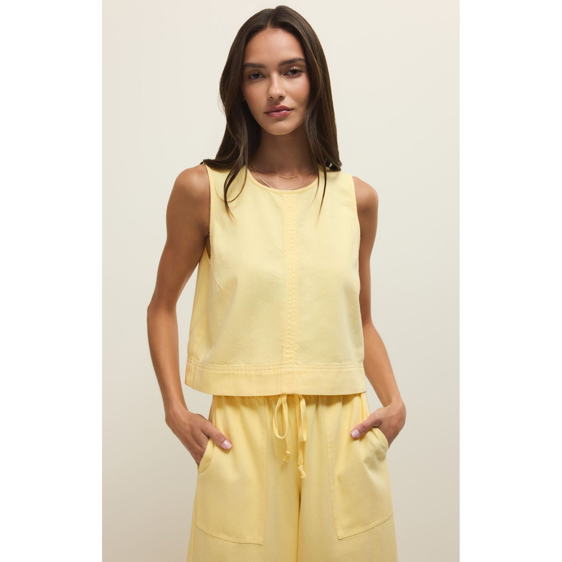 Crafted in a woven cotton blend, this tank features a crew neckline, a back keyhole button closure, and a cropped silhouette.