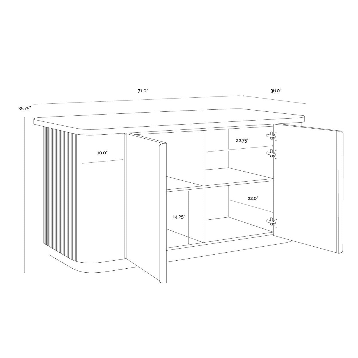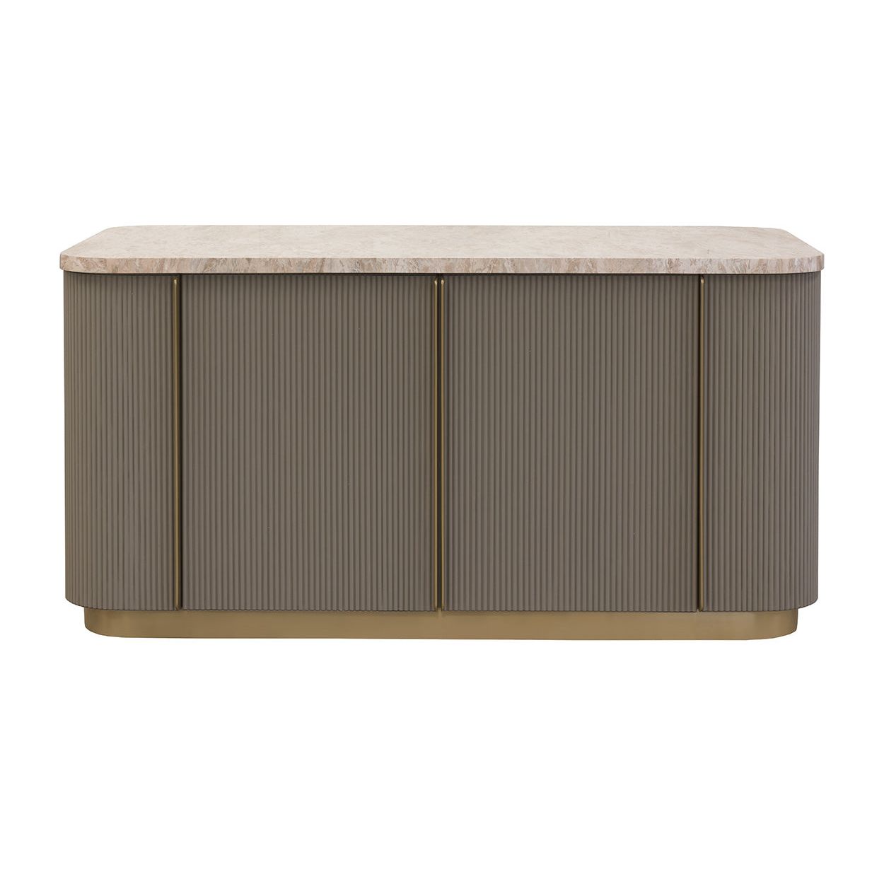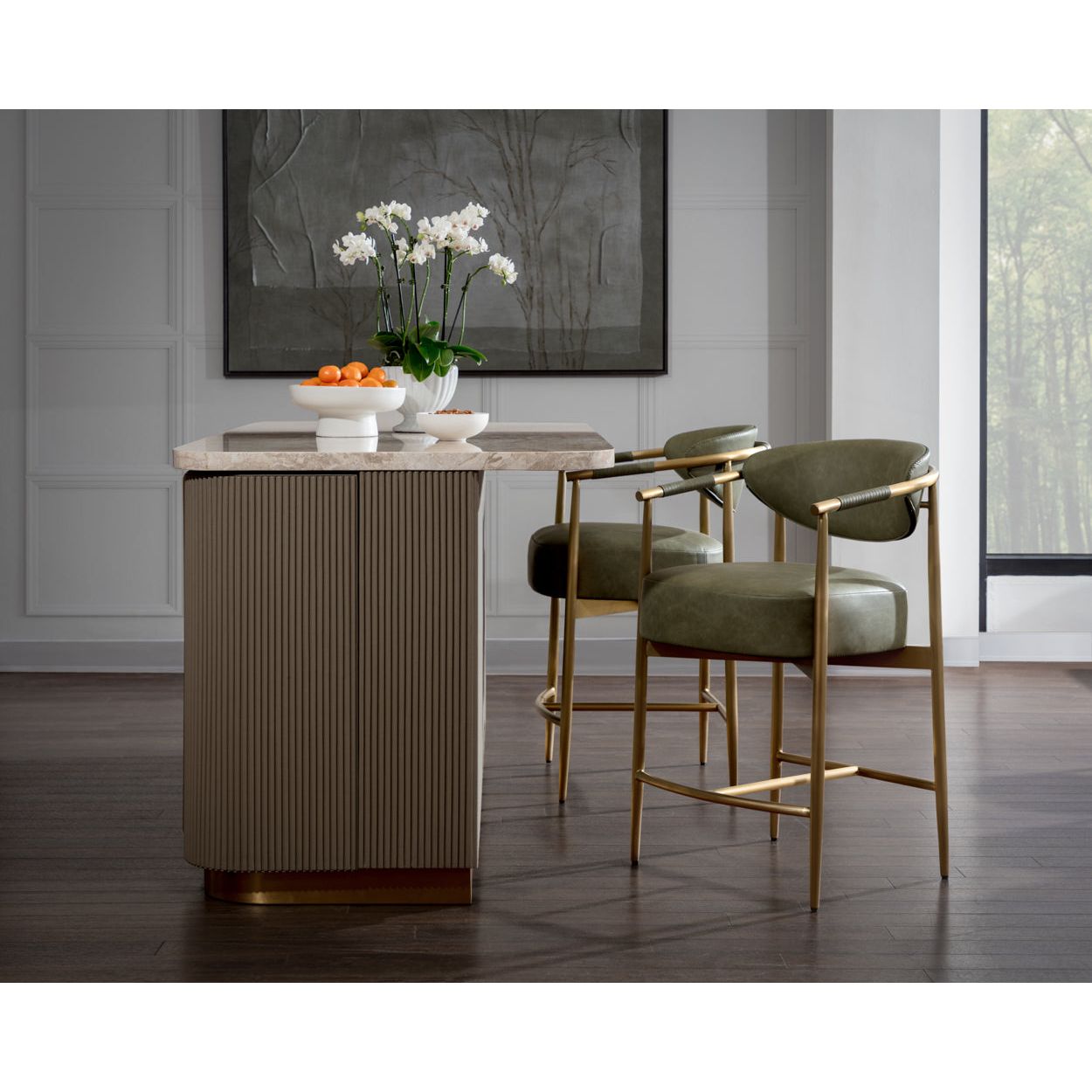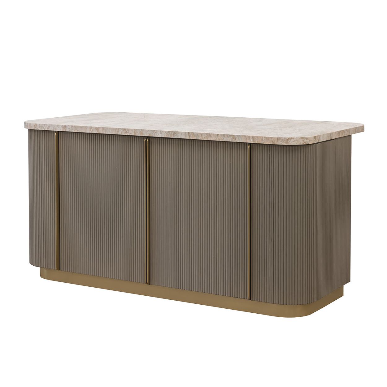 The Cataldi Kitchen Island brings a tactile elegance to the kitchen. A stark marble top rests above fluted panels wrapped in soft taupe faux leather, offering a subtle play of texture and tone. Inside, matching leather-lined shelving offers discreet storage, while brushed gold accents add a polished touch. Designed with versatility in mind, Cataldi can stand alone as a kitchen prep station, receptionist desk, or be paired with multiples as a stylish workspace.