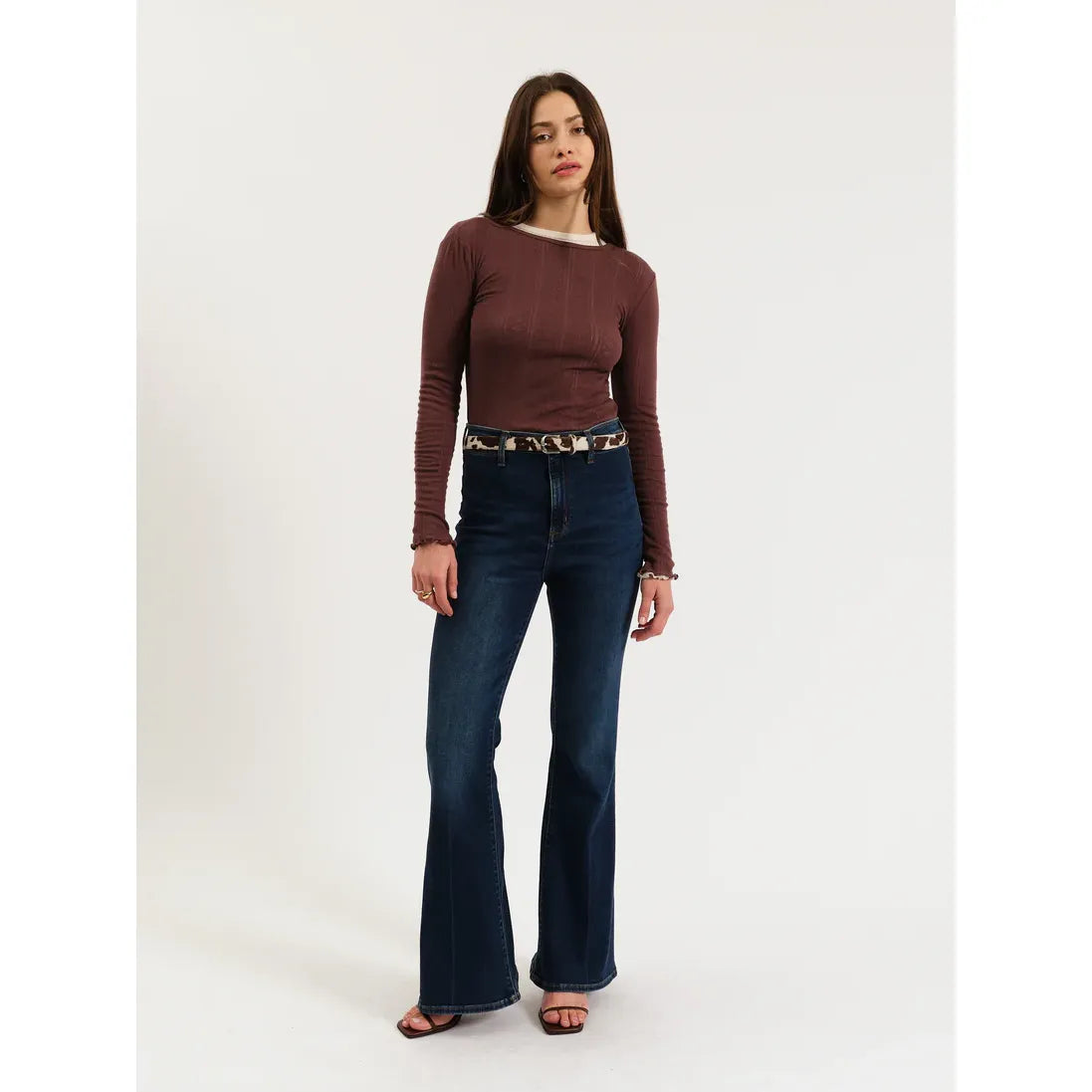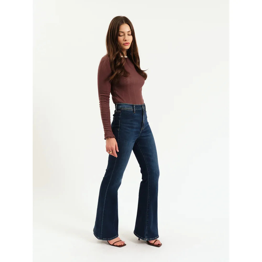 The Sunset Flare in Rinse is a high rise flared jean in rich indigo. This flattering fit hugs you at the waist and flares dramatically from knee to ankle. Constructed from our Hug fabric, this jean is flexible enough to hug your body, yet heavy enough to cinch you in.