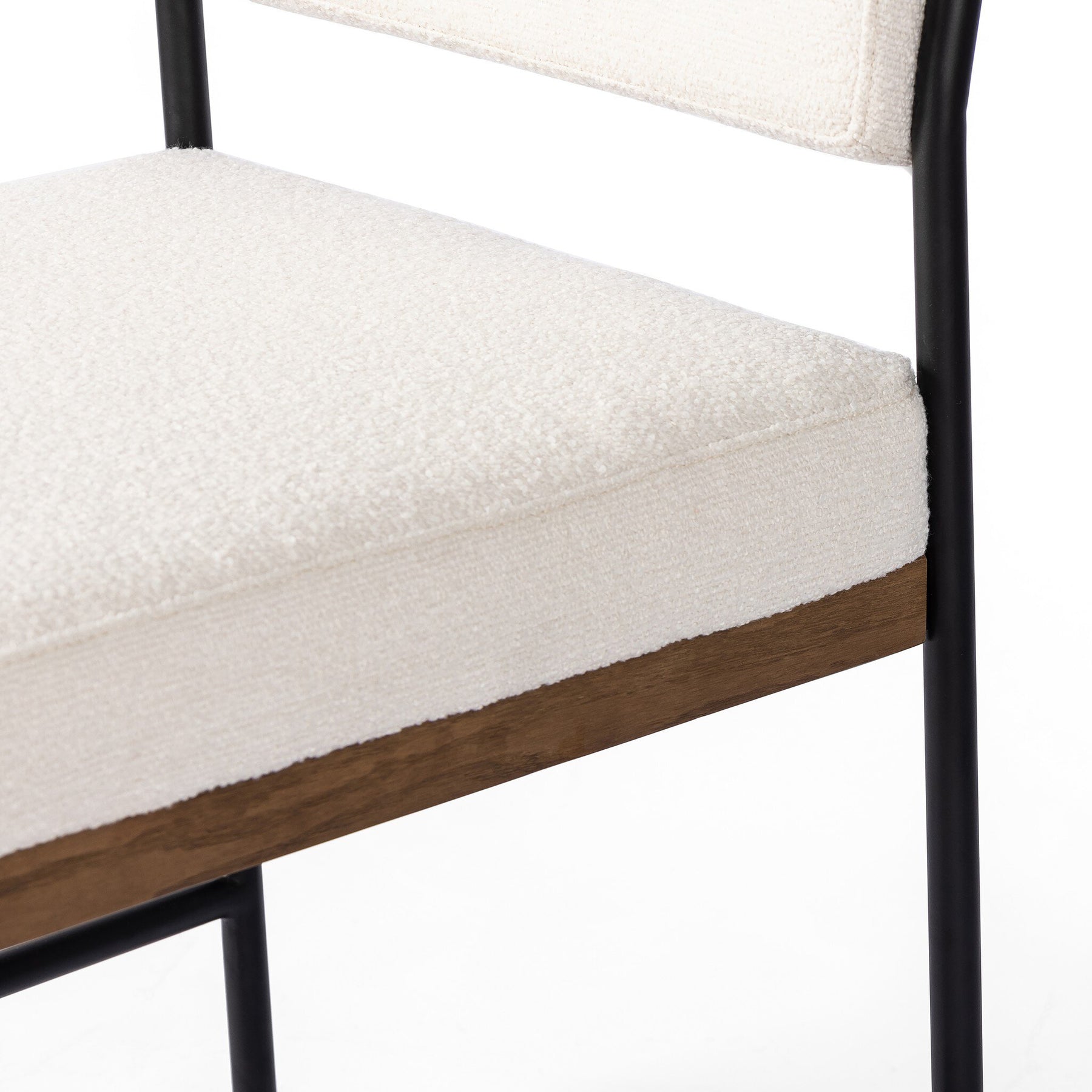 Bring a crisp, clean look to the table. Slim, black-finished iron forms an airy frame for pristinely tailored performance fabric, with solid oak decking for an eye-catching material mix. Performance fabrics are specially created to withstand spills, stains, high traffic and wear, ensuring long-term comfort and unmatched durability.