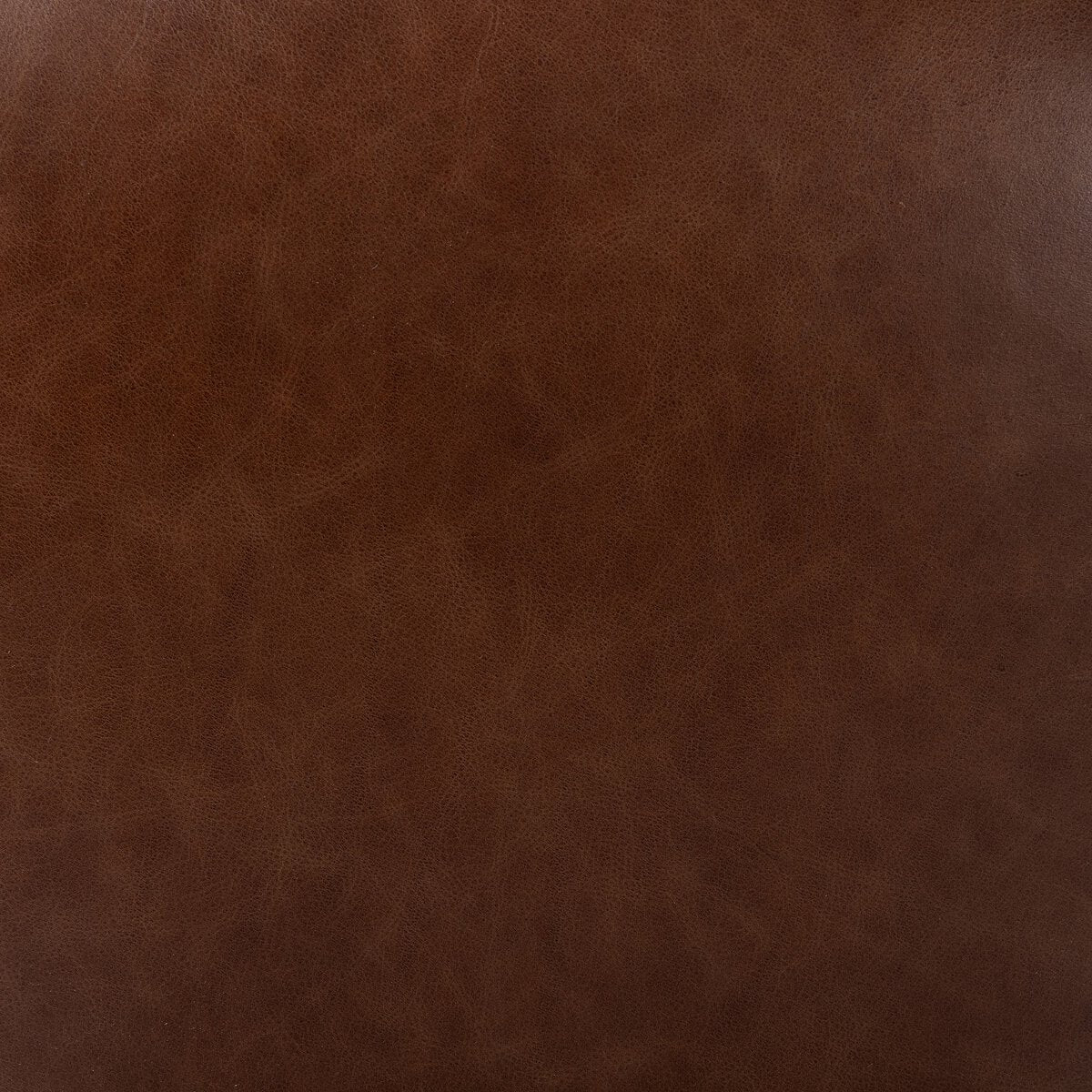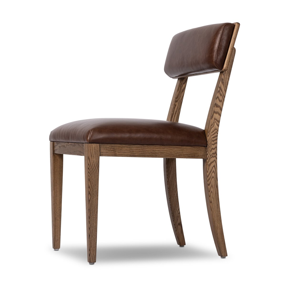 Both modern and traditional, toasted oak frames this high-back, armless dining chair. Finished with a rich brown top-grain leather, with hanging straps affixed to the back.