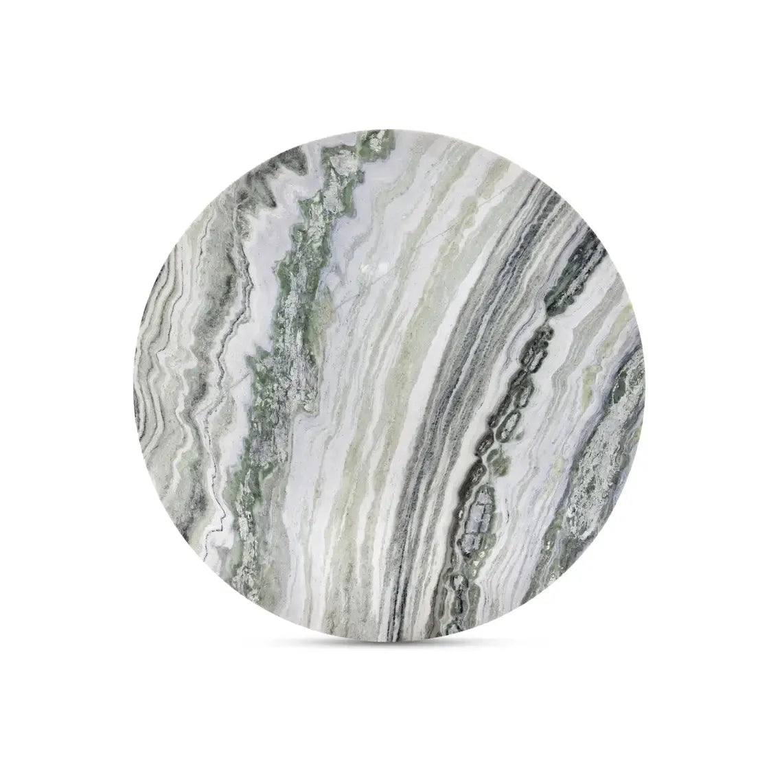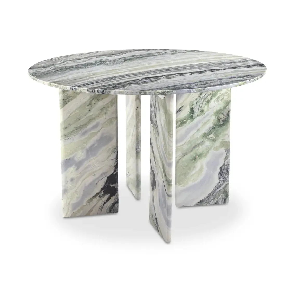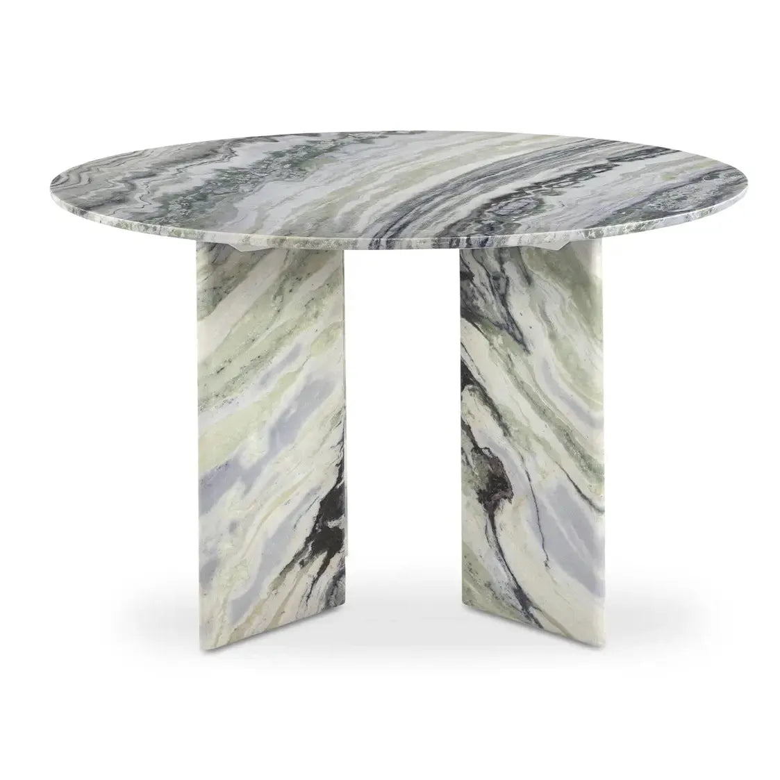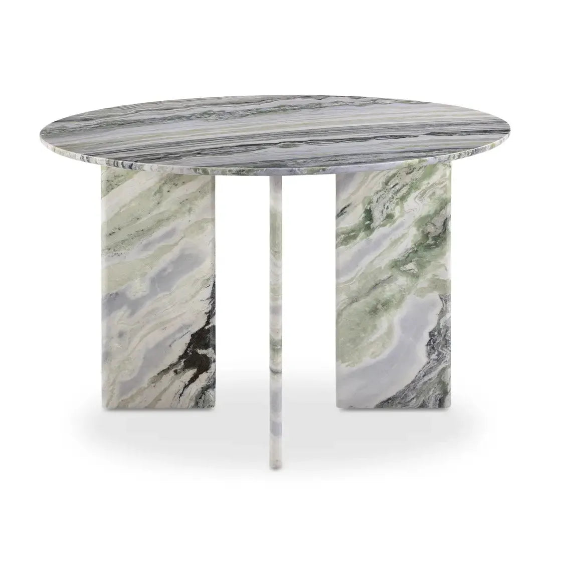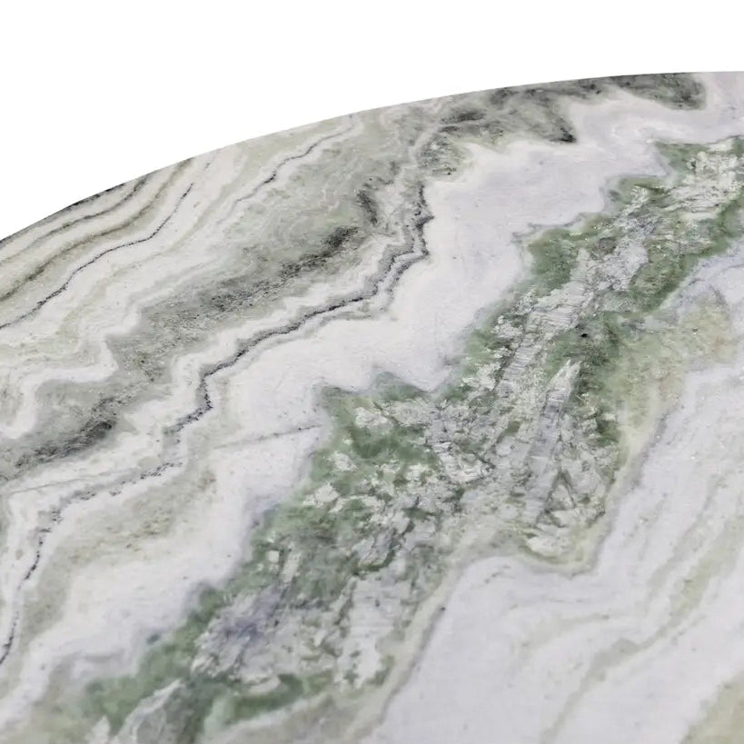 The Celia round dining table effortlessly combines contemporary flair with a timeless silhouette. The table's allure is further enhanced by expressive green onyx panda marble, adding a touch of artistry and opulence. The smooth and organic textures on the marble beautifully contrast with the table's geometric base, creating an intriguing visual harmony and exuding an undeniable sense of elegance and versatility.