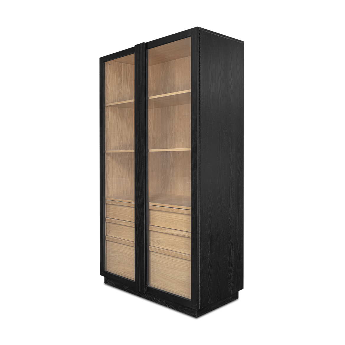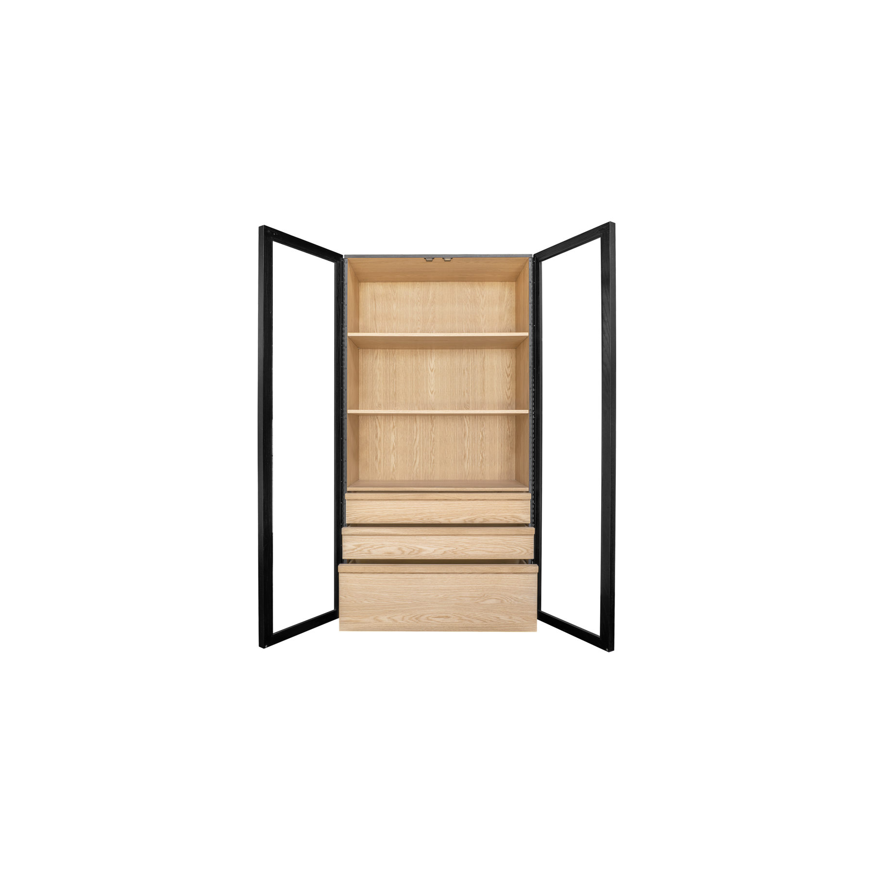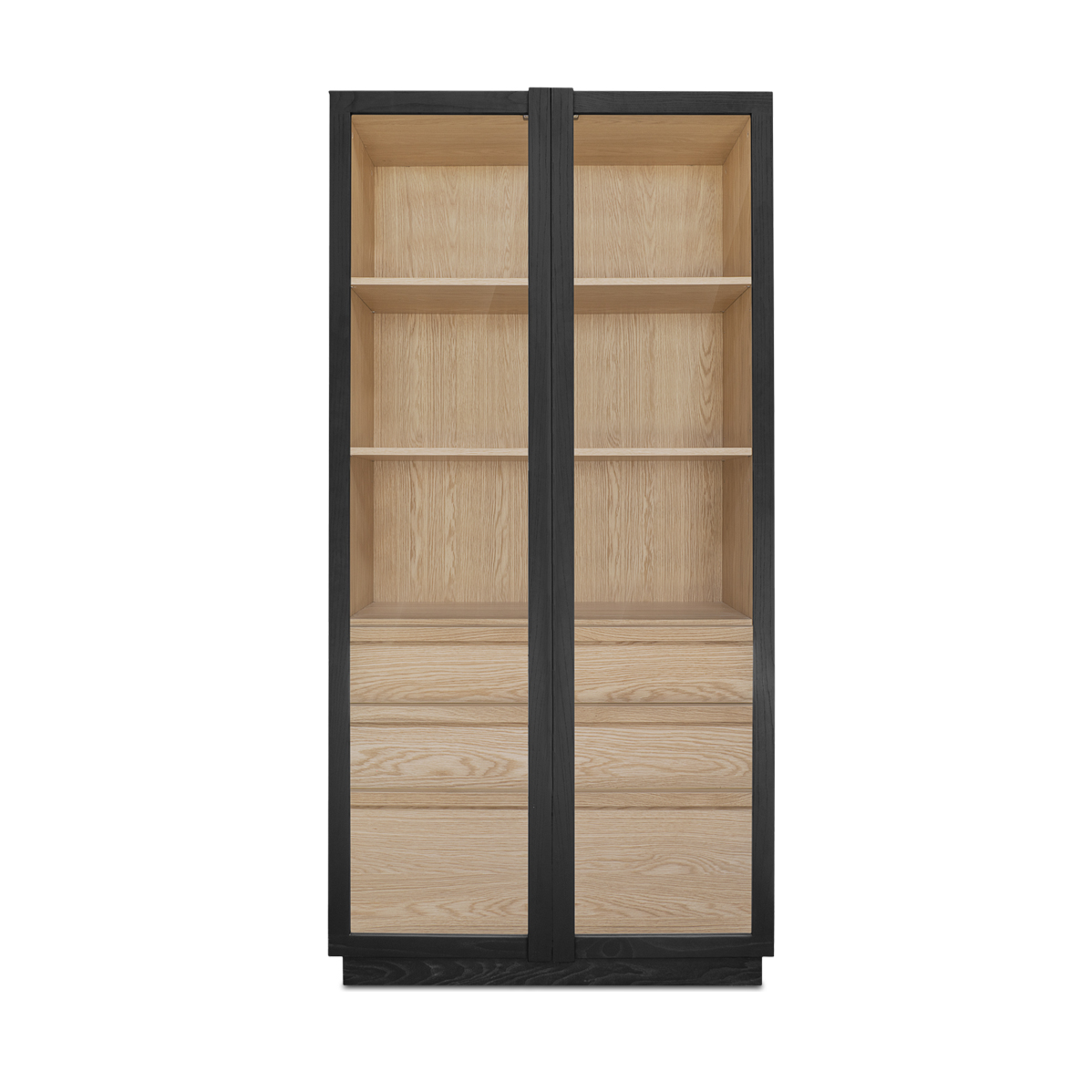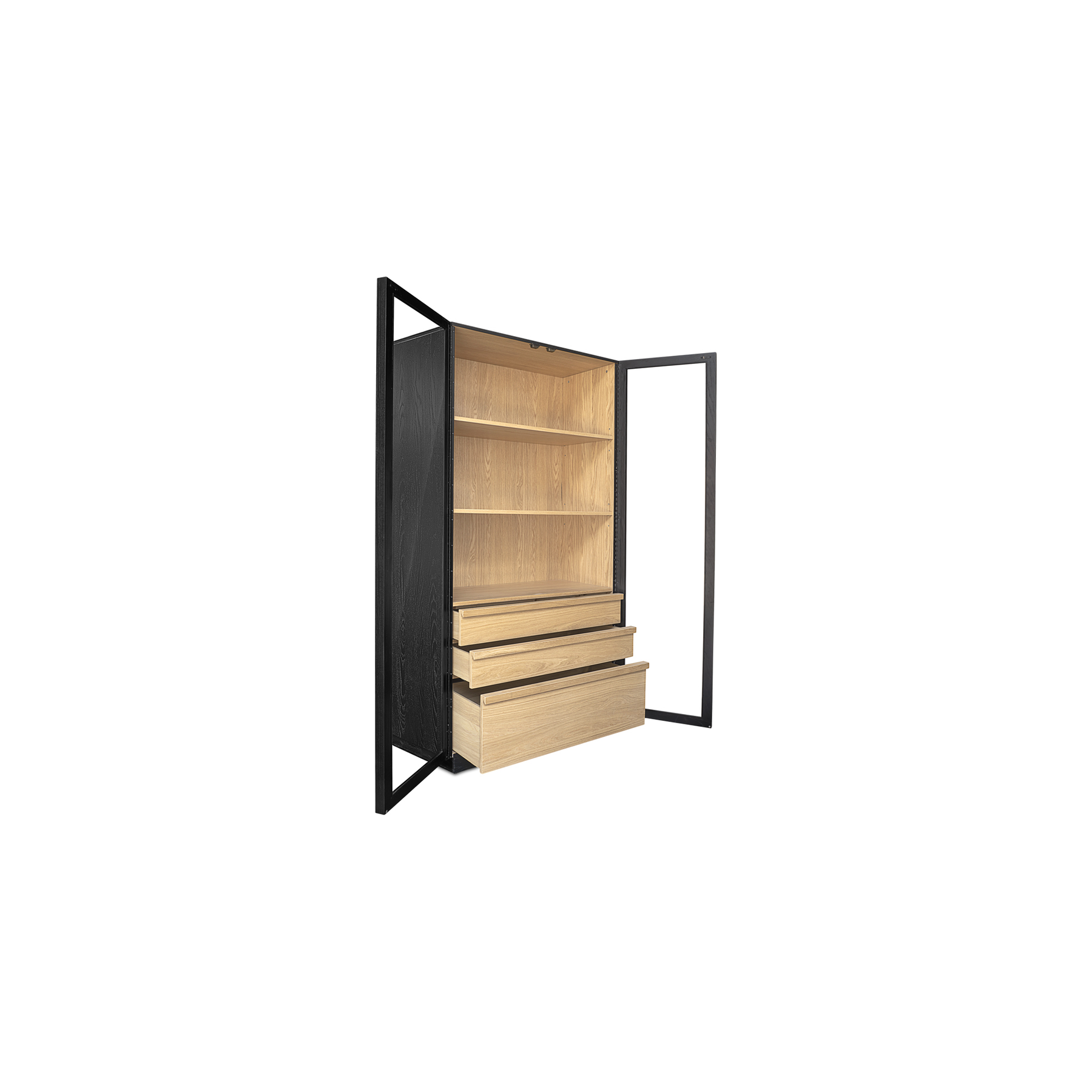 Inspired by the simple elegance of French Cleat handles, the Charlotte Tall Cabinet features a captivating two-tone design with a sleek black outer frame and natural interior. Tempered glass doors offer a stylish, protective showcase, while three interior drawers neatly store smaller belongings. With its modern and versatile design, this piece balances practical storage with graceful display.