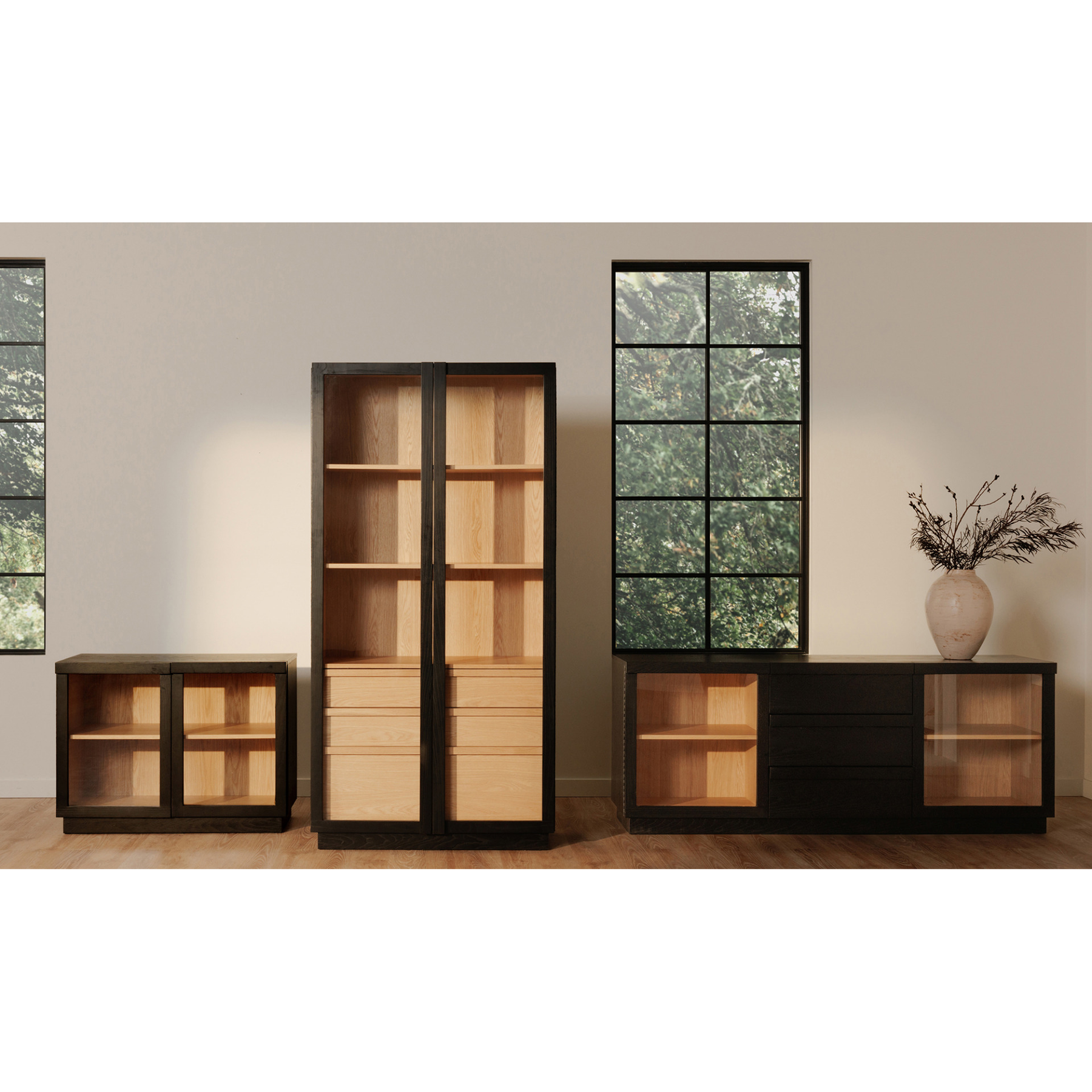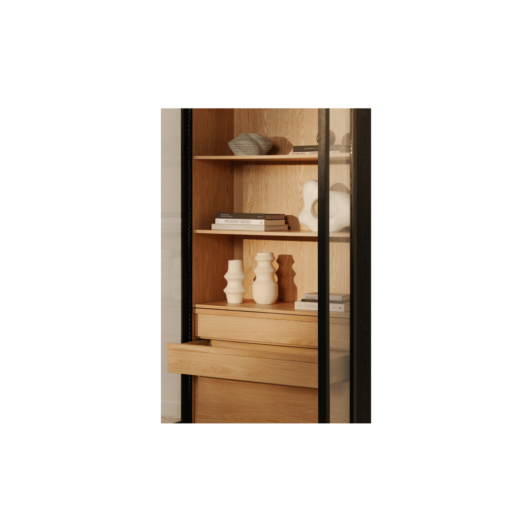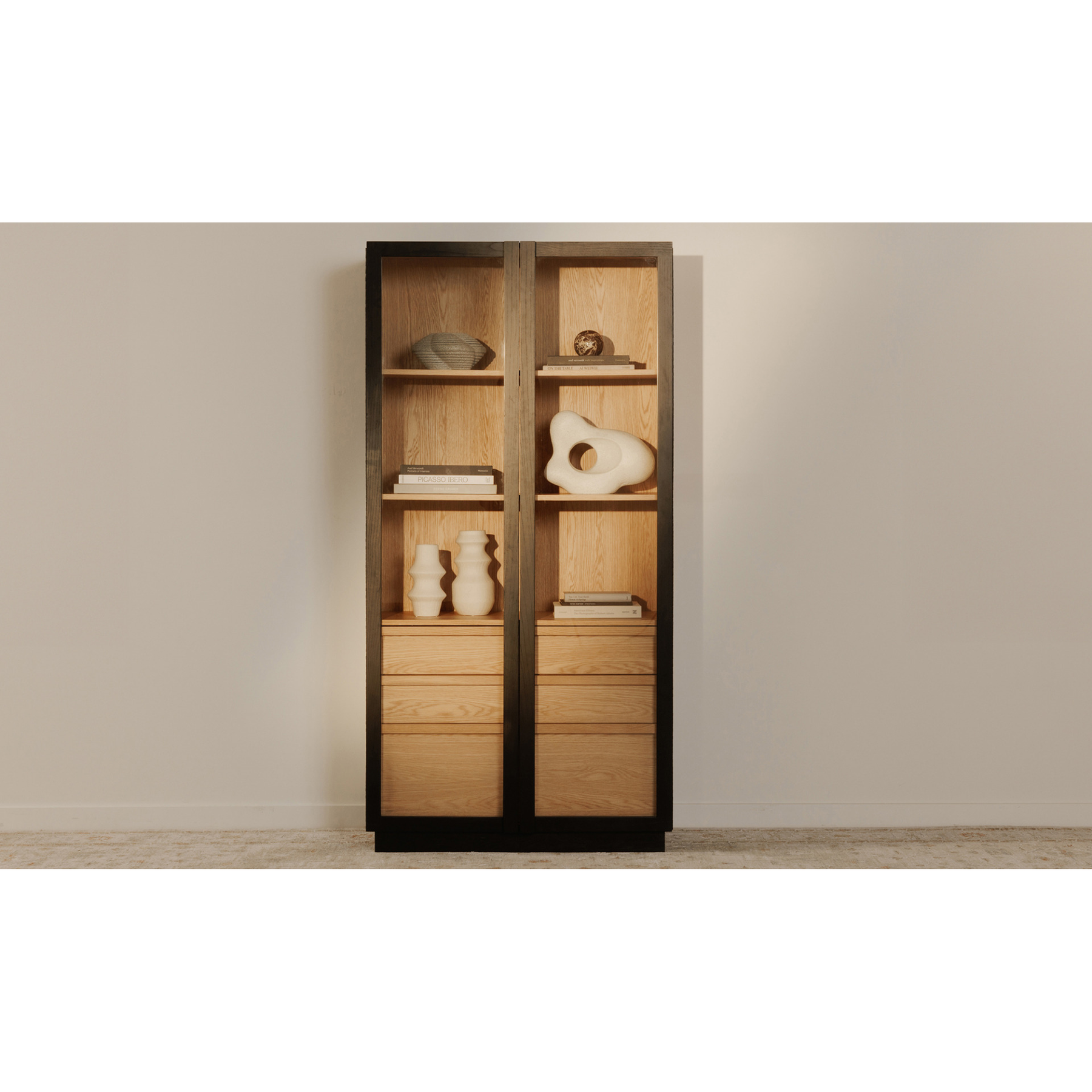Inspired by the simple elegance of French Cleat handles, the Charlotte Tall Cabinet features a captivating two-tone design with a sleek black outer frame and natural interior. Tempered glass doors offer a stylish, protective showcase, while three interior drawers neatly store smaller belongings. With its modern and versatile design, this piece balances practical storage with graceful display.
