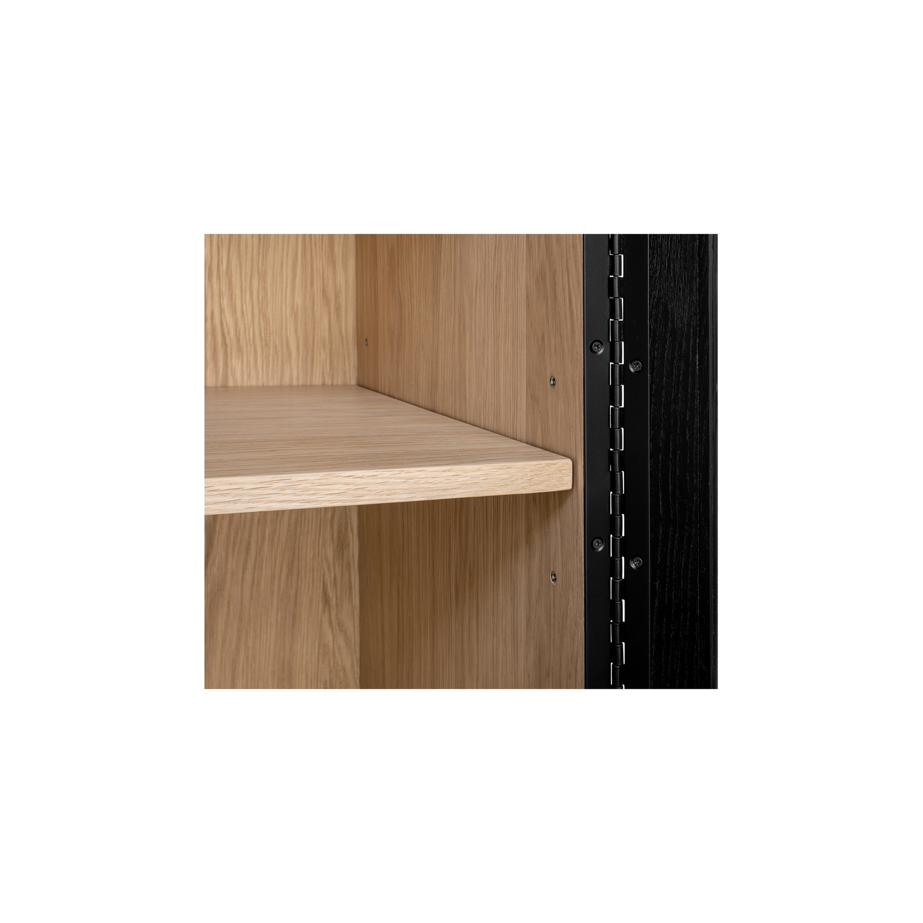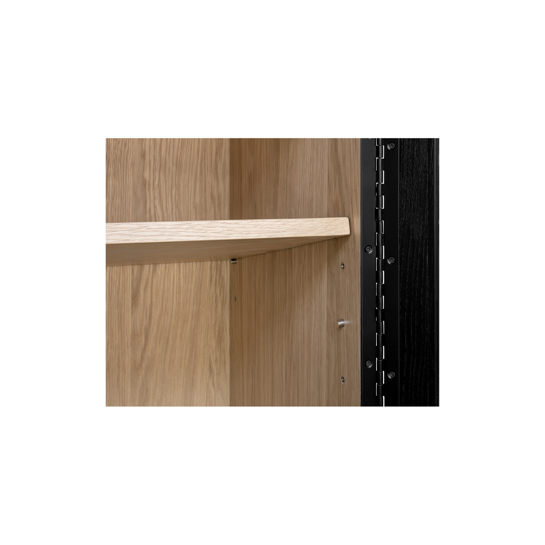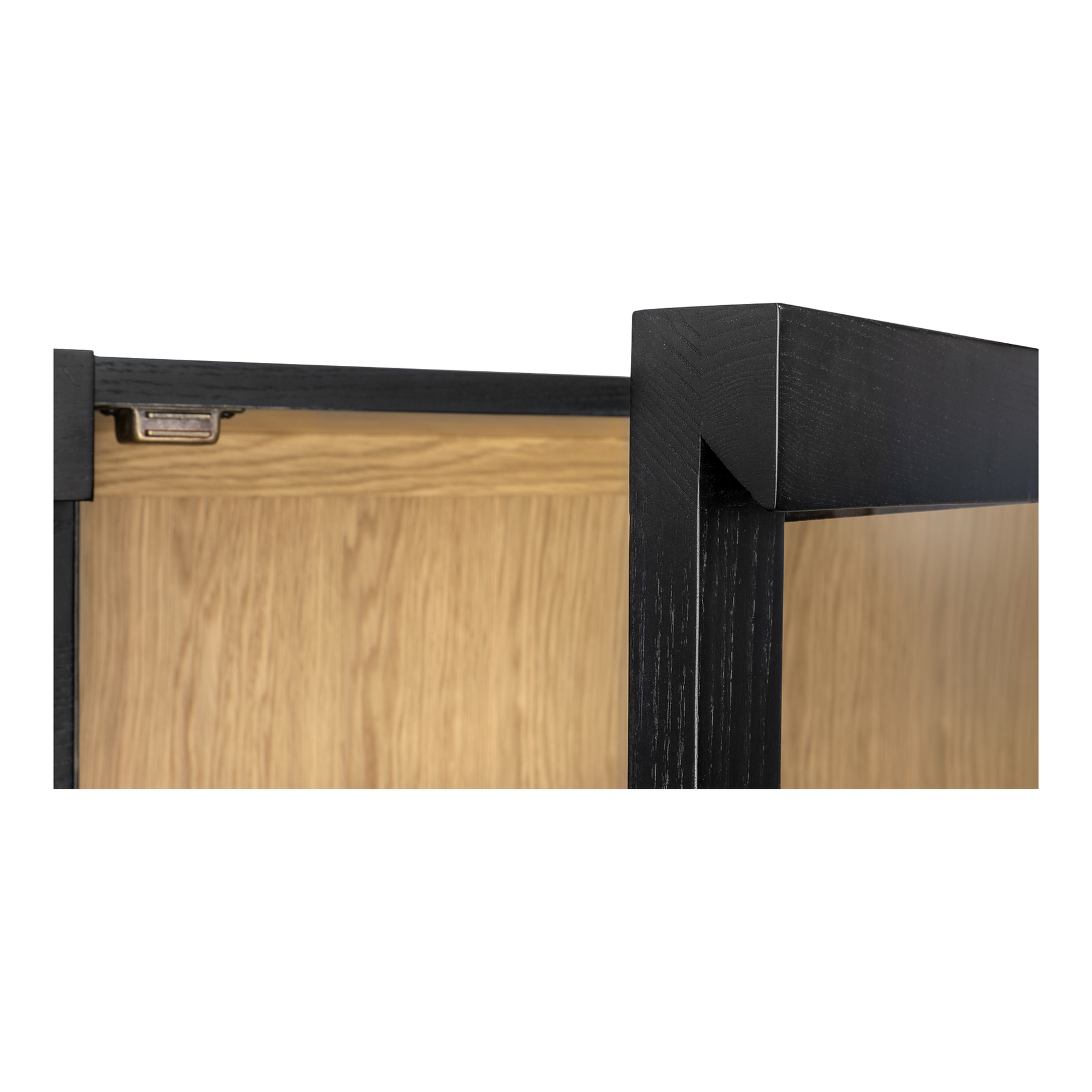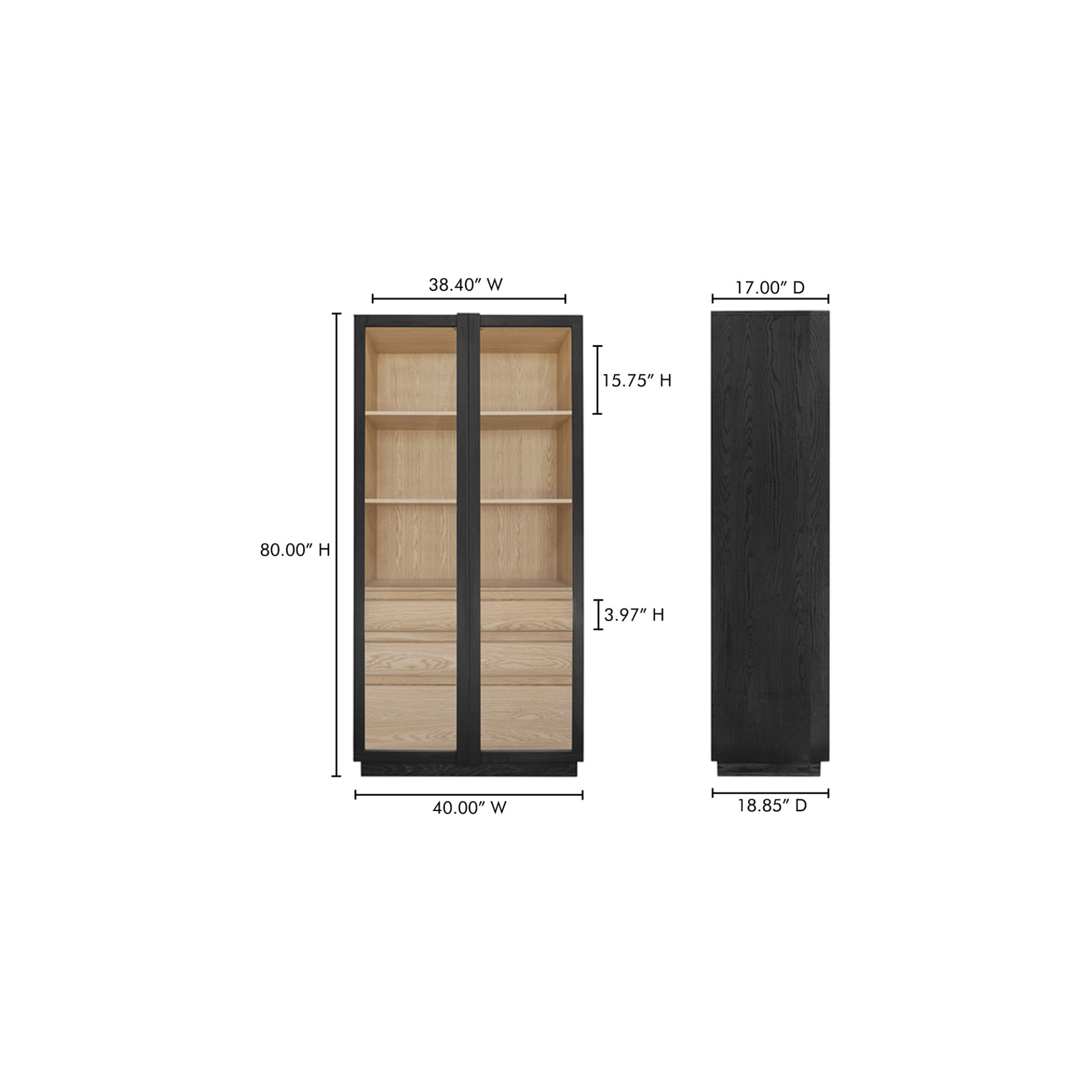 Inspired by the simple elegance of French Cleat handles, the Charlotte Tall Cabinet features a captivating two-tone design with a sleek black outer frame and natural interior. Tempered glass doors offer a stylish, protective showcase, while three interior drawers neatly store smaller belongings. With its modern and versatile design, this piece balances practical storage with graceful display.