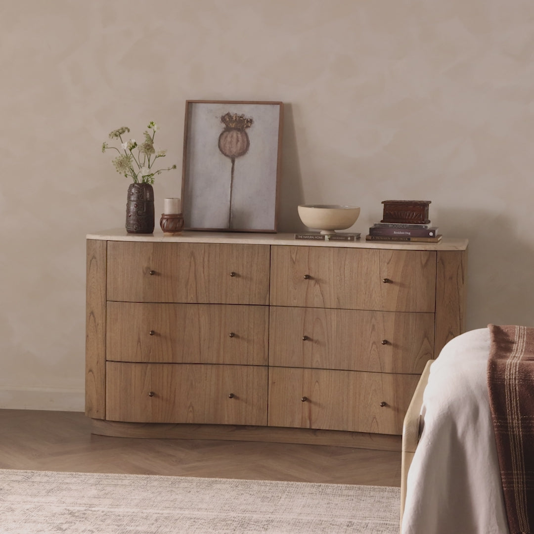Fluid contours give shape to this dresser crafted from sand-finished mindi, topped with a slab of cream-white marble. Six drawers with knobbed pulls open to spacious drawers.
