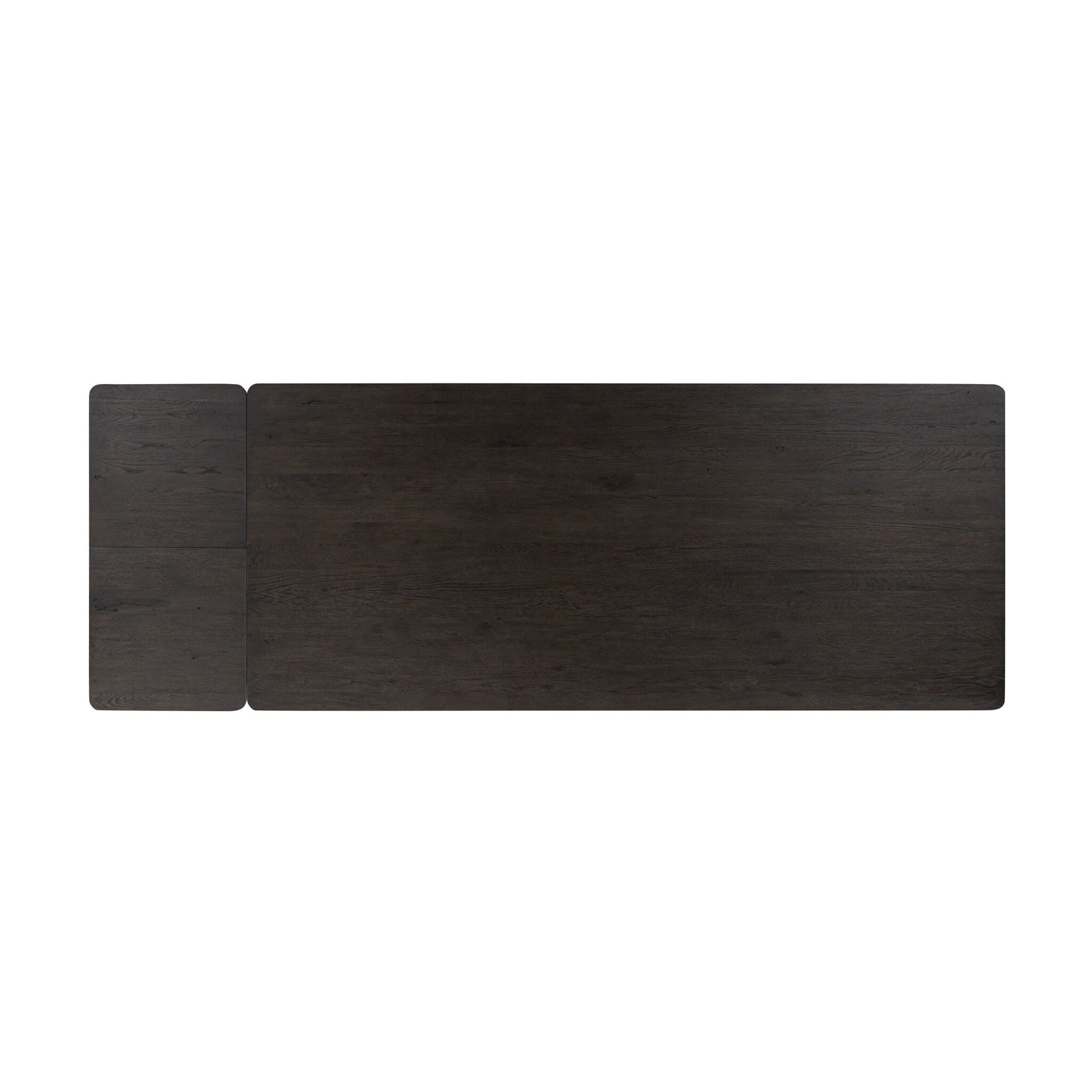 Made from smoked black oak with intentional cracking for an aged look, a self-storing extension creates space for extra guests. Equipped with four lockable wheels for easy extension to 116".