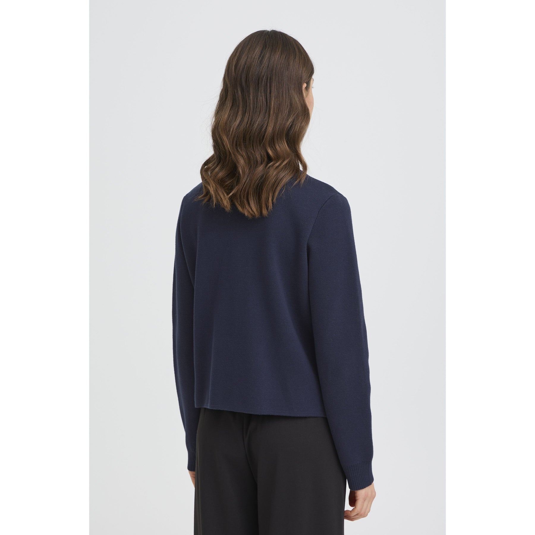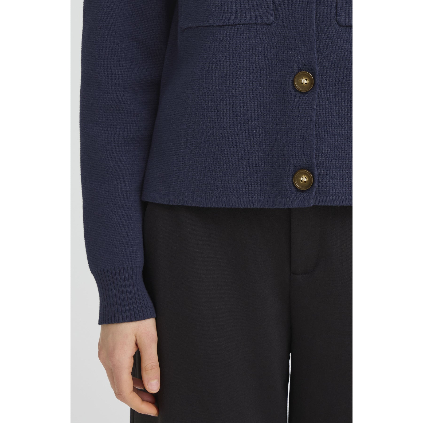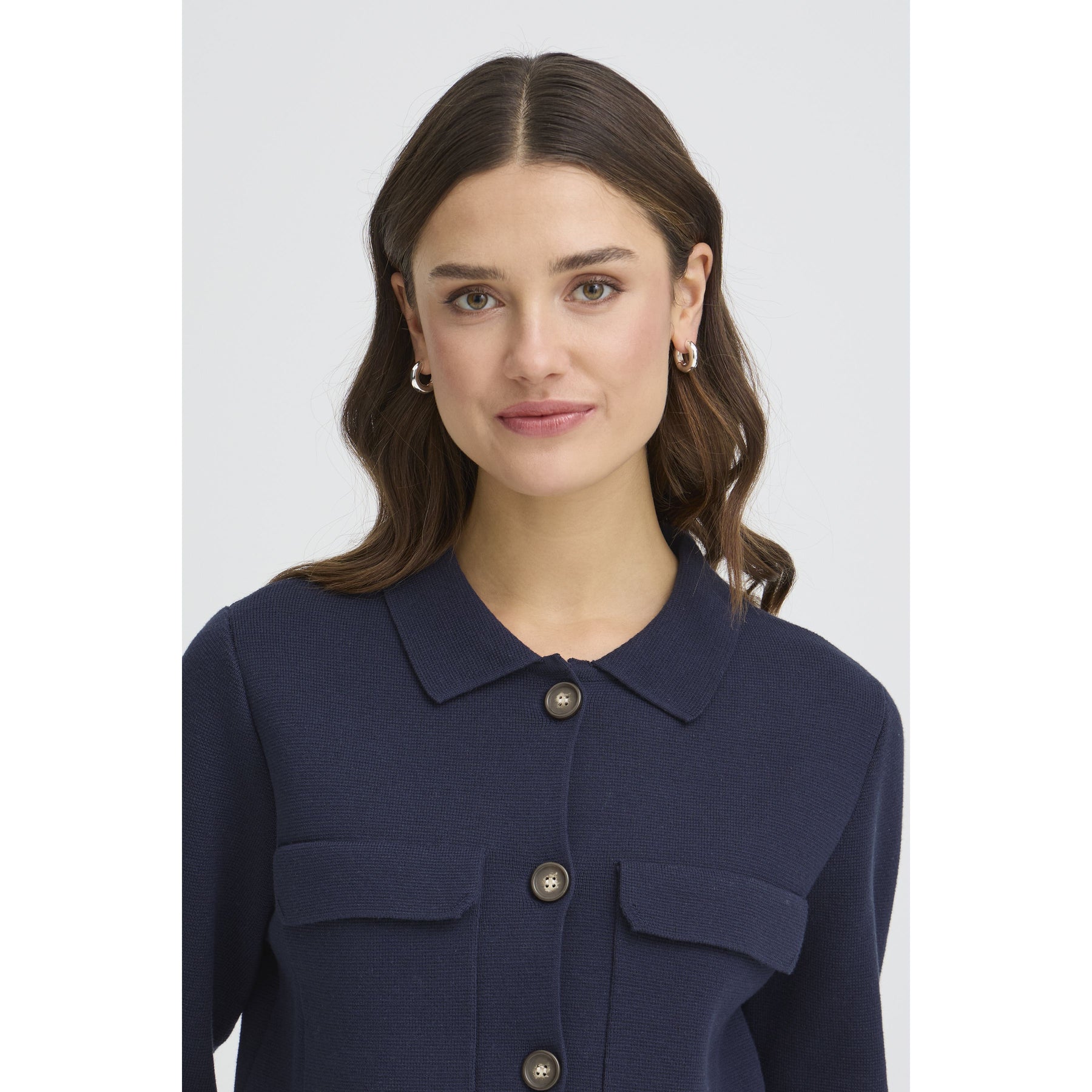 This women's knit jacket features a regular fit, button front, classic collar, and long sleeves. Patch pockets add versatile styling for work or leisure. Comfortable design ensures ease of wear throughout the day.