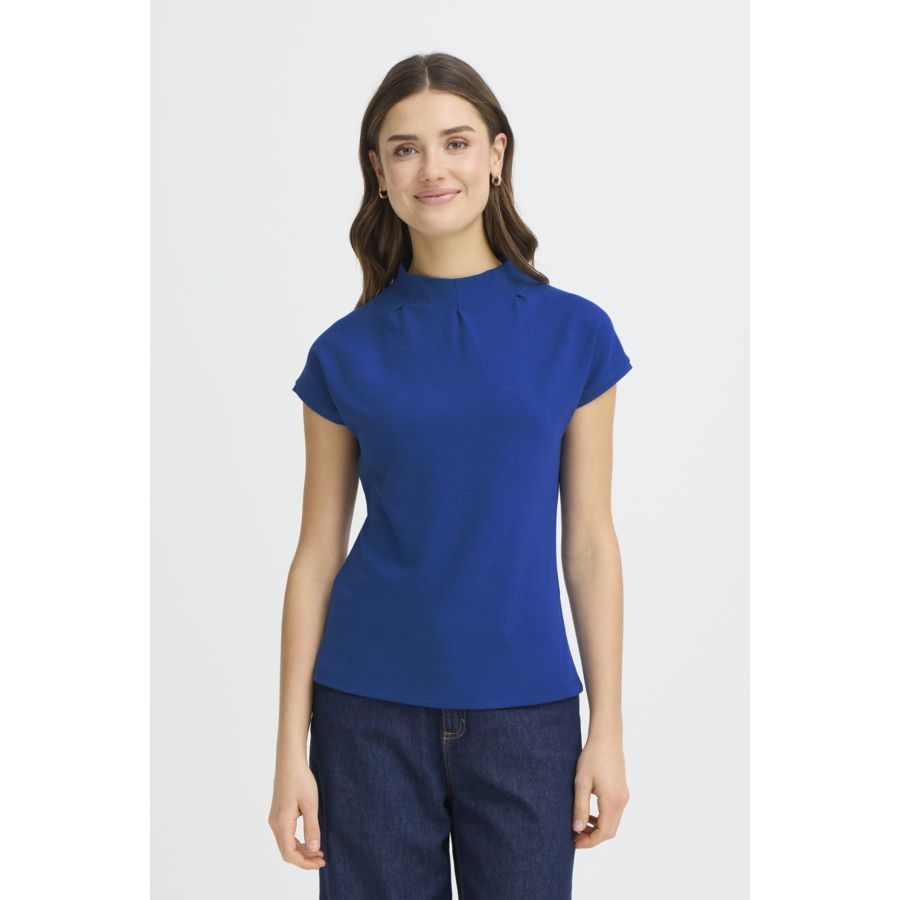 This short sleeve top features a structured mock neck with subtle front pleat and a straight, regular fit. Crafted in a smooth, soft finish for a modern, streamlined silhouette.