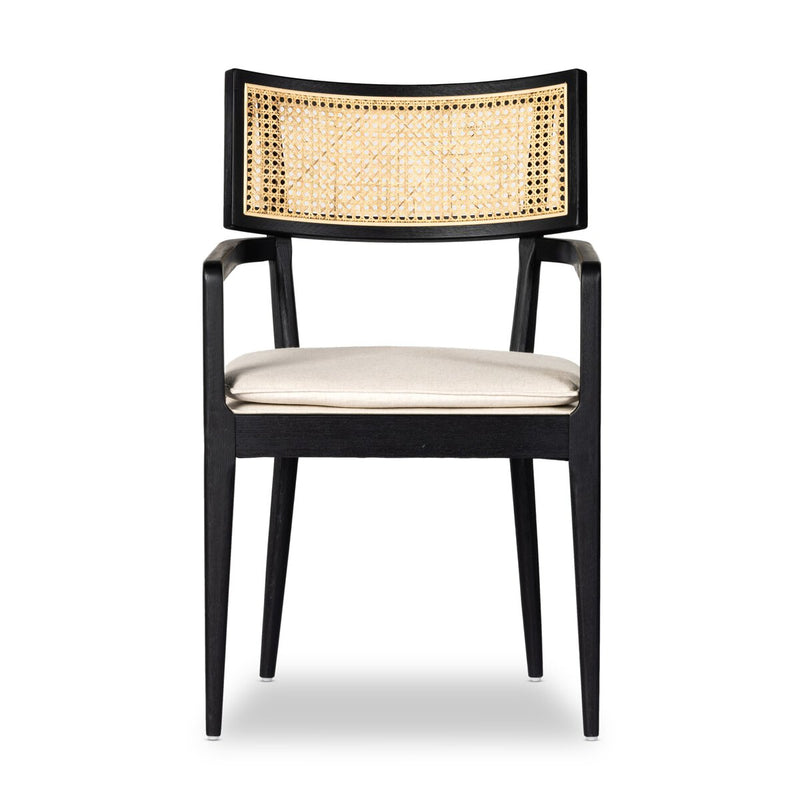 Mixed materials refresh retro dining style. Solid or ebony finished nettlewood frames a textural inlay of natural cane, with Velcro-fastened high-performance seating. Performance fabrics are specially created to withstand spills, stains, high traffic and wear, ensuring long-term comfort and unmatched durability.