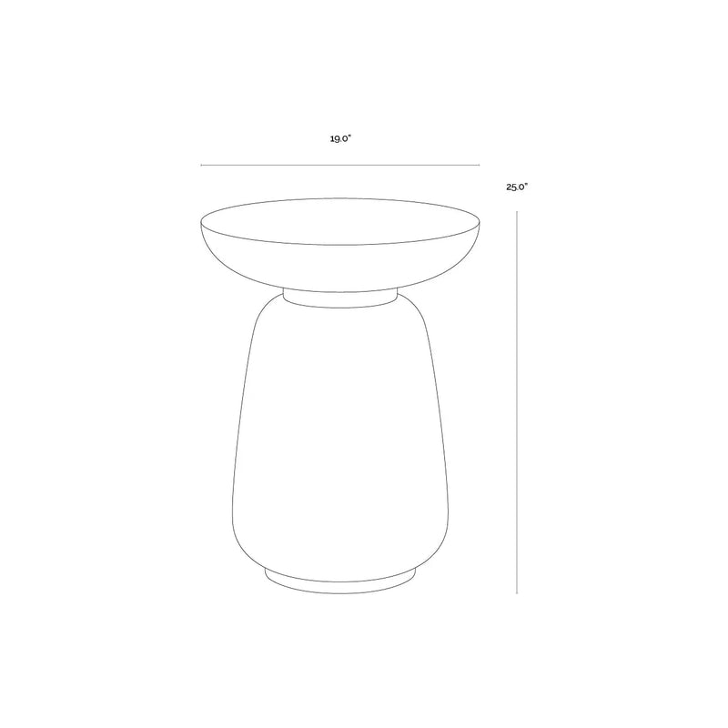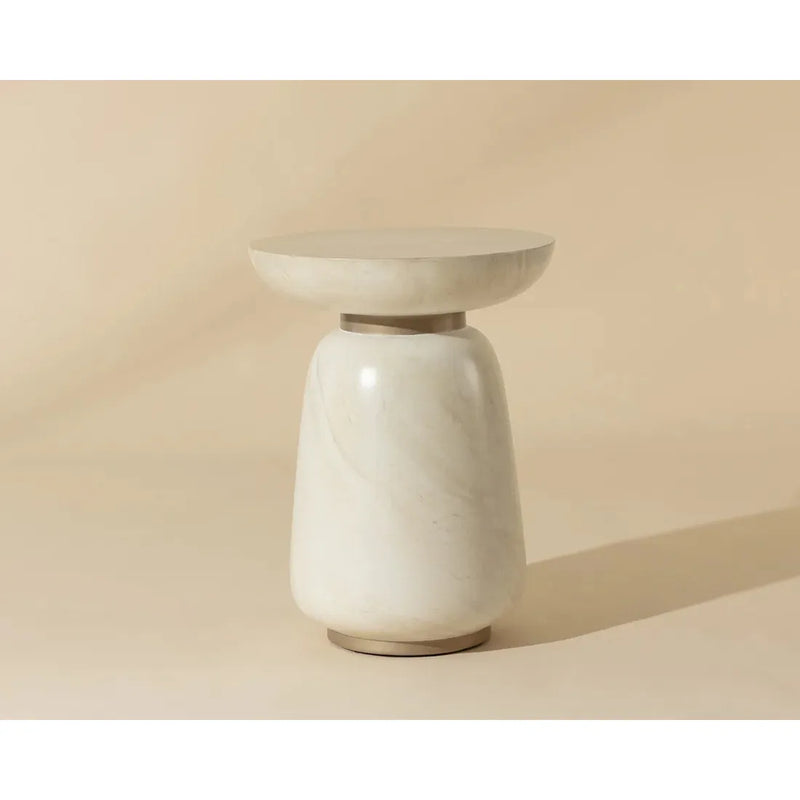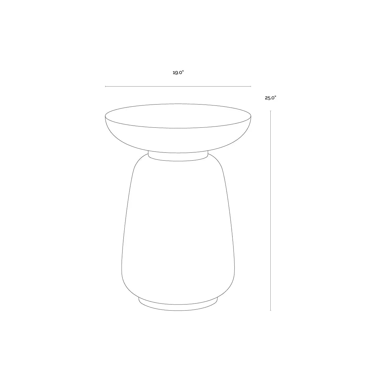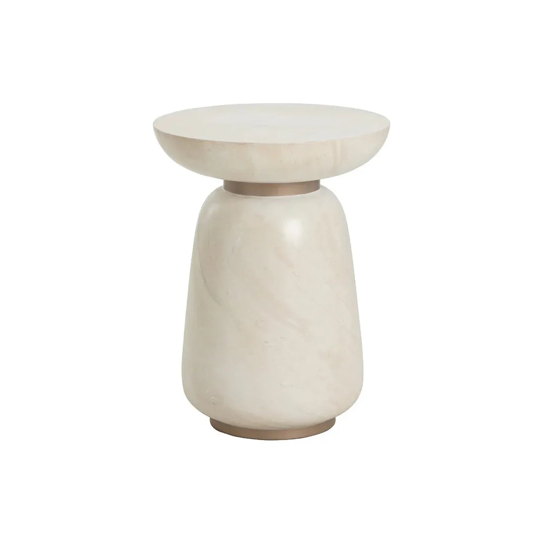 The Harlin Side Table reinterprets contemporary design with refined sophistication. This exquisite piece honors travertine's timeless allure while offering concrete's durability for outdoor settings. Artisans employ an advanced water transfer technique to meticulously replicate travertine's distinctive veining and delicate tonal variations. The elegant silhouette features a graceful cinch—adorned with a hand-painted finish that evokes antique brass—harmoniously coordinating with the distinguished base for a cohesive aesthetic of understated luxury.