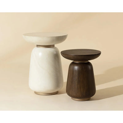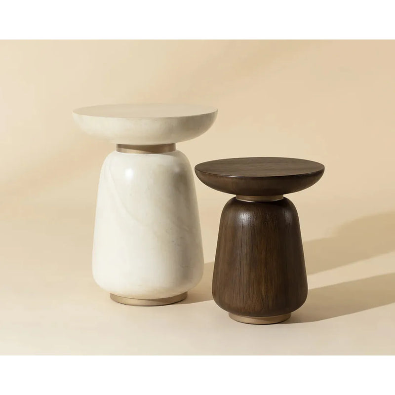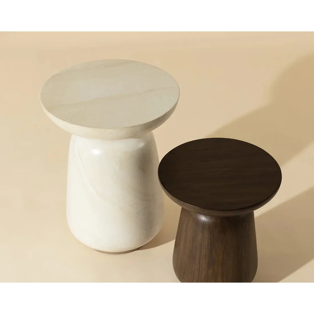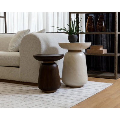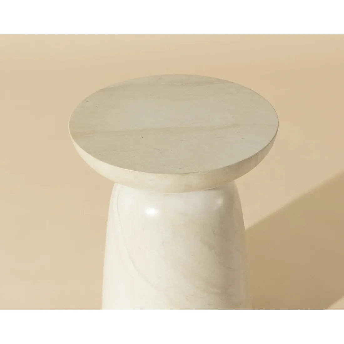 The Harlin Side Table reinterprets contemporary design with refined sophistication. This exquisite piece honors travertine's timeless allure while offering concrete's durability for outdoor settings. Artisans employ an advanced water transfer technique to meticulously replicate travertine's distinctive veining and delicate tonal variations. The elegant silhouette features a graceful cinch—adorned with a hand-painted finish that evokes antique brass—harmoniously coordinating with the distinguished base for a cohesive aesthetic of understated luxury.
