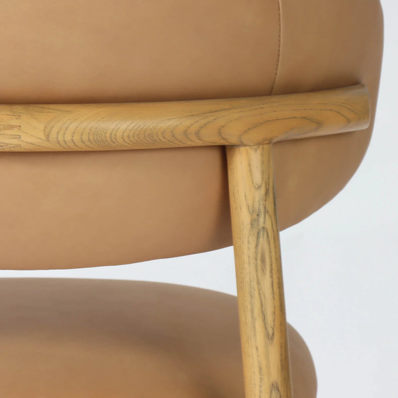 If you are furnishing a beautiful home, restaurant, or hotel - this chair is a great option. Upholstered in a top grain leather with solid Ash wood legs, the amazing curved back will have you not wanting to leave your seat.