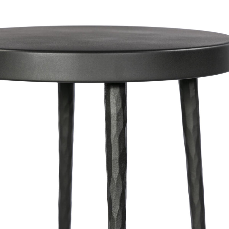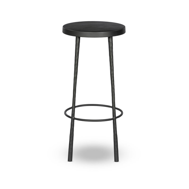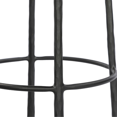 Primitive inspiration leads to a hand-crafted look. Antique brass iron is hand-wrought for rich, rough texture that offsets stool's slender form. Perfect paired or in multiples.