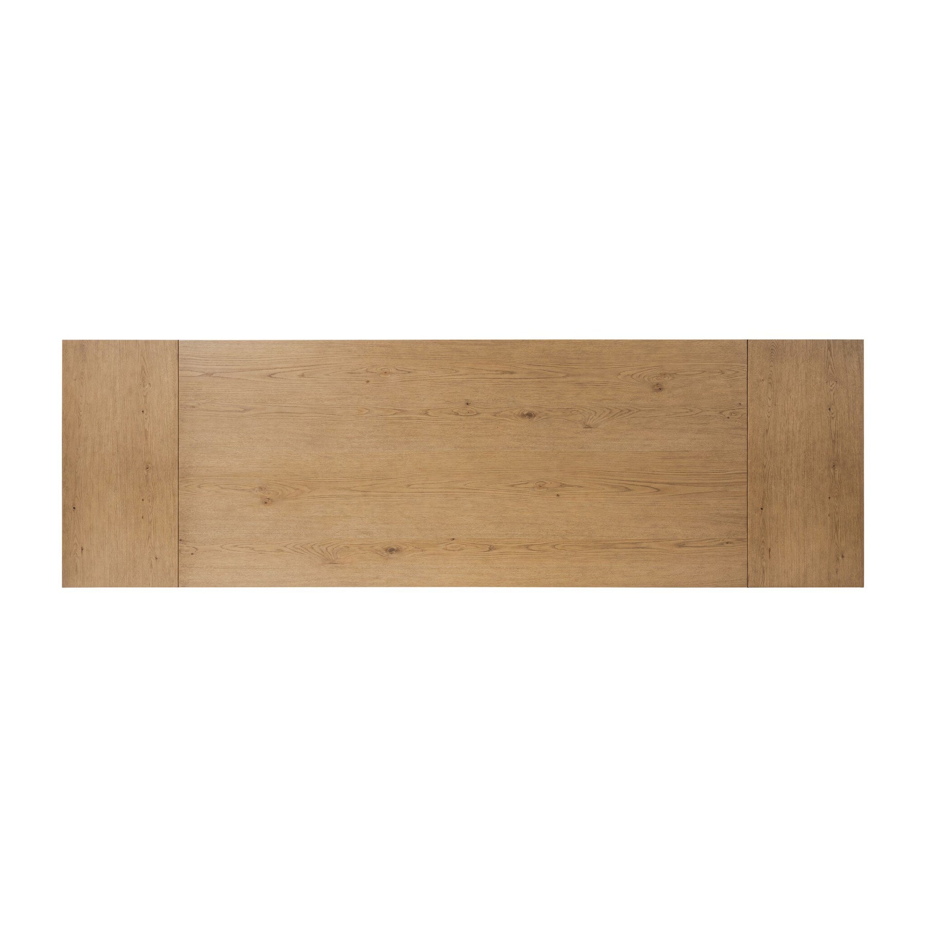Bring a traditional look to the dining room for parties large or small. A turned, tapered base of solid oak support a rectangular tabletop of oak veneer, with a warm, worn finish. On both ends, breadboard extensions provide the option to expand to 124". Ships with screws for extension pieces.