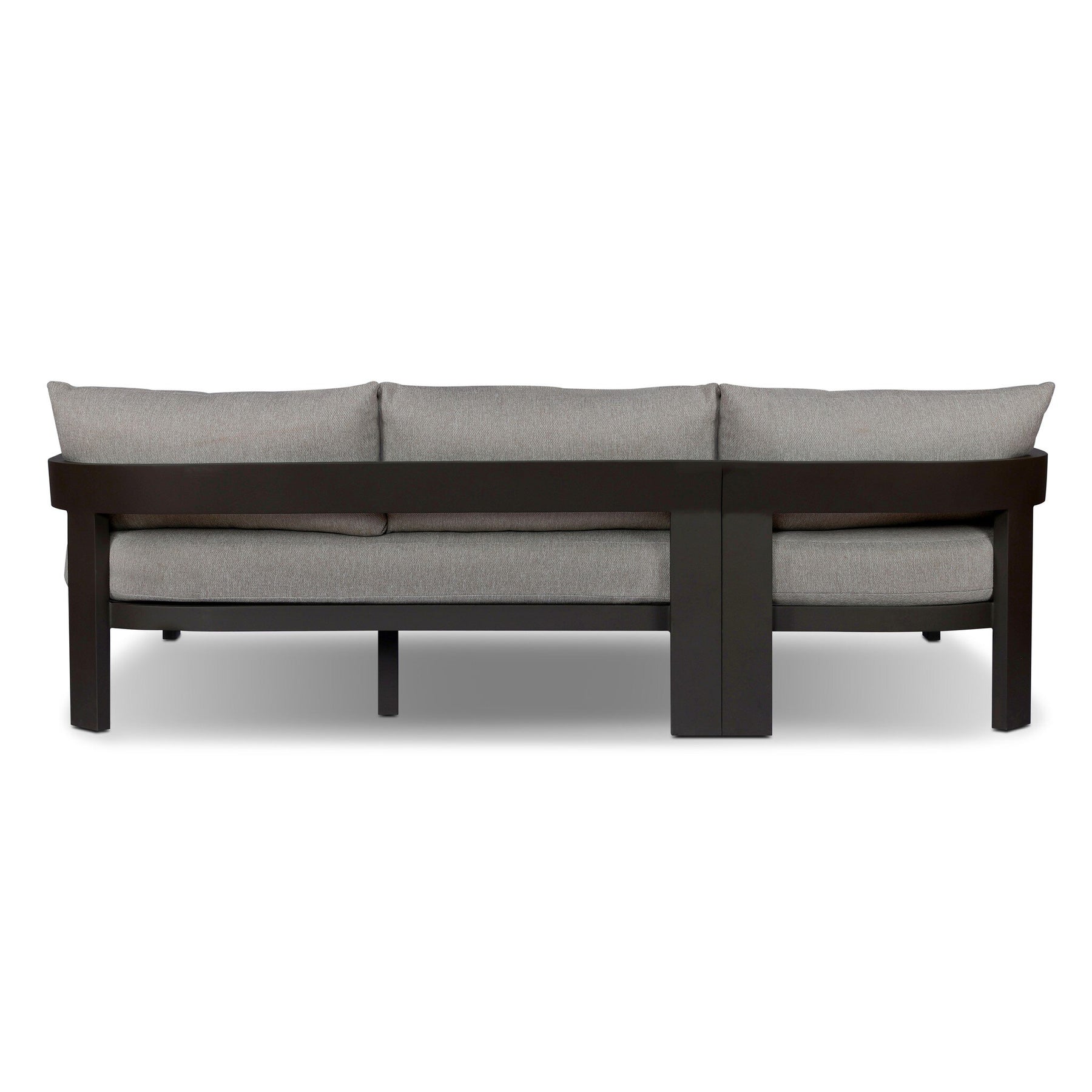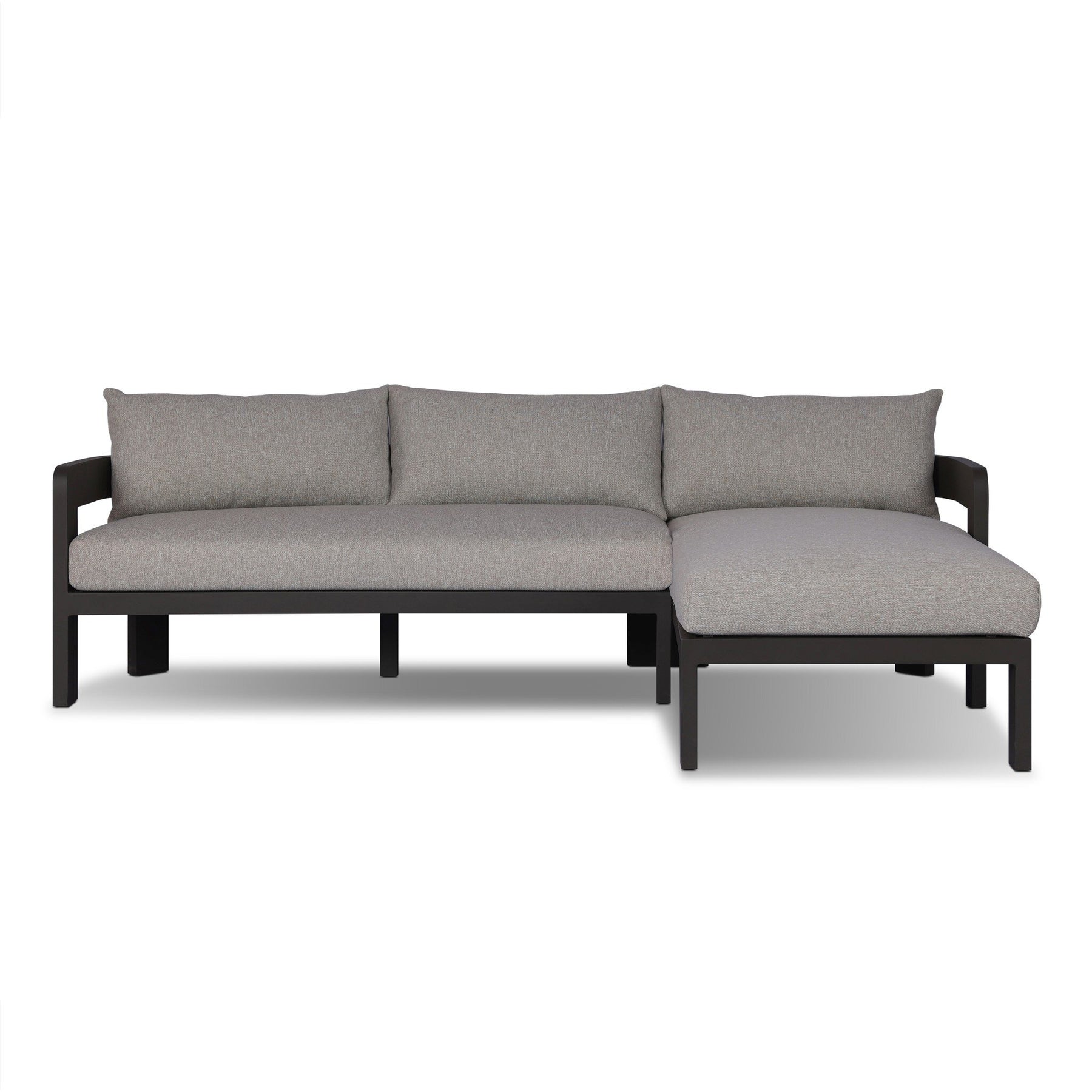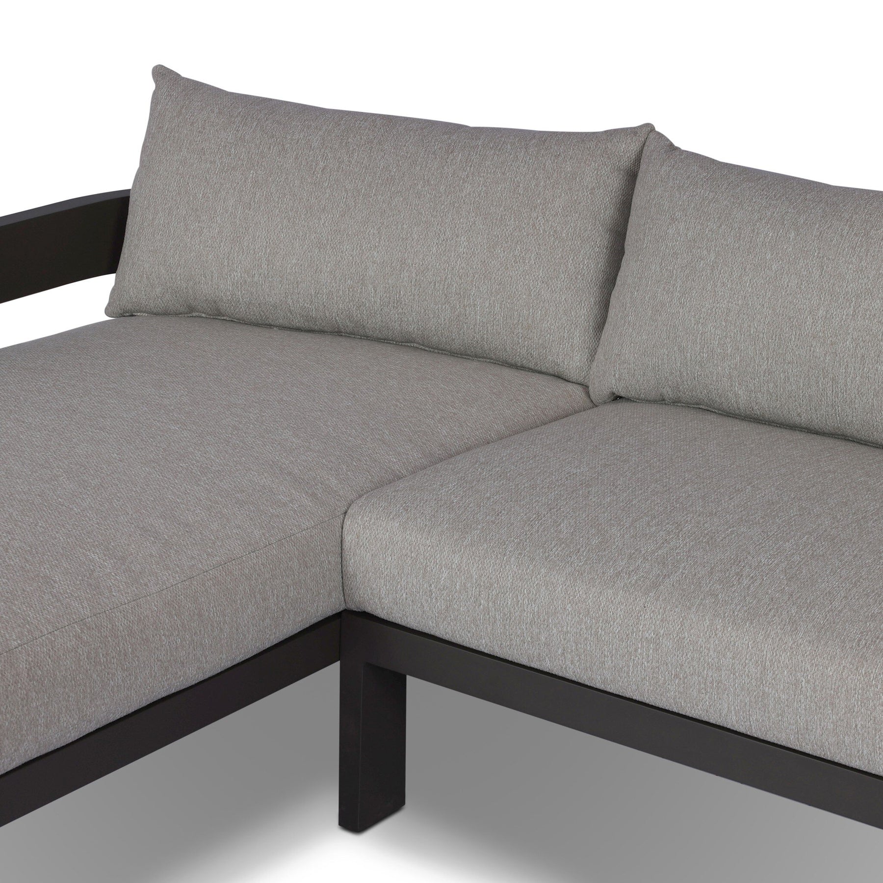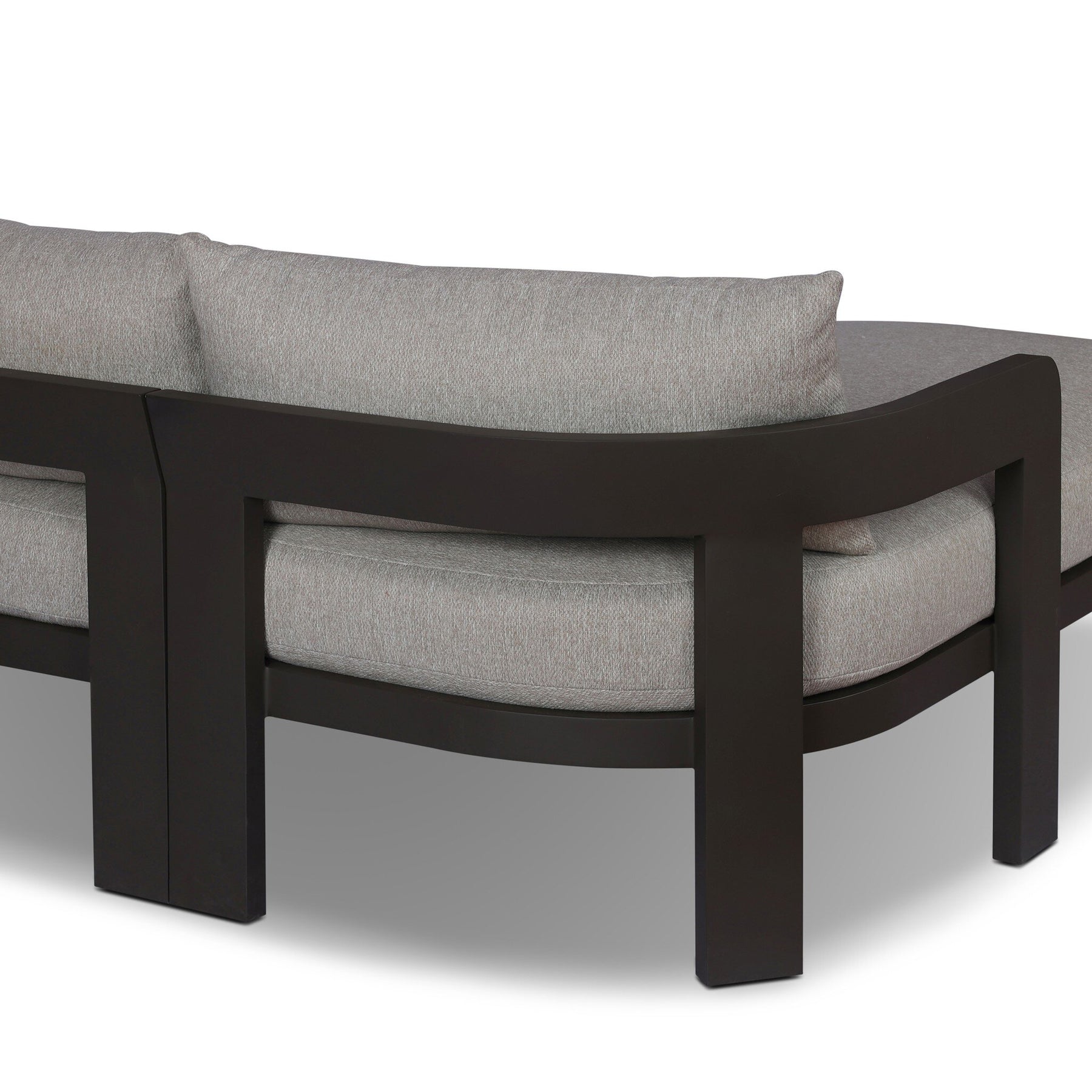 Crisp upholstery and metal framing form a simple barrel back outdoor sectional, complemented by softened edges and a fluid shape for a classic look. Cover or store inside during inclement weather and when not in use.