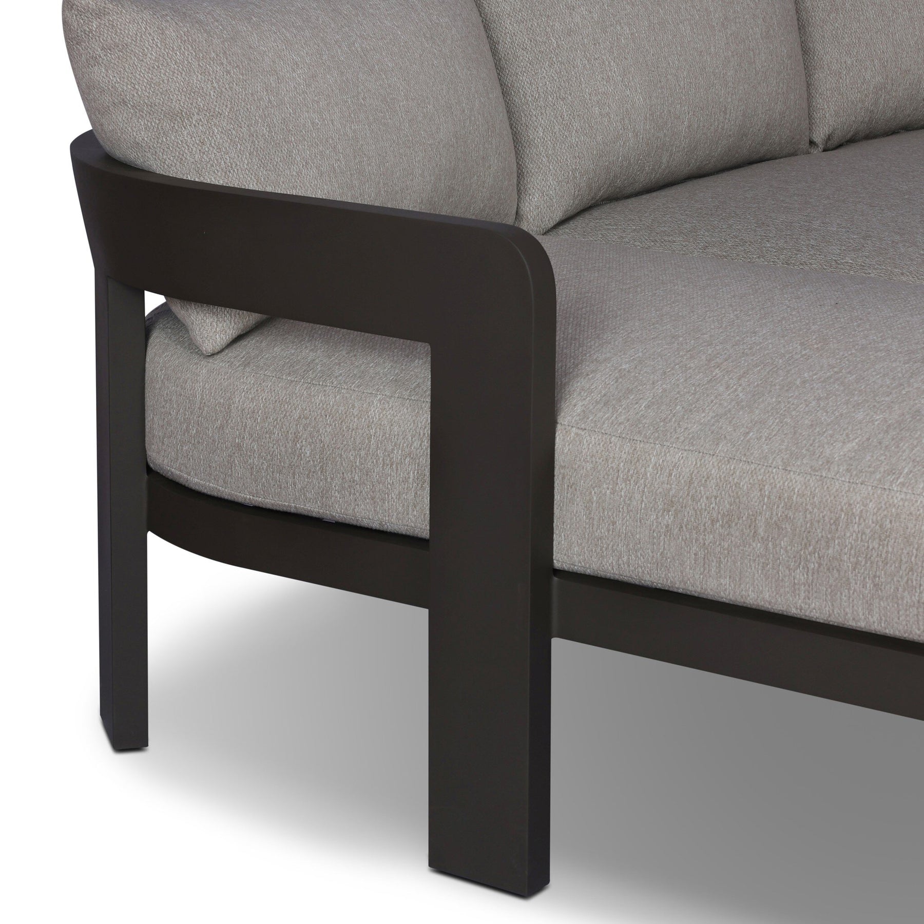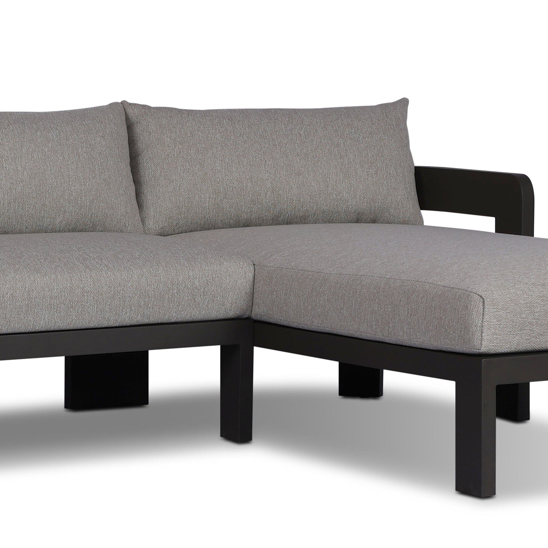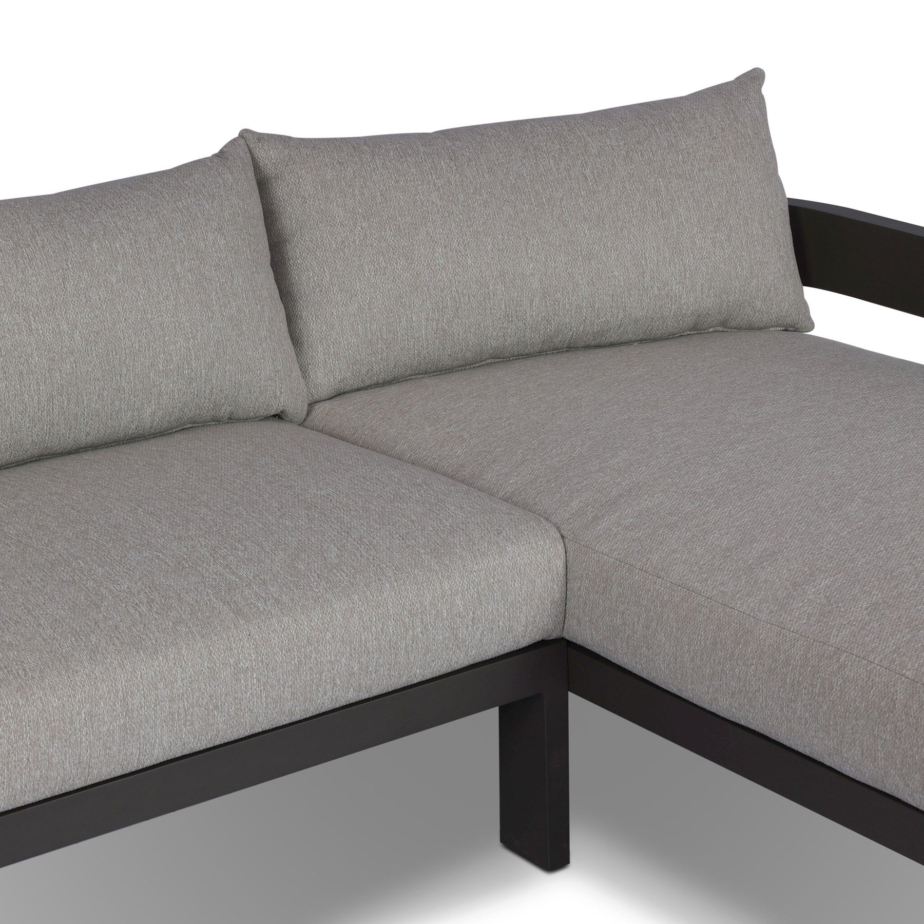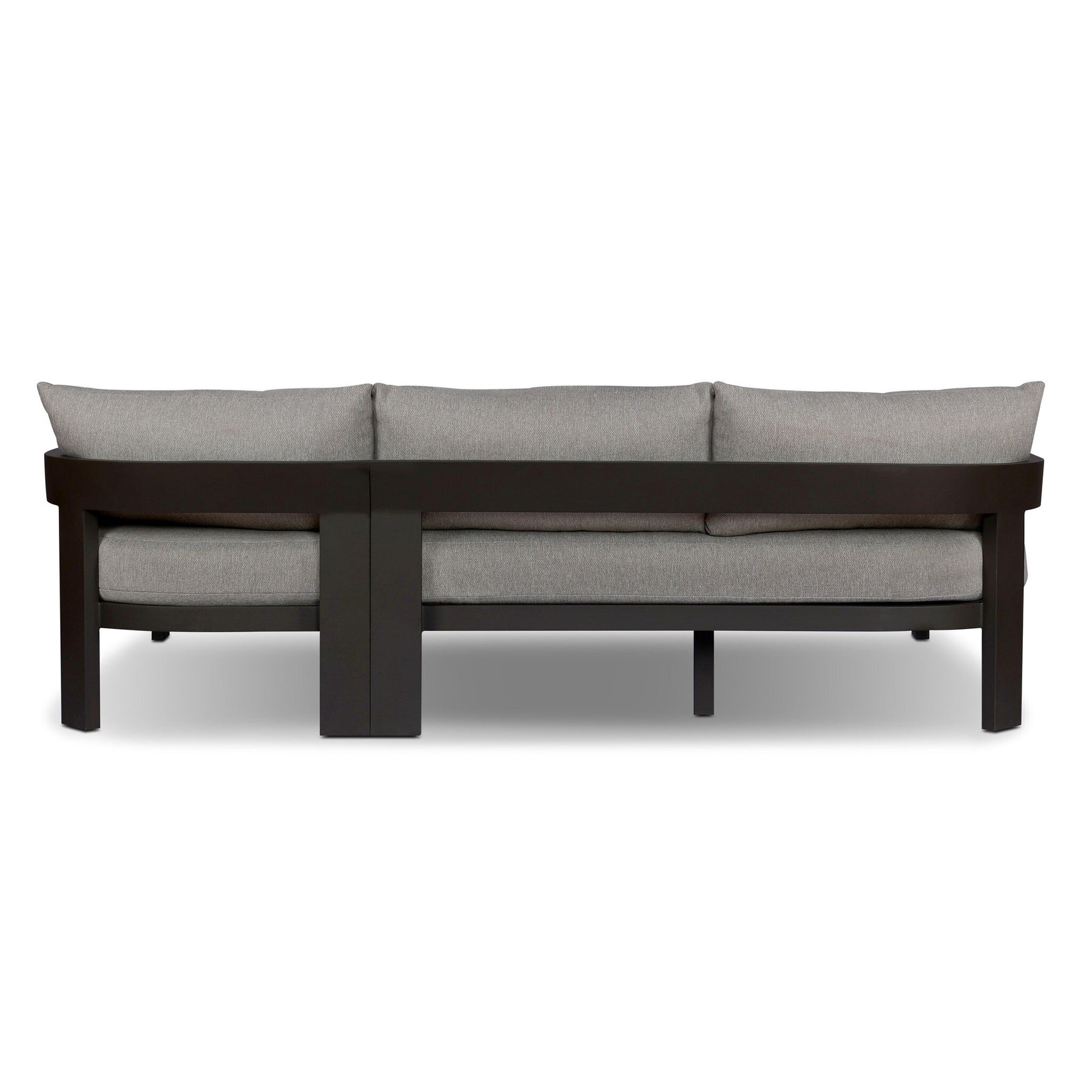 Crisp upholstery and metal framing form a simple barrel back outdoor sectional, complemented by softened edges and a fluid shape for a classic look. Cover or store inside during inclement weather and when not in use.