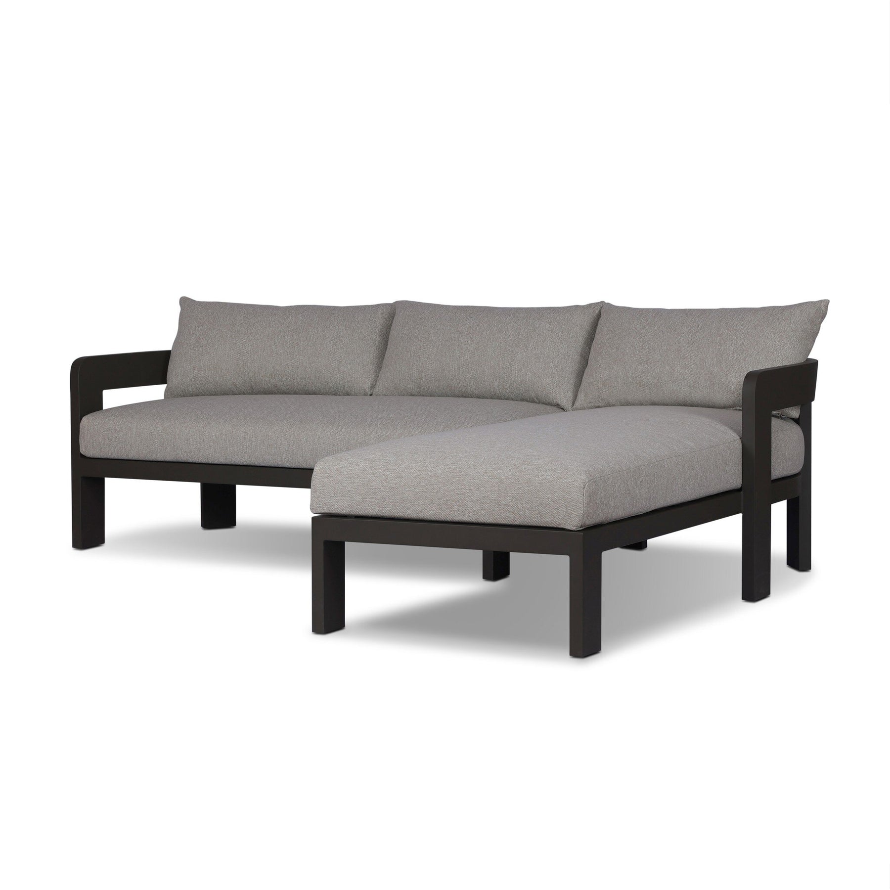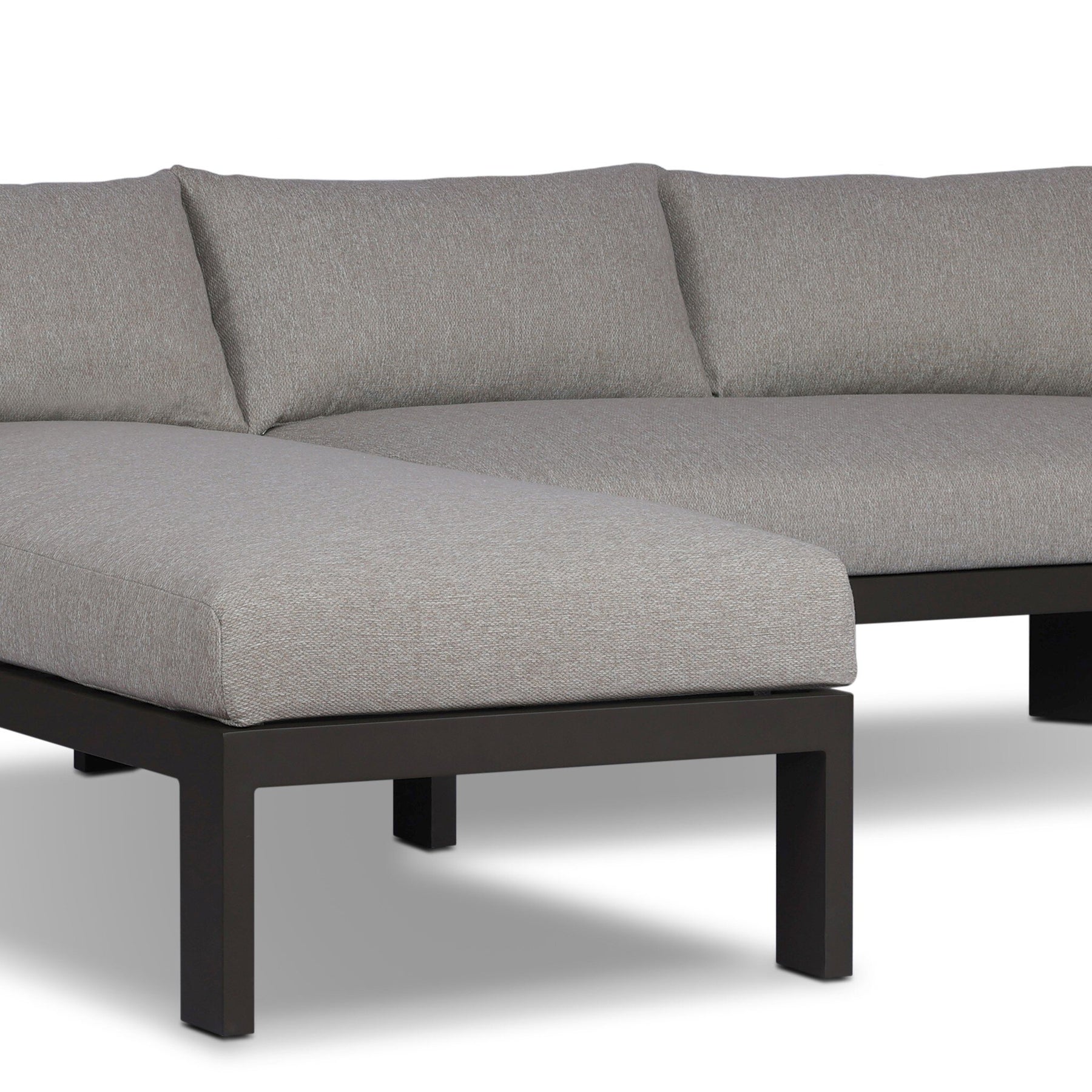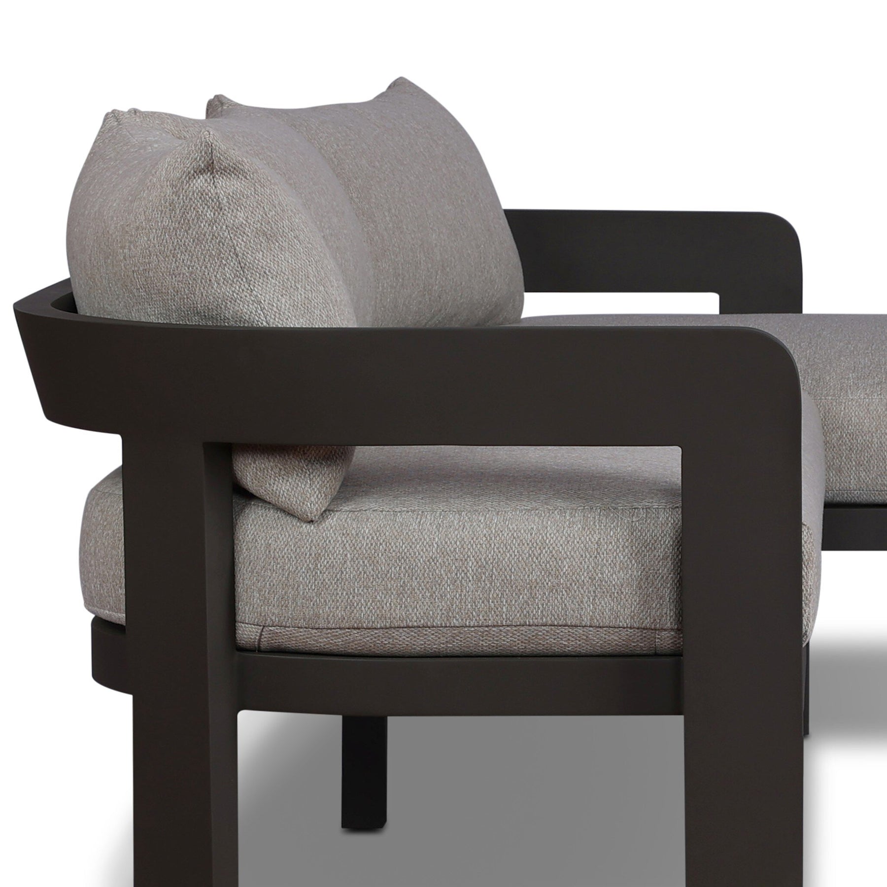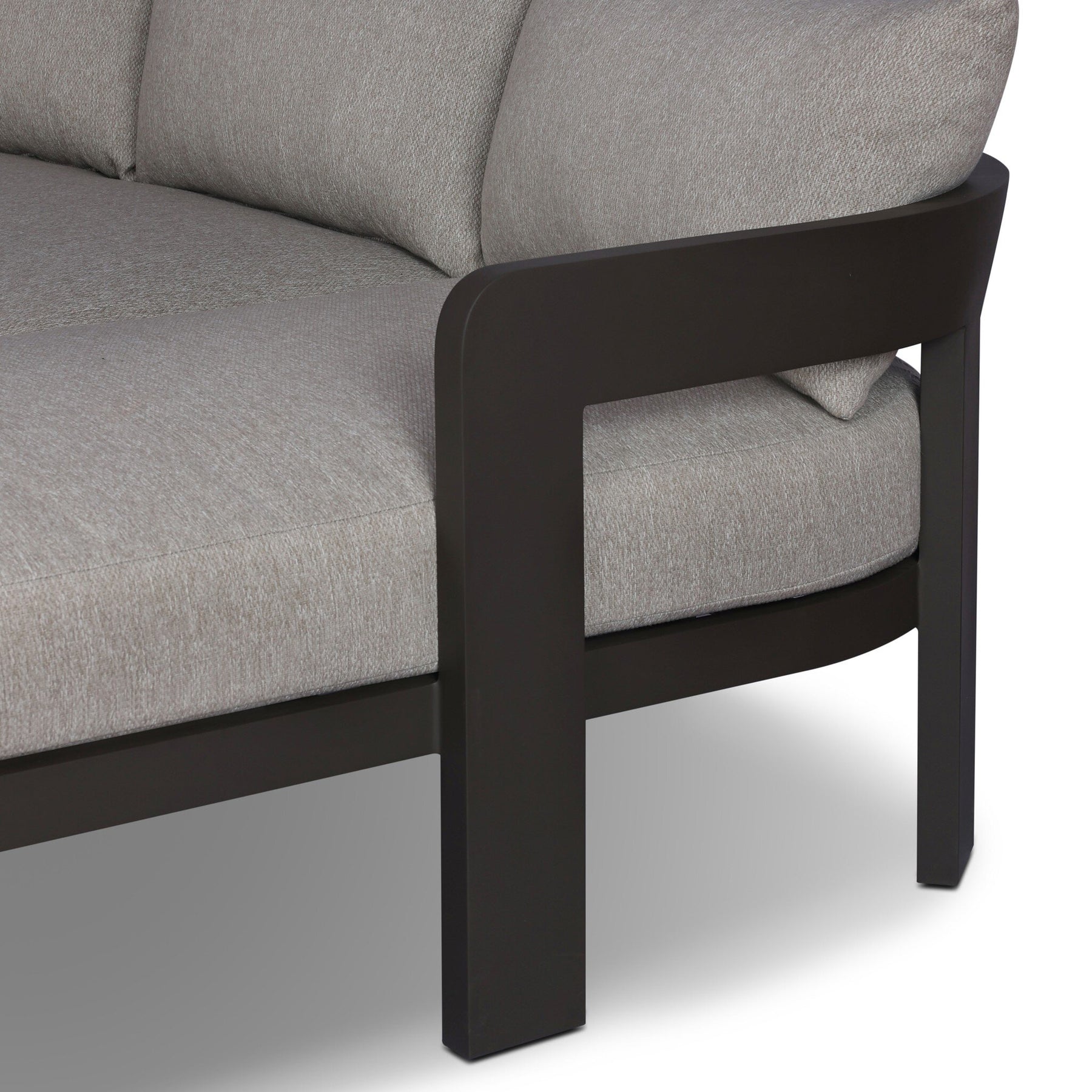 Crisp upholstery and metal framing form a simple barrel back outdoor sectional, complemented by softened edges and a fluid shape for a classic look. Cover or store inside during inclement weather and when not in use.