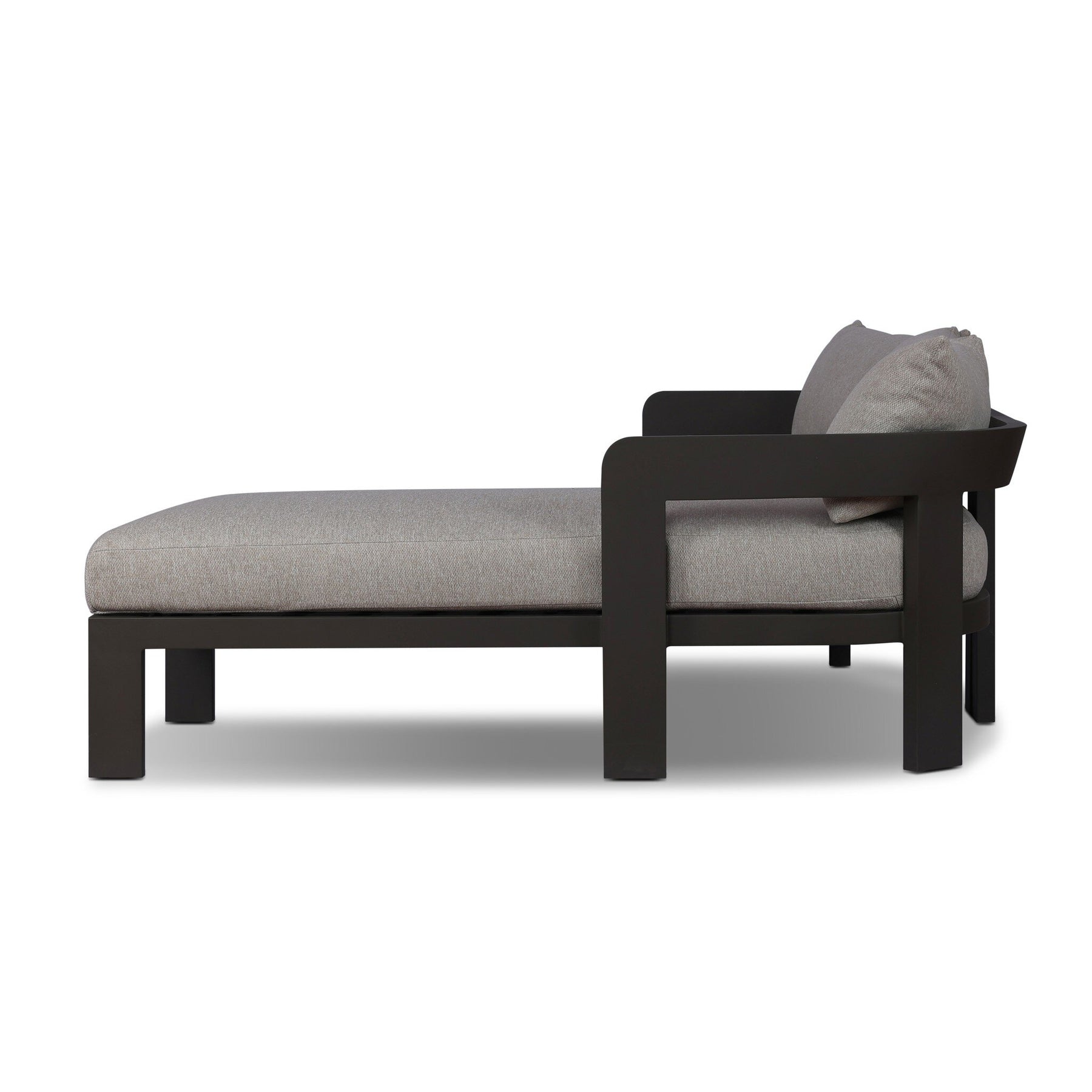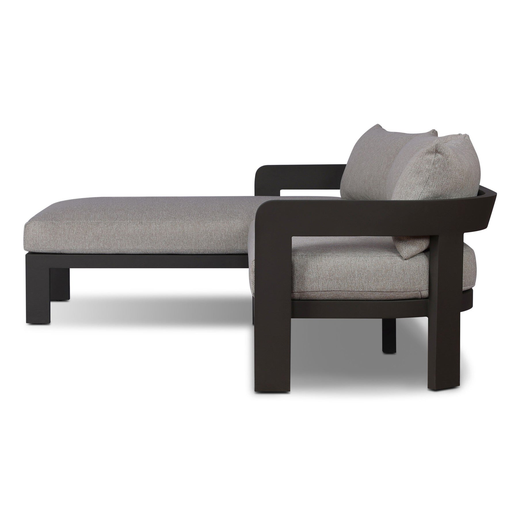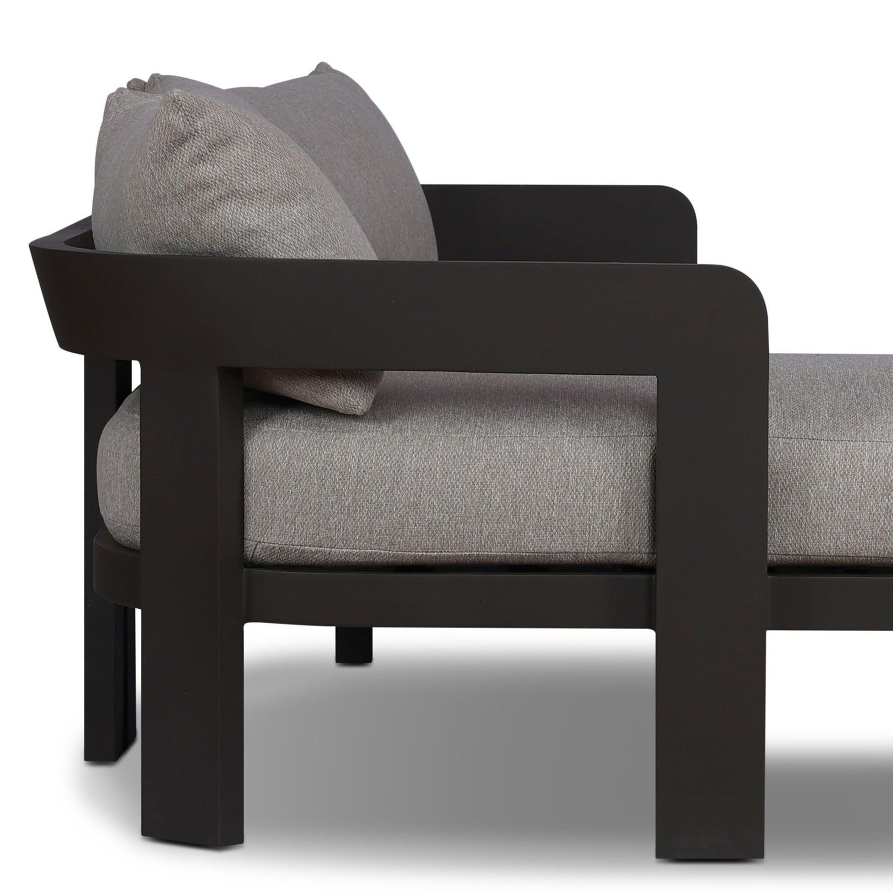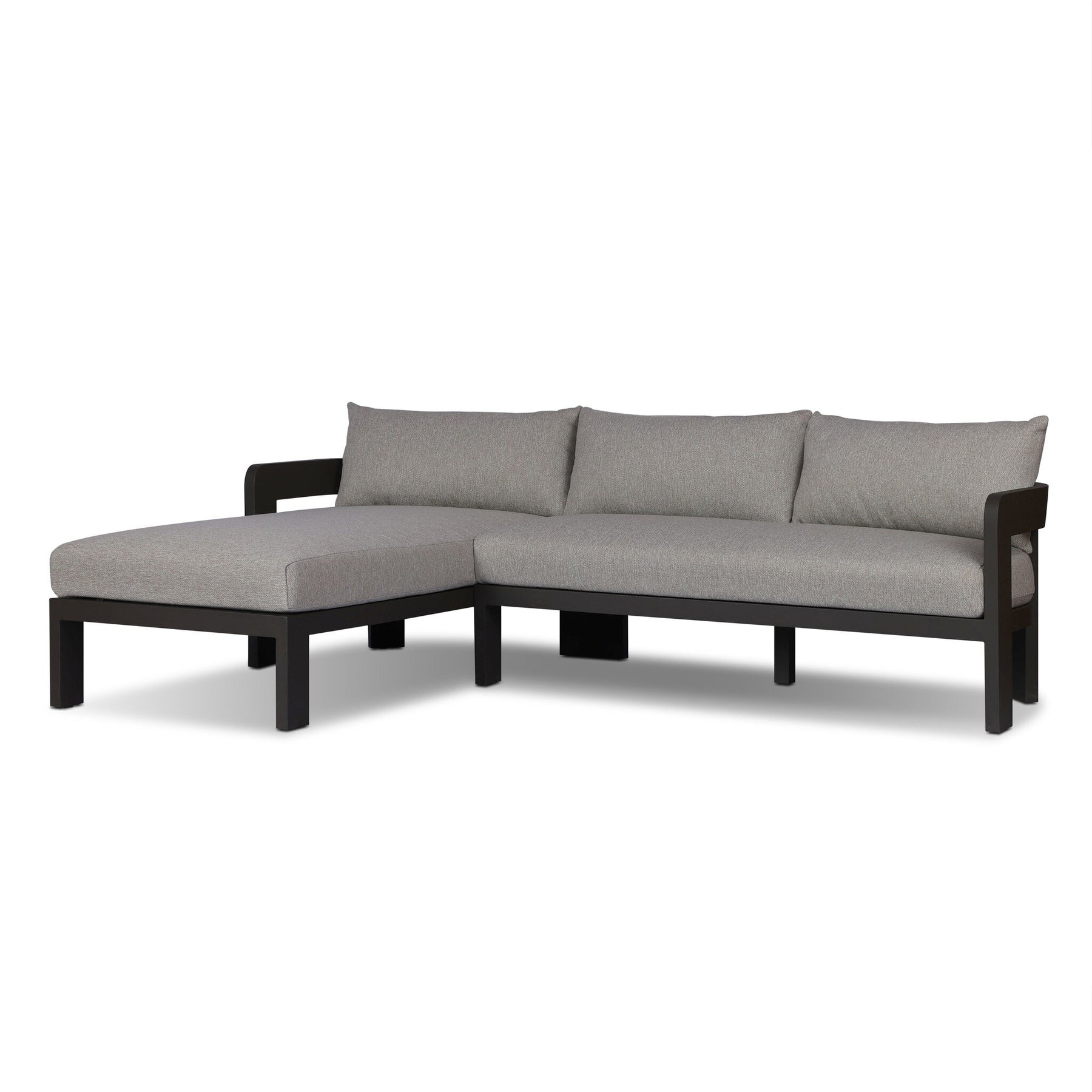 Crisp upholstery and metal framing form a simple barrel back outdoor sectional, complemented by softened edges and a fluid shape for a classic look. Cover or store inside during inclement weather and when not in use.