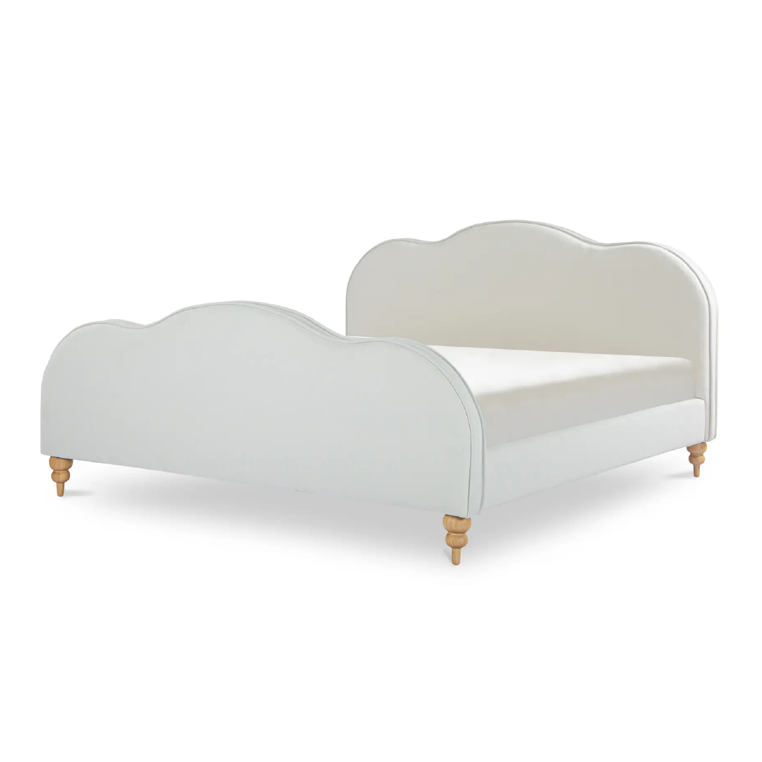 The Jacqueline bed embraces a Provençal-inspired design with a gently waved headboard and footboard, fully upholstered in cream. Geometric stacked legs of solid ash add a contemporary twist to traditional charm. Meticulously crafted with a padded headboard, this bed offers both comfort and durability, transforming the bedroom into a haven of tranquility.