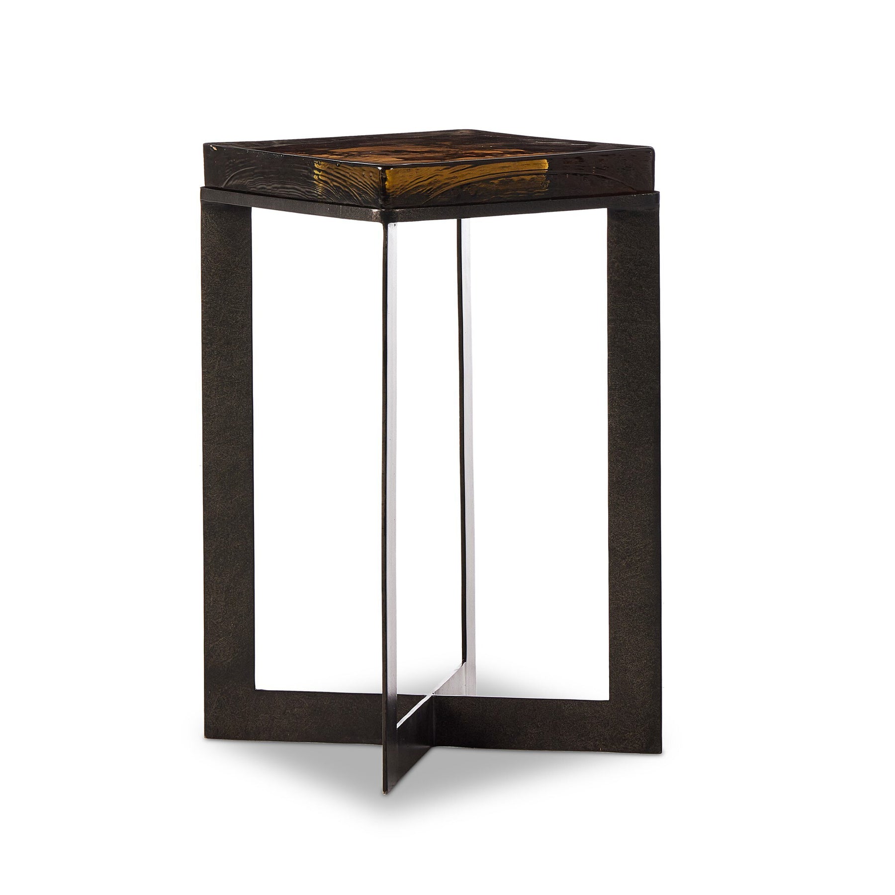 An airy, angular base of charcoal-burnished iron supports a squared tabletop of amber cast glass, perfectly sized to keep your drink or book within reach.