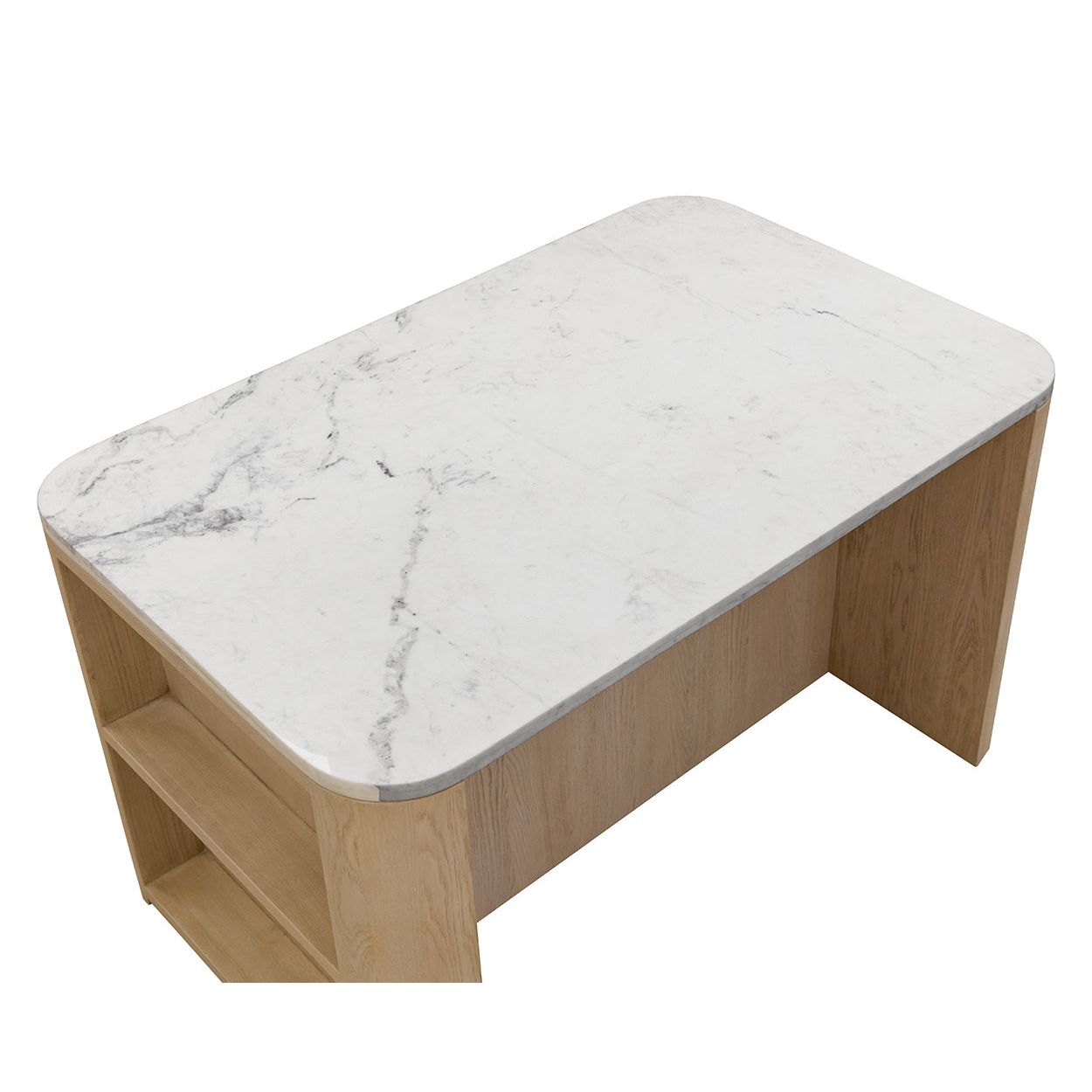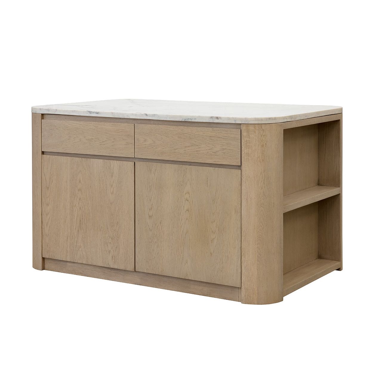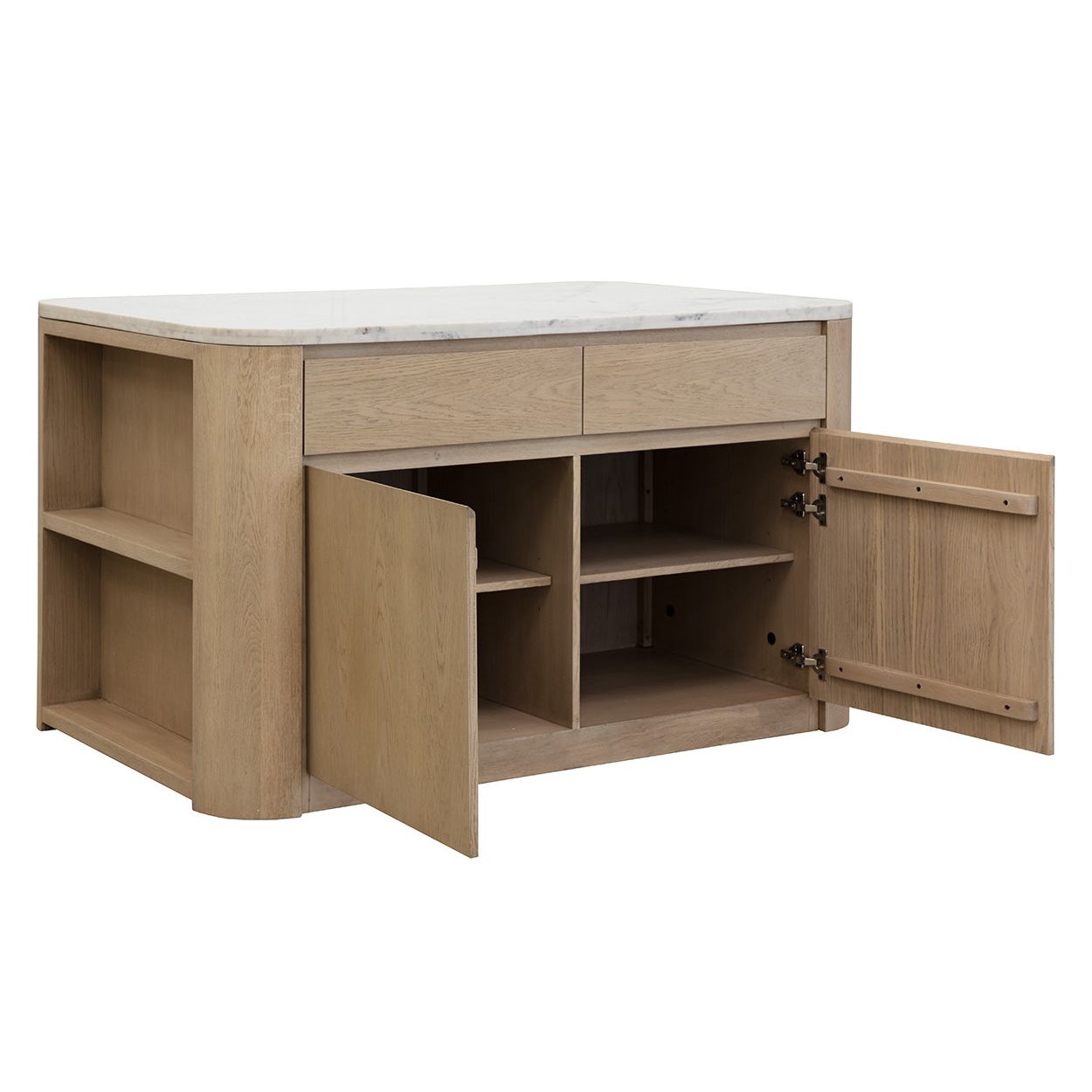 Designed to elevate everyday rituals, the Romilly Kitchen Island pairs a rounded rectangular silhouette with a Banswara marble top and warm oak wood base. Thoughtful open shelving and discreet soft-close drawers make it as practical as it is poised. Whether used in the kitchen or reimagined as a workspace, Romilly adapts effortlessly across any setting.