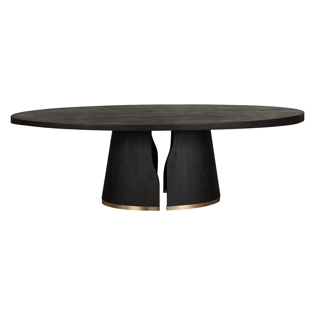 The Tasmin Dining Table brings sculptural elegance to modern dining spaces. Crafted from solid acacia wood, its dual pedestal base draws the eye with softly flared silhouettes. A brushed gold trim along the base offers a subtle hint of glamour.