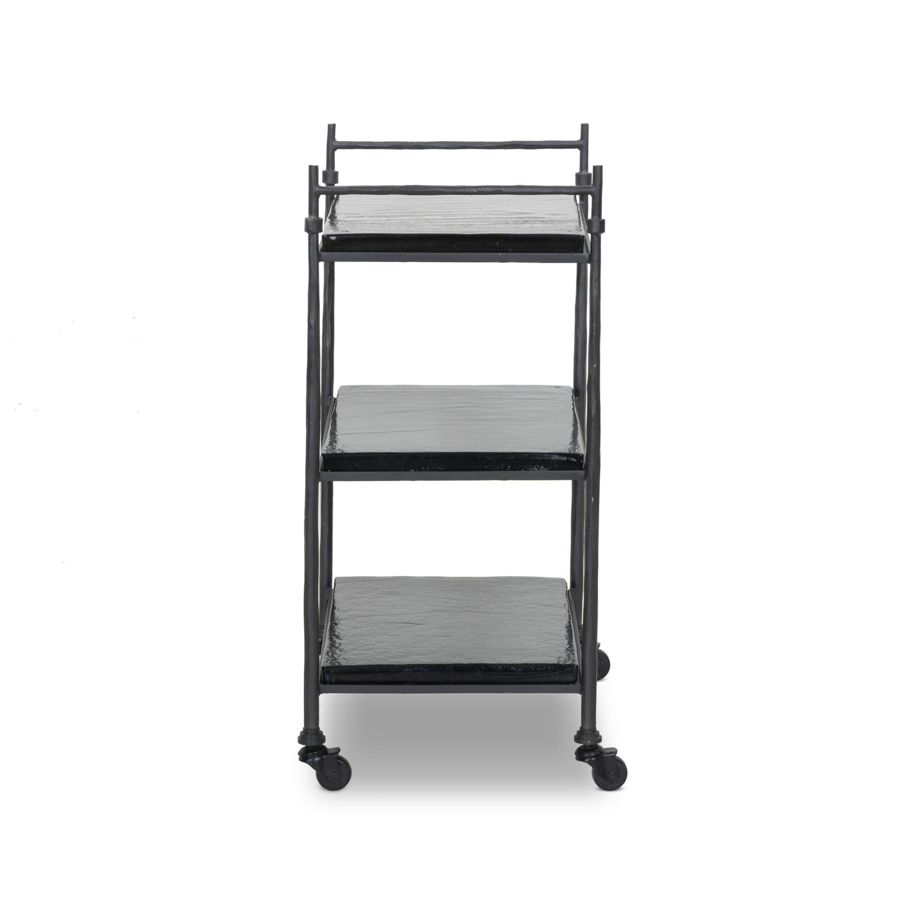 Elevate cocktail hour with an always-in-style rolling bar cart. Crafted from black hammered metal with three tiers of smoked cast glass, offering smooth surface space for storage and display.