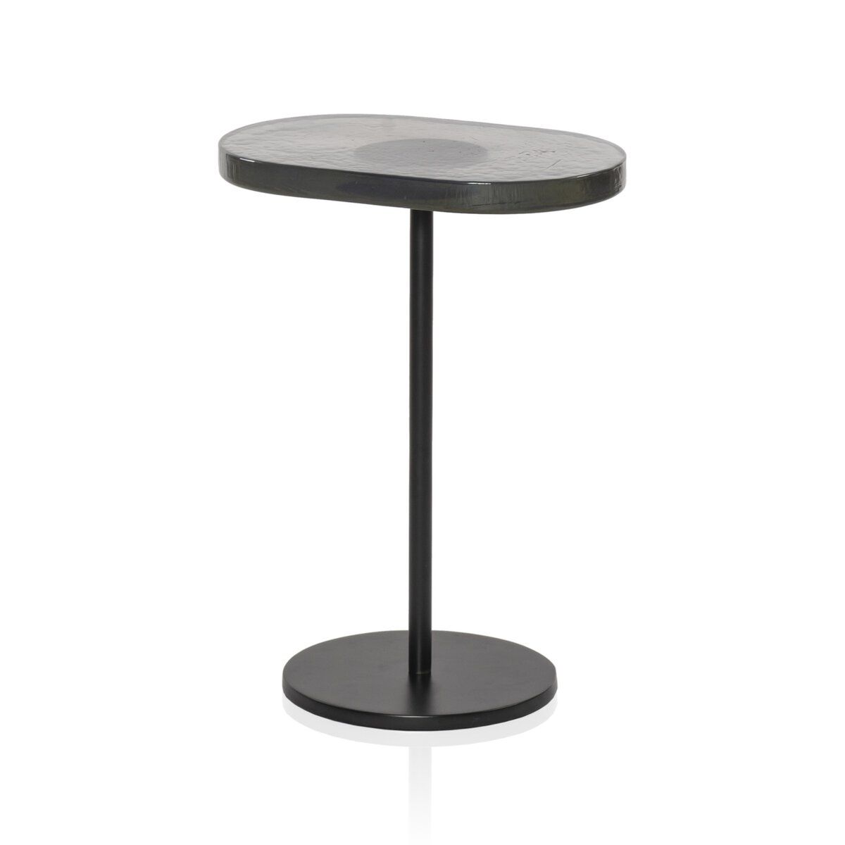 A slim-profile end table pairs a simple iron base with an oval tabletop of hand-cast recycled glass in a soft, smoky blue.