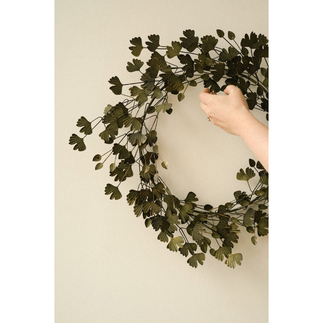 Add a touch of botanical elegance to your home with the Ginkgo Metal Wreath. Handcrafted from sturdy iron, this wreath showcases delicate ginkgo leaves with a green patina finish, offering a refined and timeless charm. Perfect for indoor styling, it enhances walls, doors, or mantels with its sculptural beauty and versatile design.