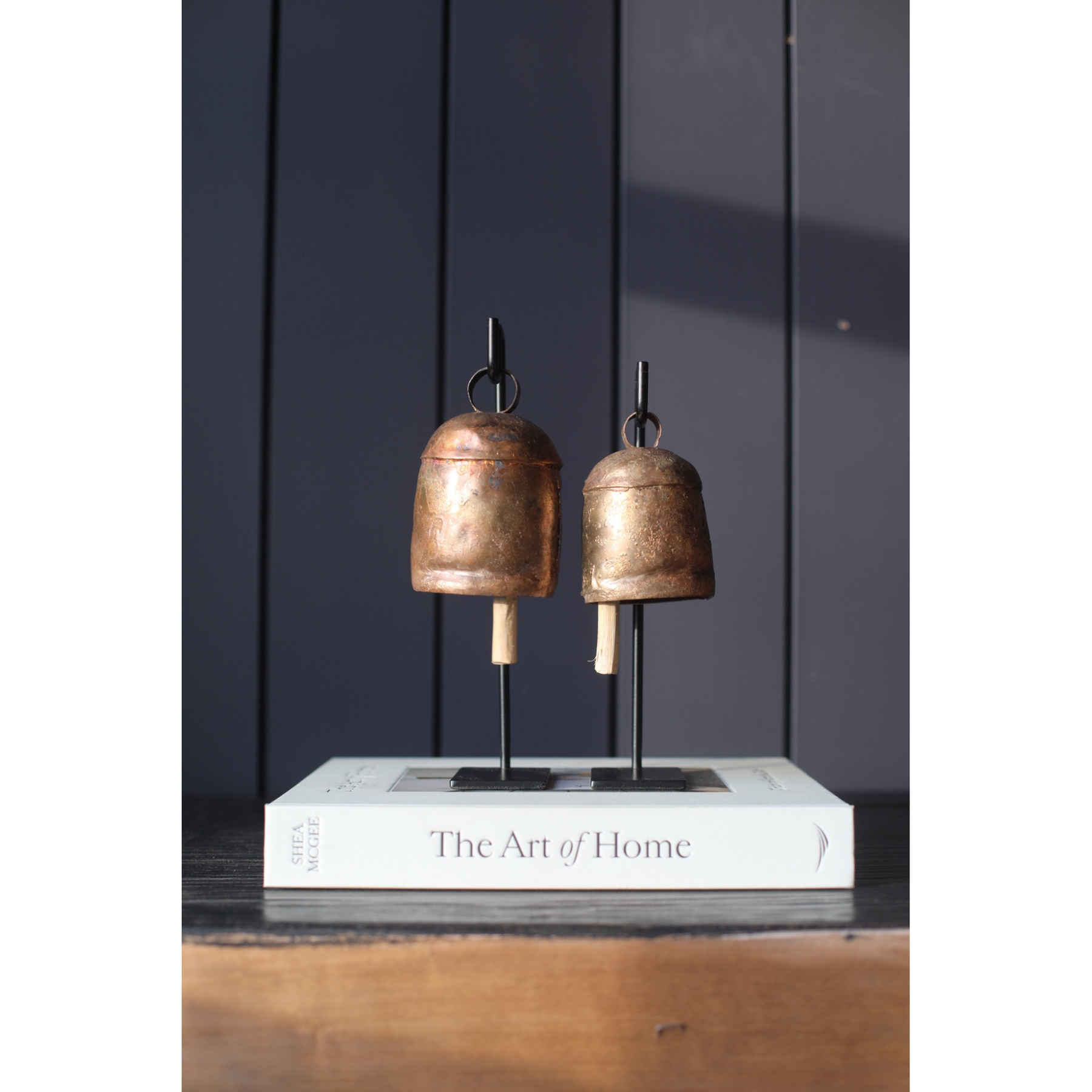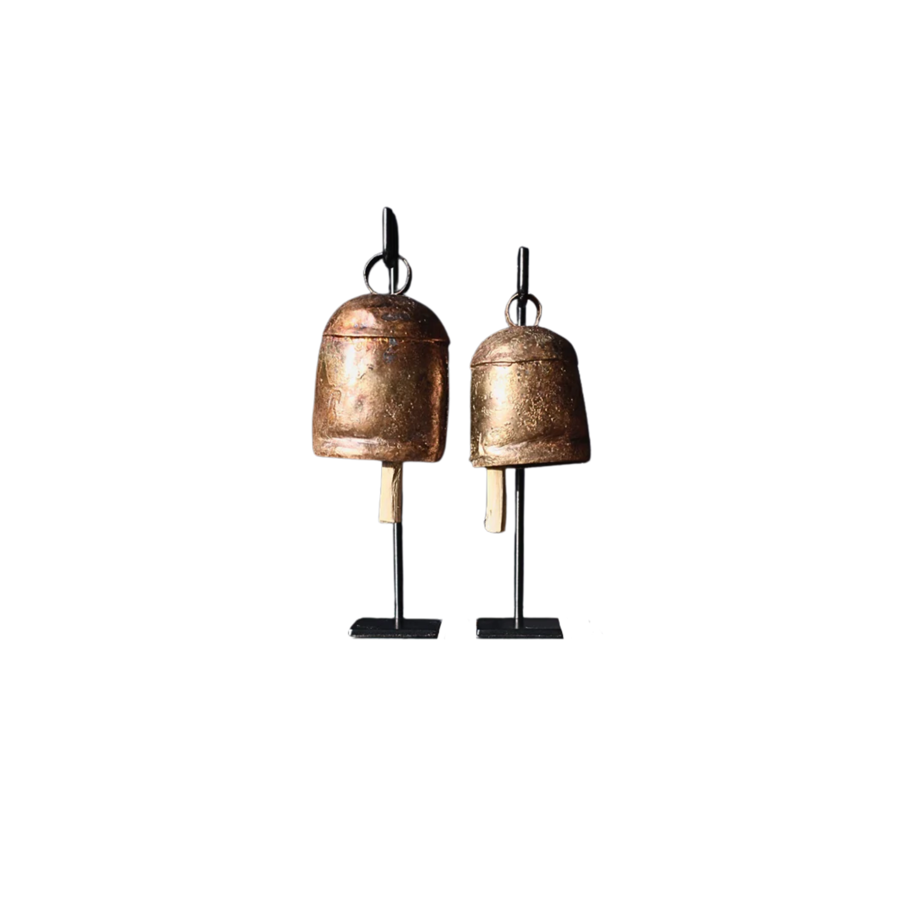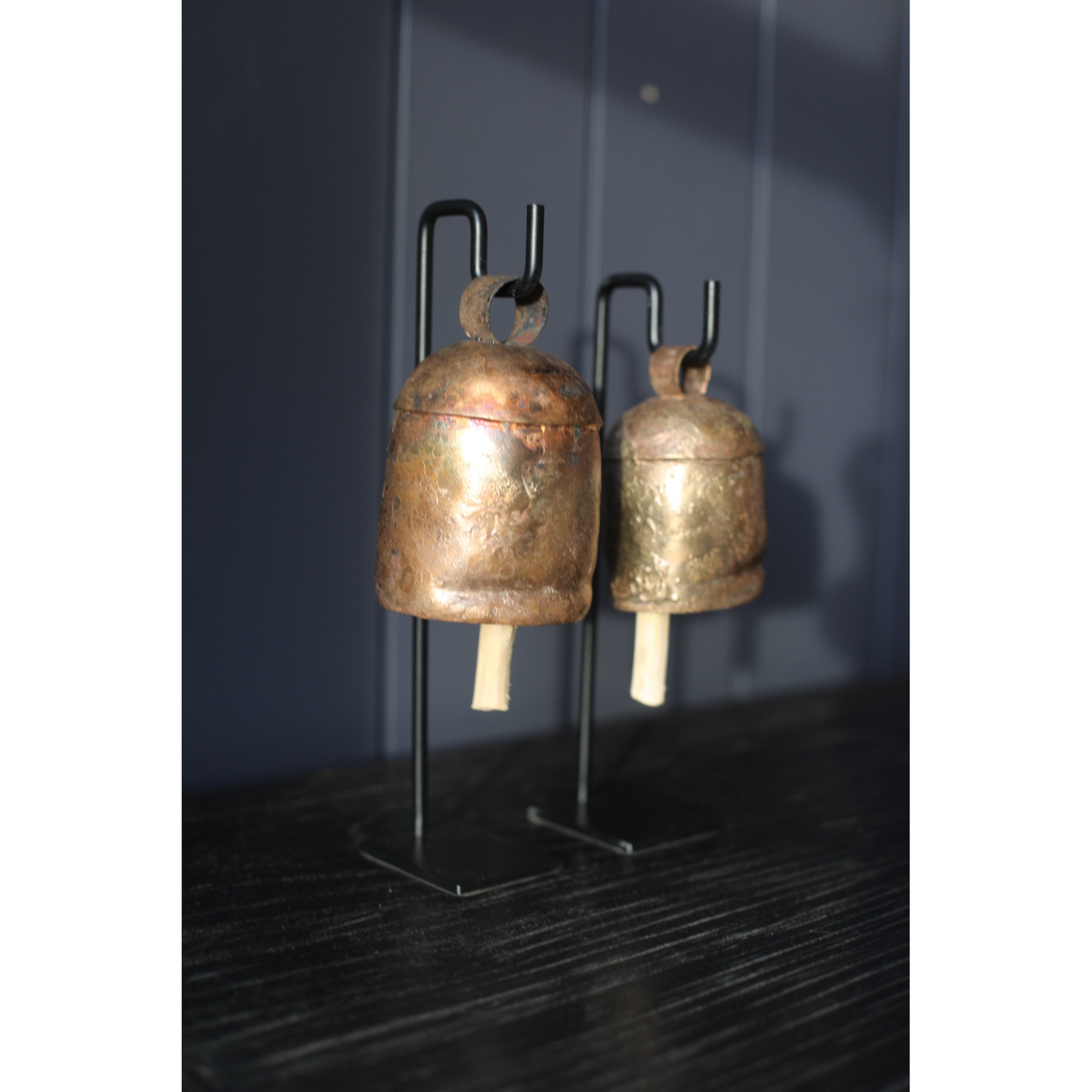 A vintage bell stand, showcasing welded hooks that form a distinctive and artistic arrangement. The bells themselves are handcrafted, exuding a charming vintage appeal. Due to the handcrafted nature, each bell has its own unique detailing. They can add a striking decorative touch to any living area.