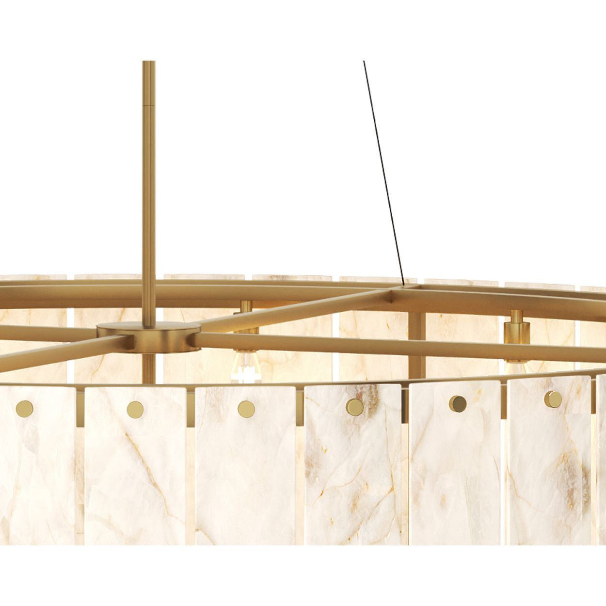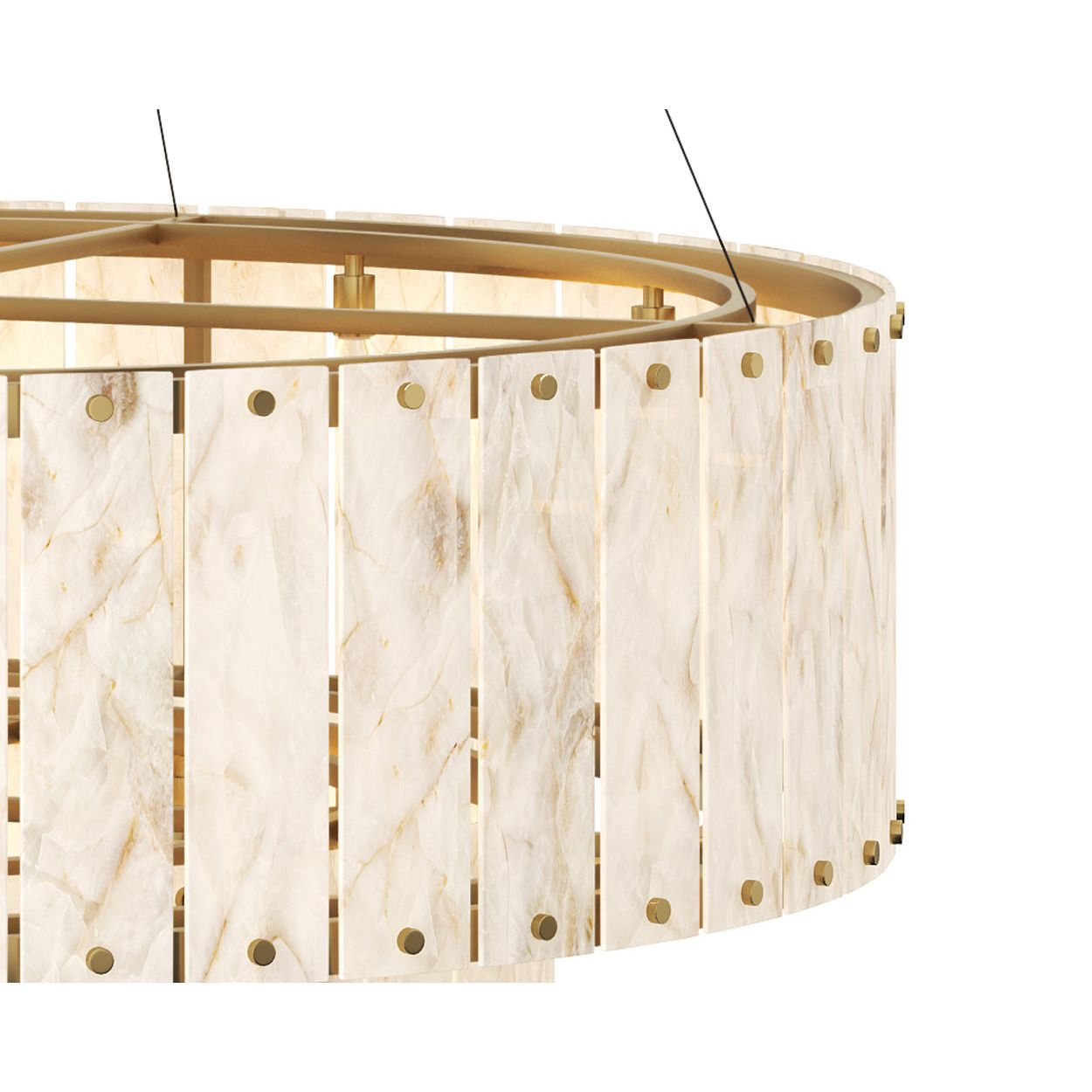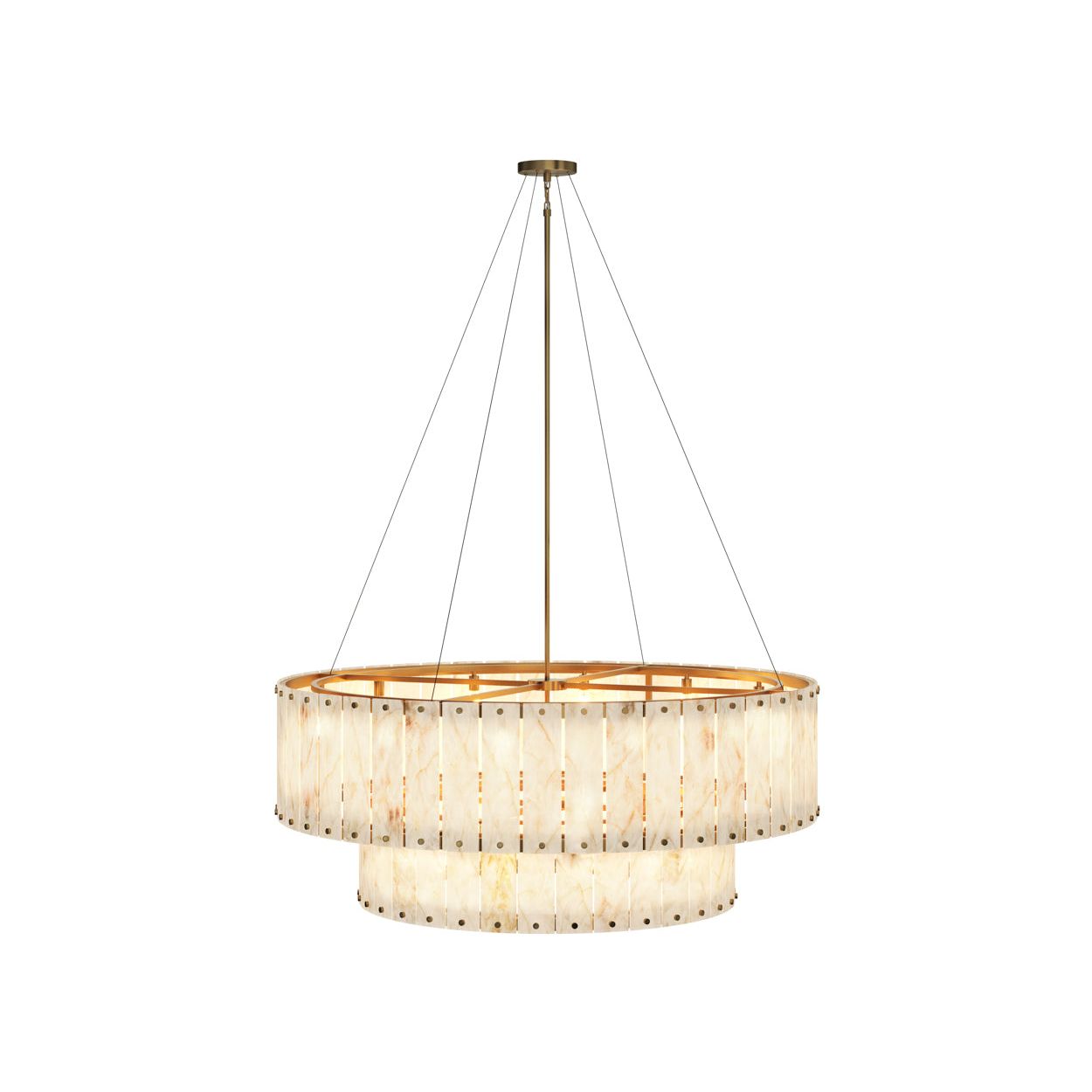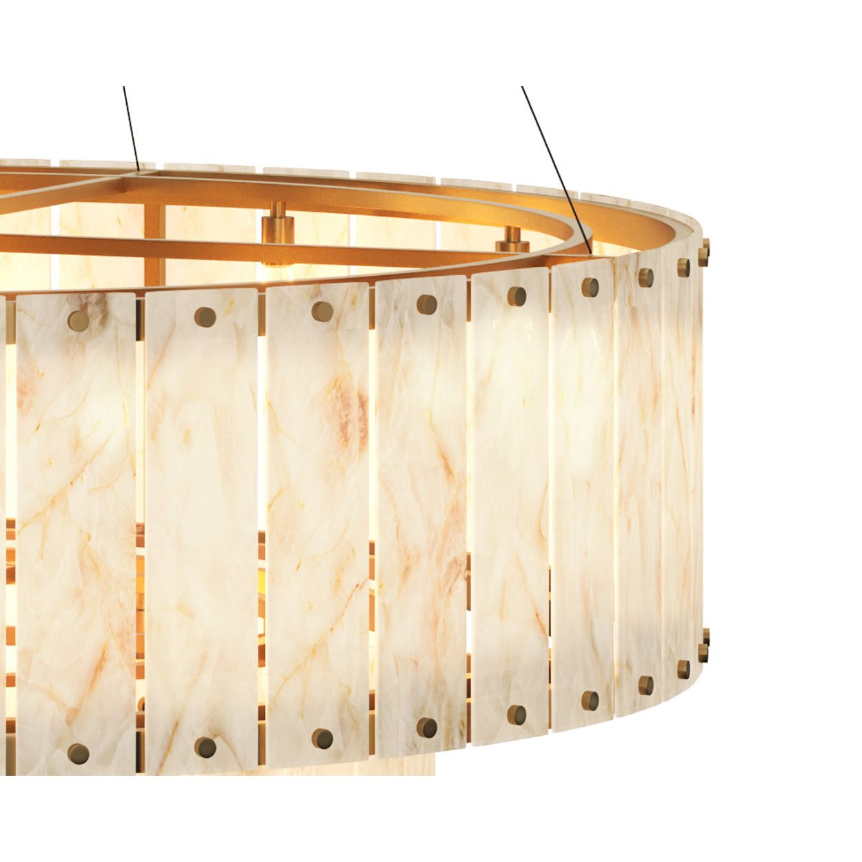 Striking and unforgettable, the Apsara Chandelier is a modern treasure that will make its presence felt in large spaces. This substantially-sized showpiece is masterfully crafted with two tiers of natural Spanish alabaster, prized for its translucency and soft cream colour. Each alabaster panel is sizeable and features unique veining that makes every chandelier one-of-a-kind.