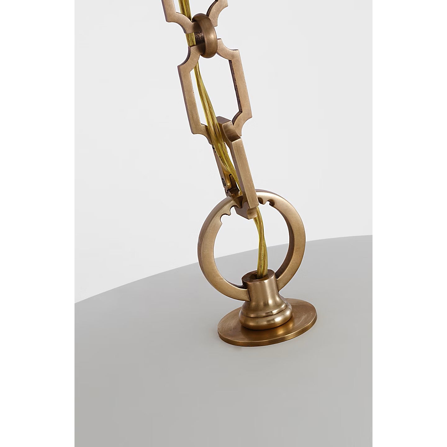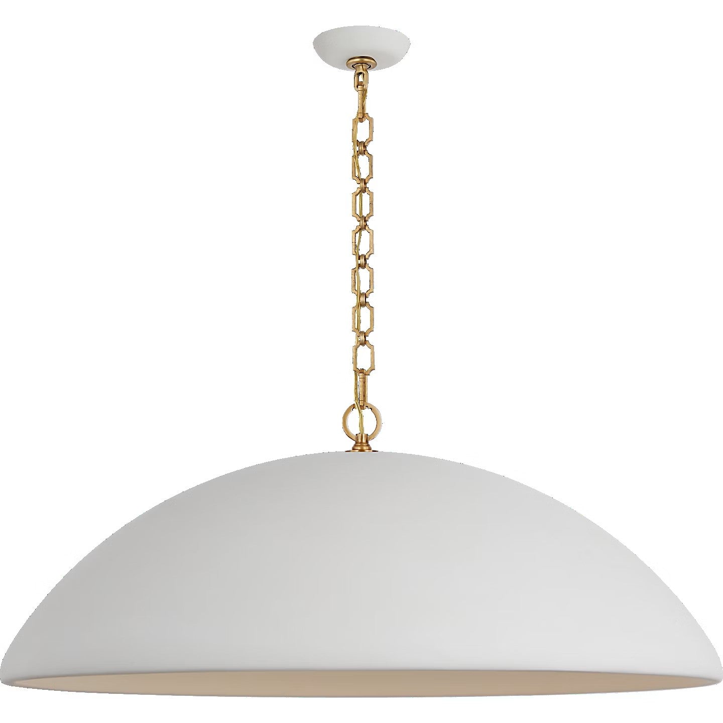 The sculptural Elliot by Suzanne Kasler presents a rugged-yet-refined silhouette in lightweight concrete. The unexpected material's smooth, inverted dome hangs from a slender chain and casts a light that's ideal over kitchen islands or dining room tables.