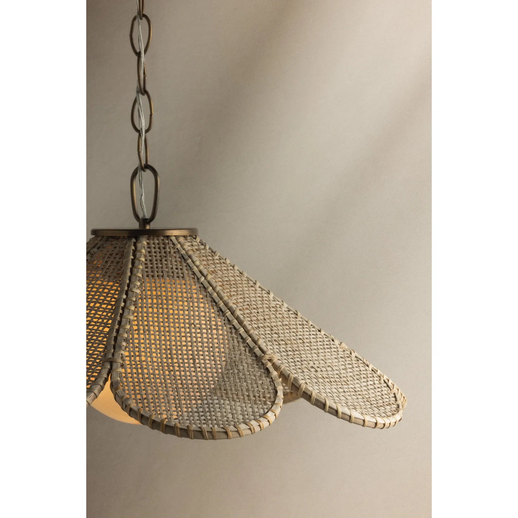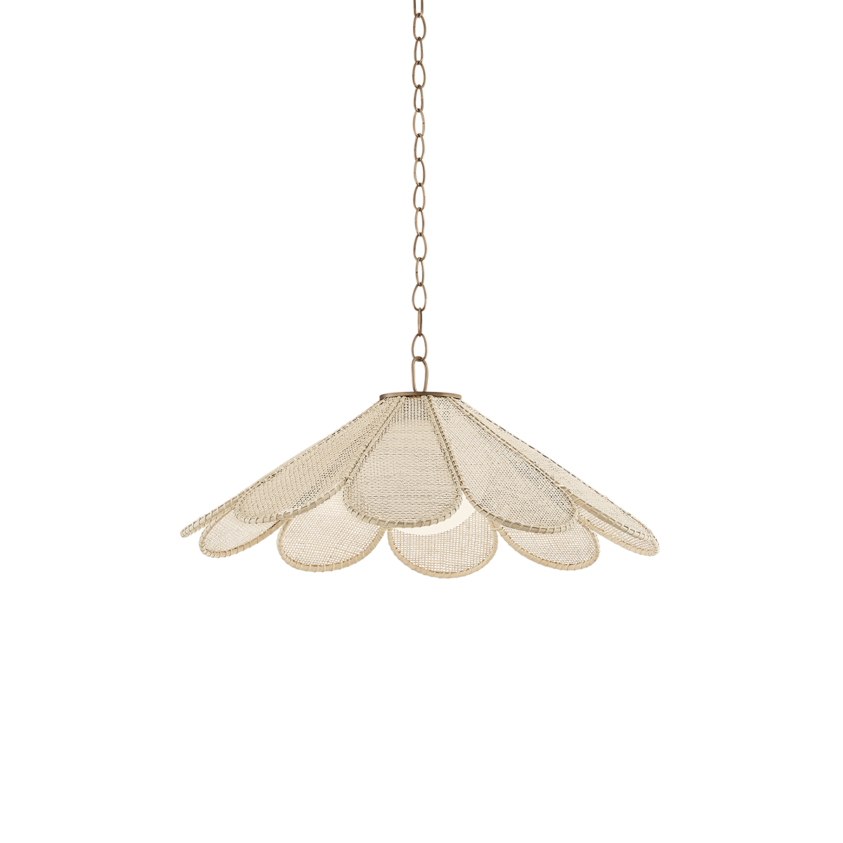 A nod to nature’s quiet beauty, Petal features handwoven rattan cane shaped into delicate “petals” that surround a shiny opal glass globe. The organic silhouette—both rustic and refined—is suspended by a bold loop and chain in Patina Brass (PBR). Available in two sizes, it’s a charming addition above a kitchen island or breakfast nook.