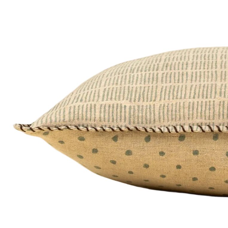 Add a touch of whimsy to your space with the Dash & Dot Linen Pillow. This modern decorative pillow is hand block printed on 100% Belgian linen, featuring a dash pattern on one side and polka dots on the other, both in a soft blue on a natural linen background. Finished with dark brown blanket stitching, it’s a thoughtful nod to traditional craftsmanship and ethical sourcing.
